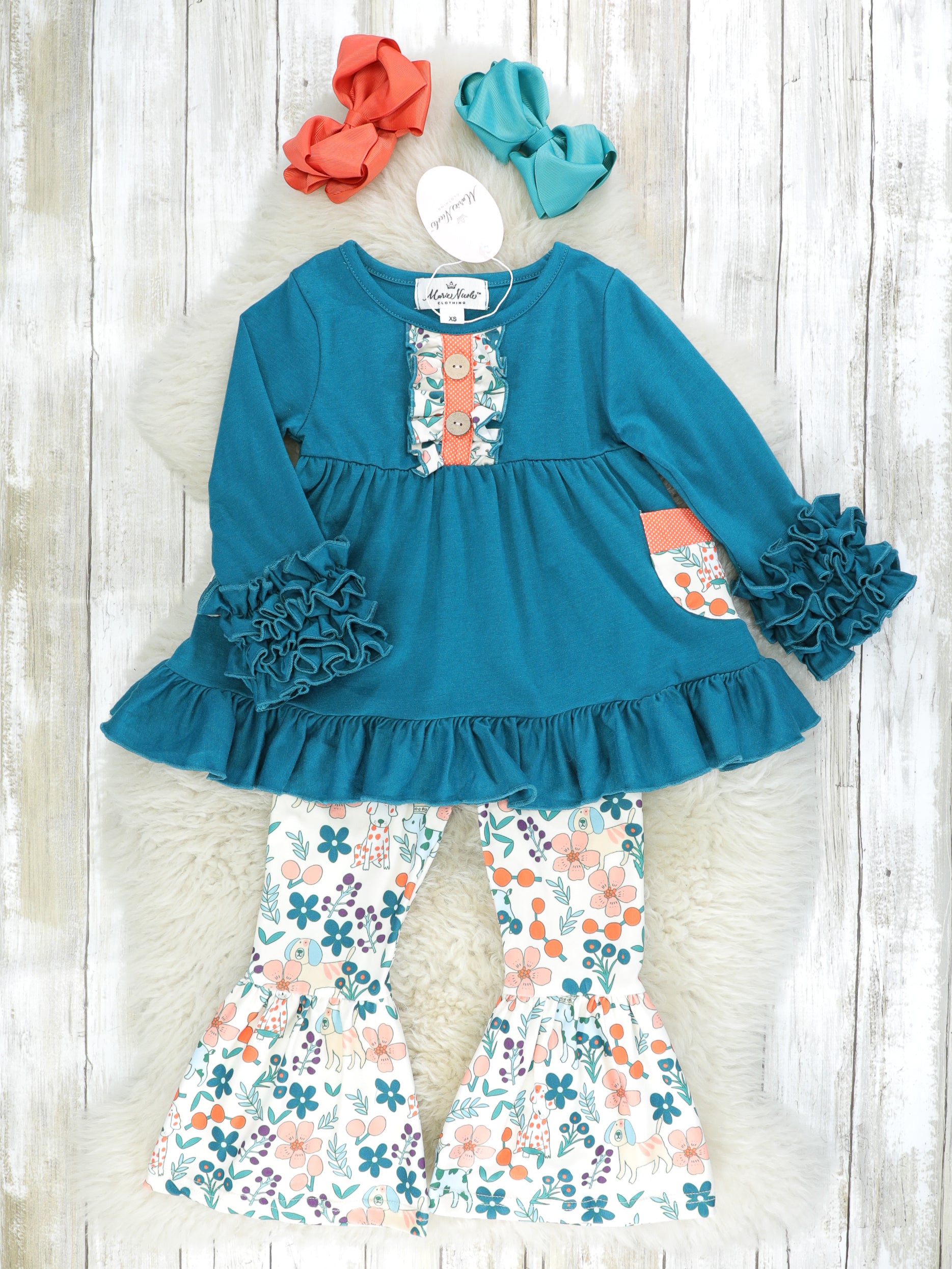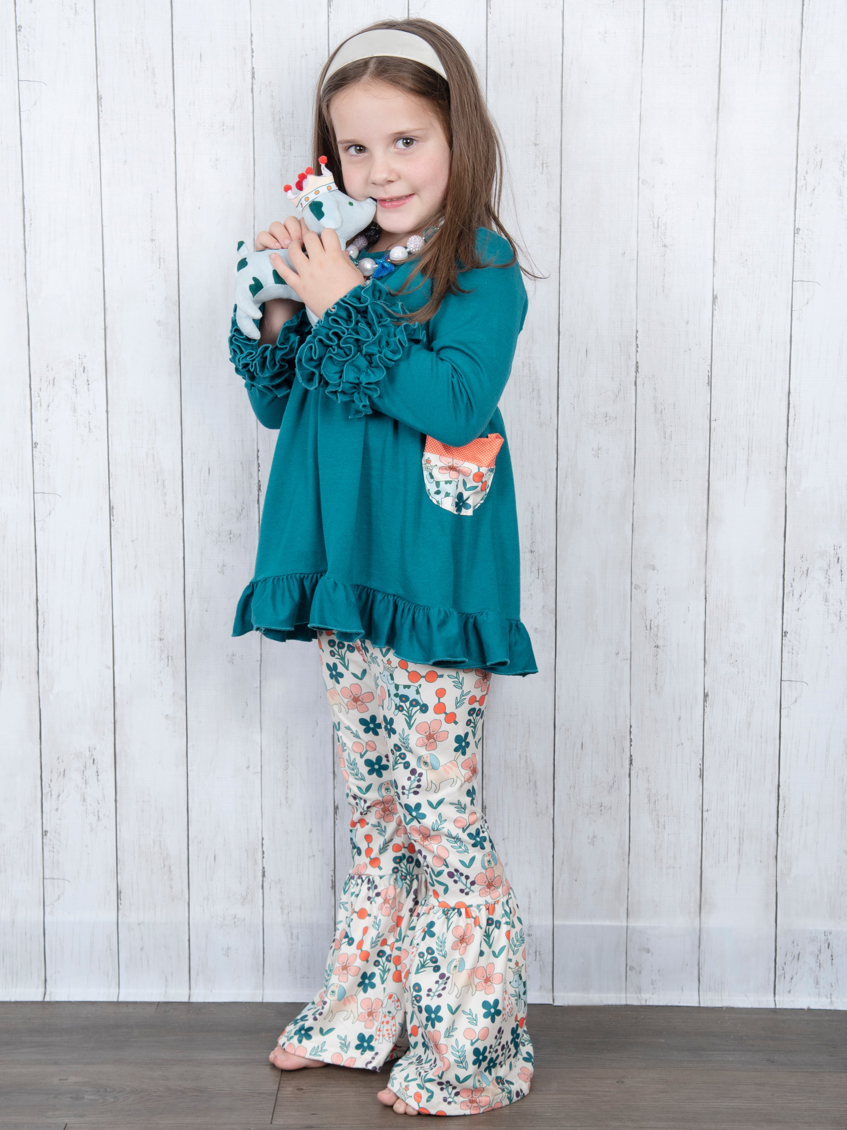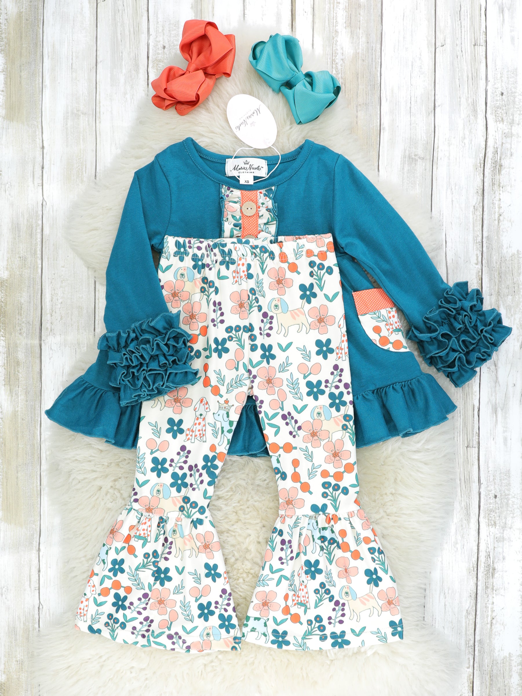 This outfit features icing ruffles, a beautiful floral pup mix pattern, ruffle details, decorative buttons, & bell bottoms with an elastic waistband for easy changing.