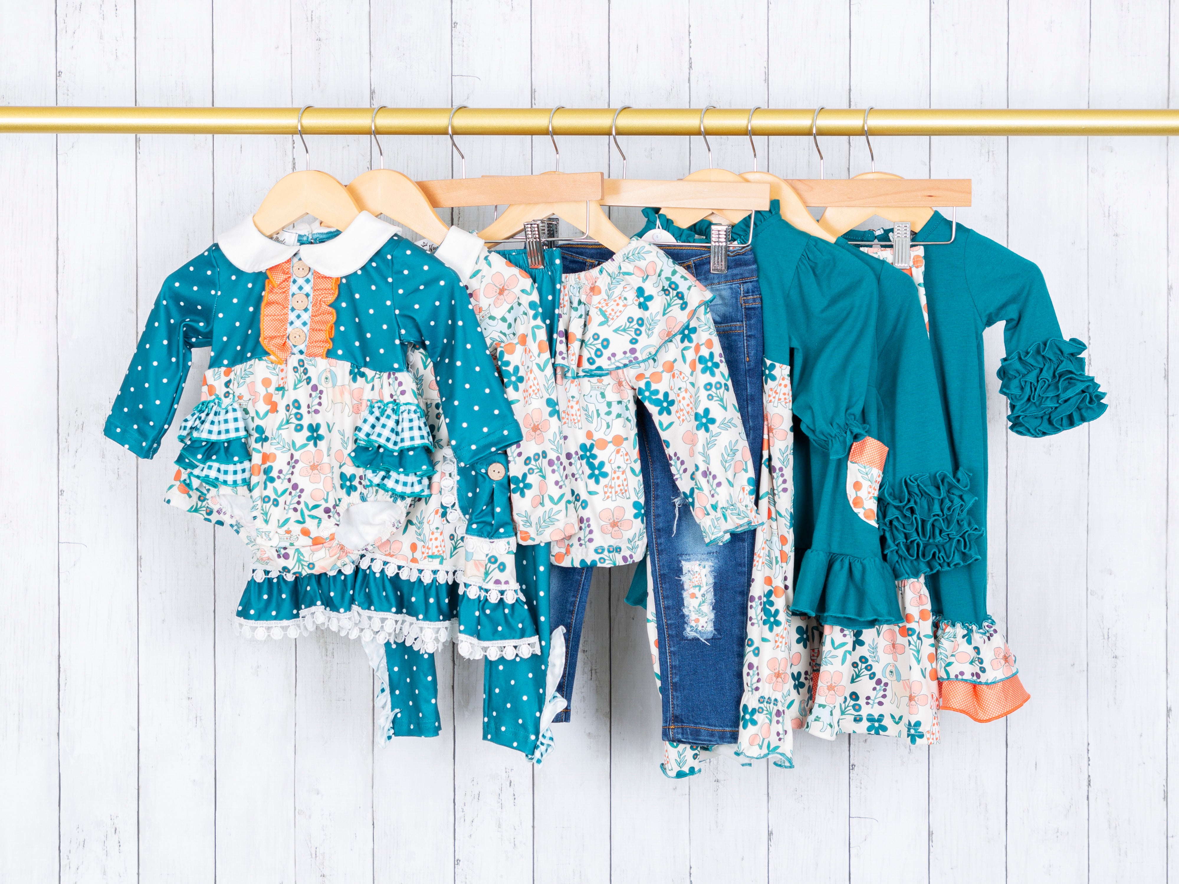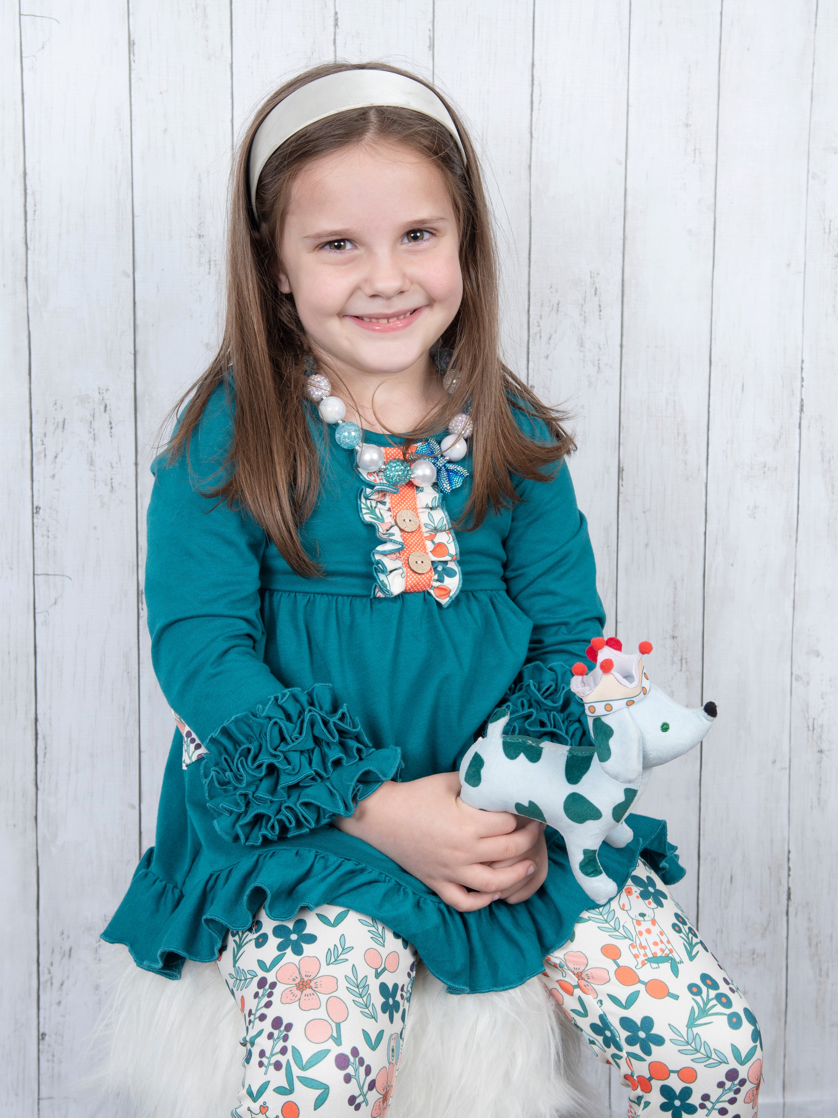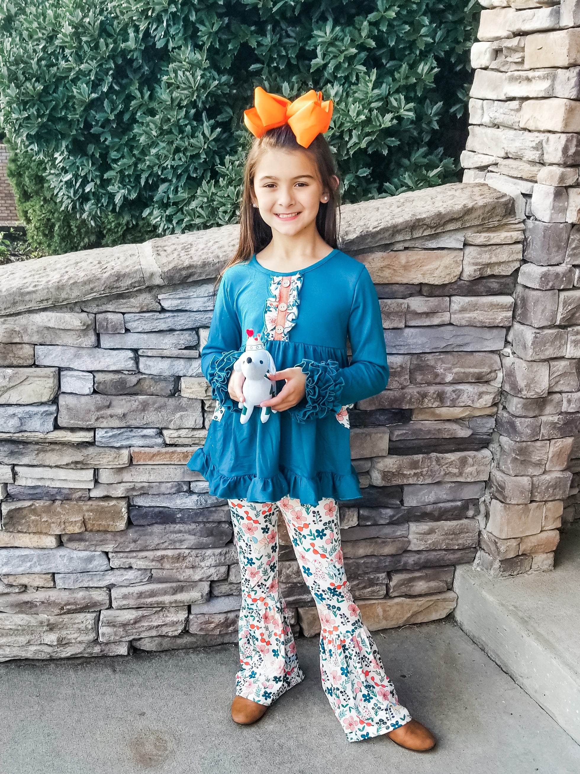 This outfit features icing ruffles, a beautiful floral pup mix pattern, ruffle details, decorative buttons, & bell bottoms with an elastic waistband for easy changing.