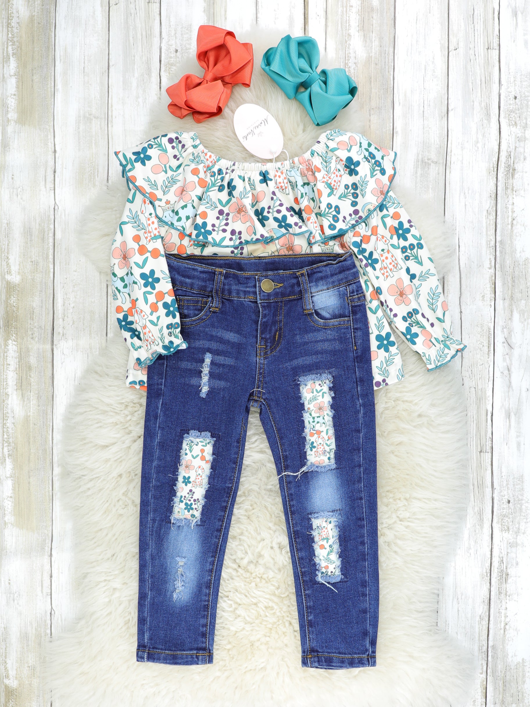 This denim outfit from our exclusive MNC Collection features The Royal Pups Eloise, Brooks, and Duke. It has a beautiful floral pup mix pattern, a round ruffle neckline, matching denim patches, & adjustable elastic for easy changing.