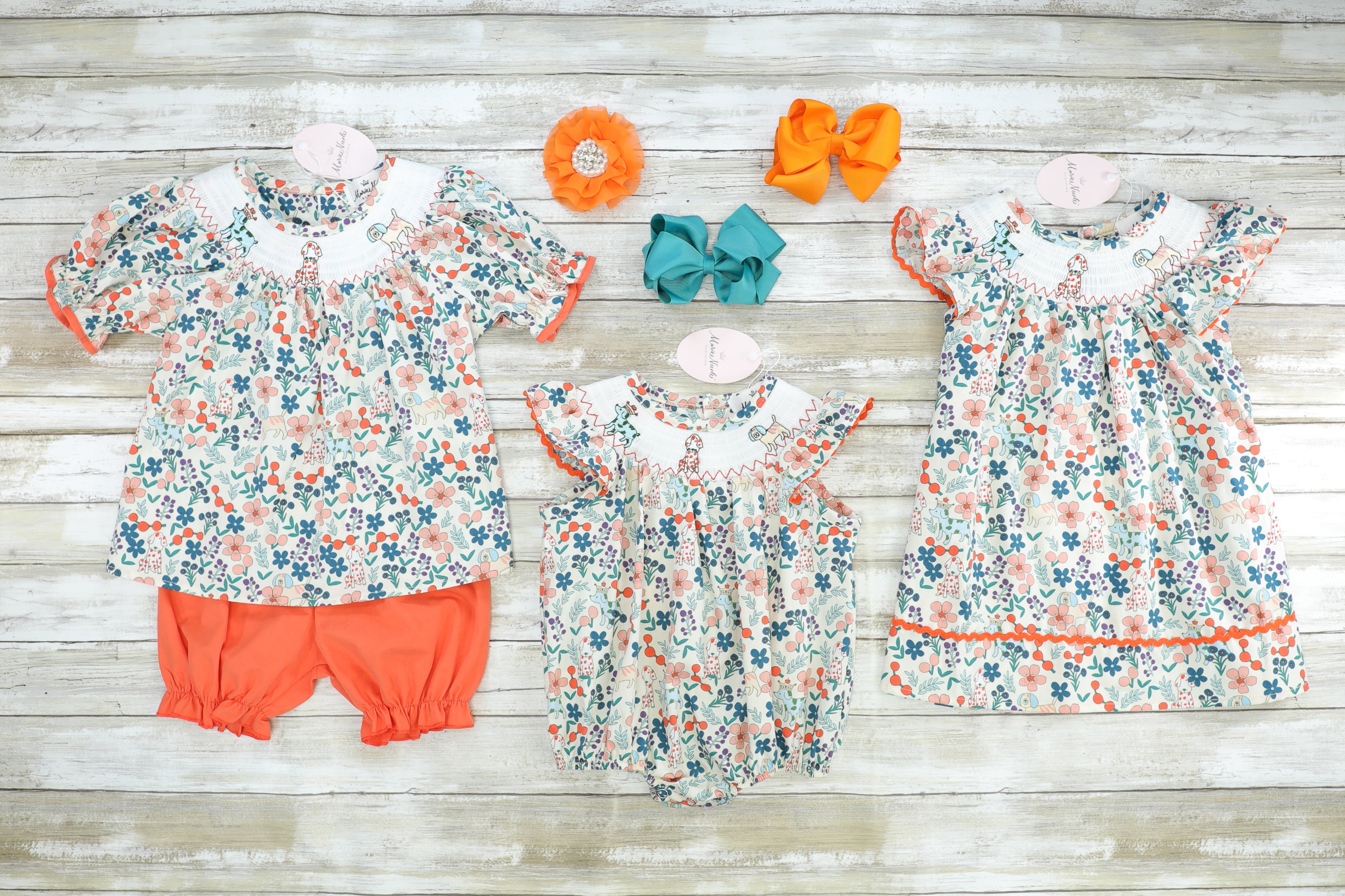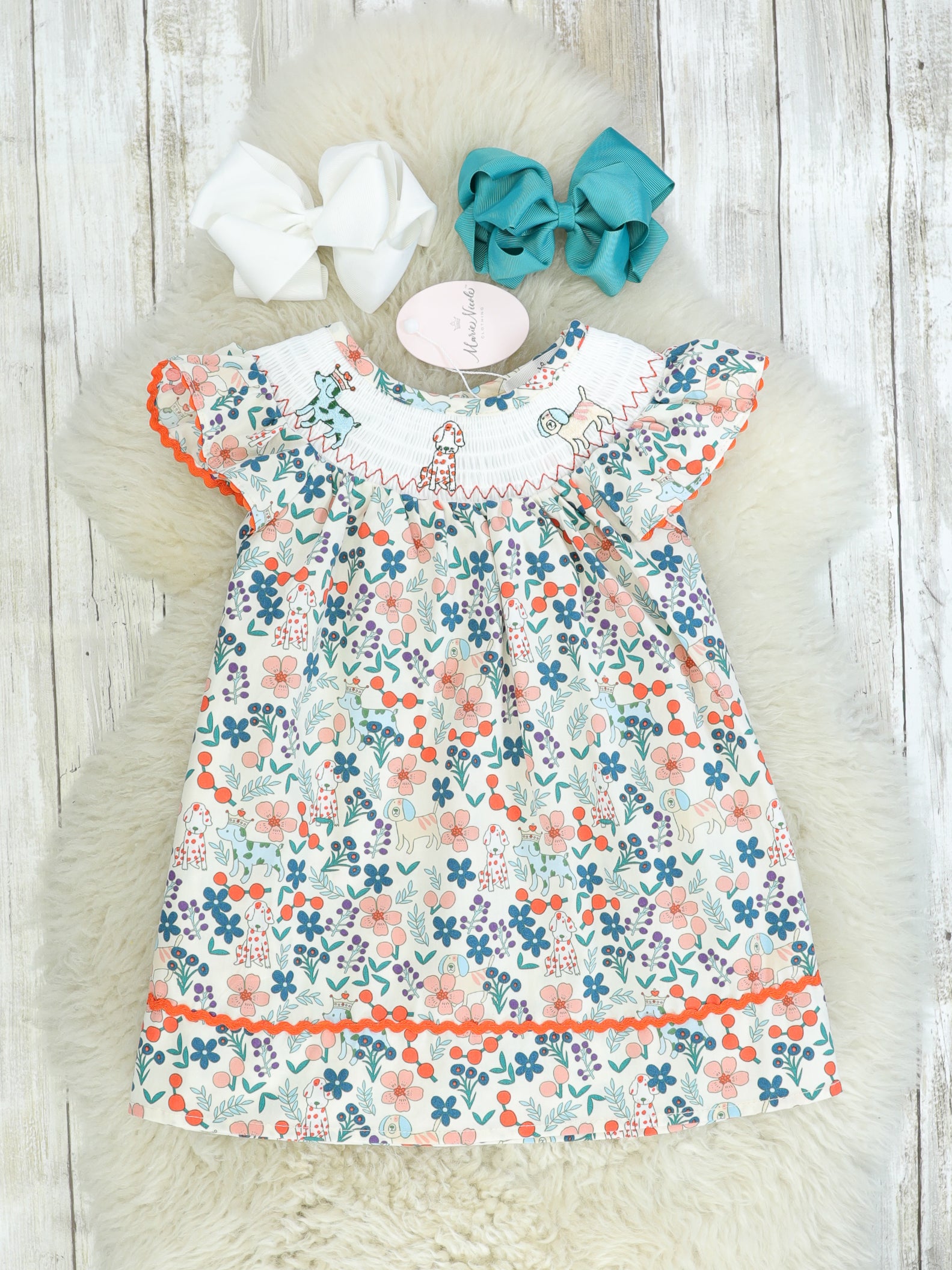 The sweetest smocked sister set this season! This smocked dress from our exclusive MNC Collection features The Royal Pups Eloise, Brooks, and Duke. It has a beautiful floral pup mix pattern, a smocked neckline, delicate trim detail, and a back button closure for easy on and off.