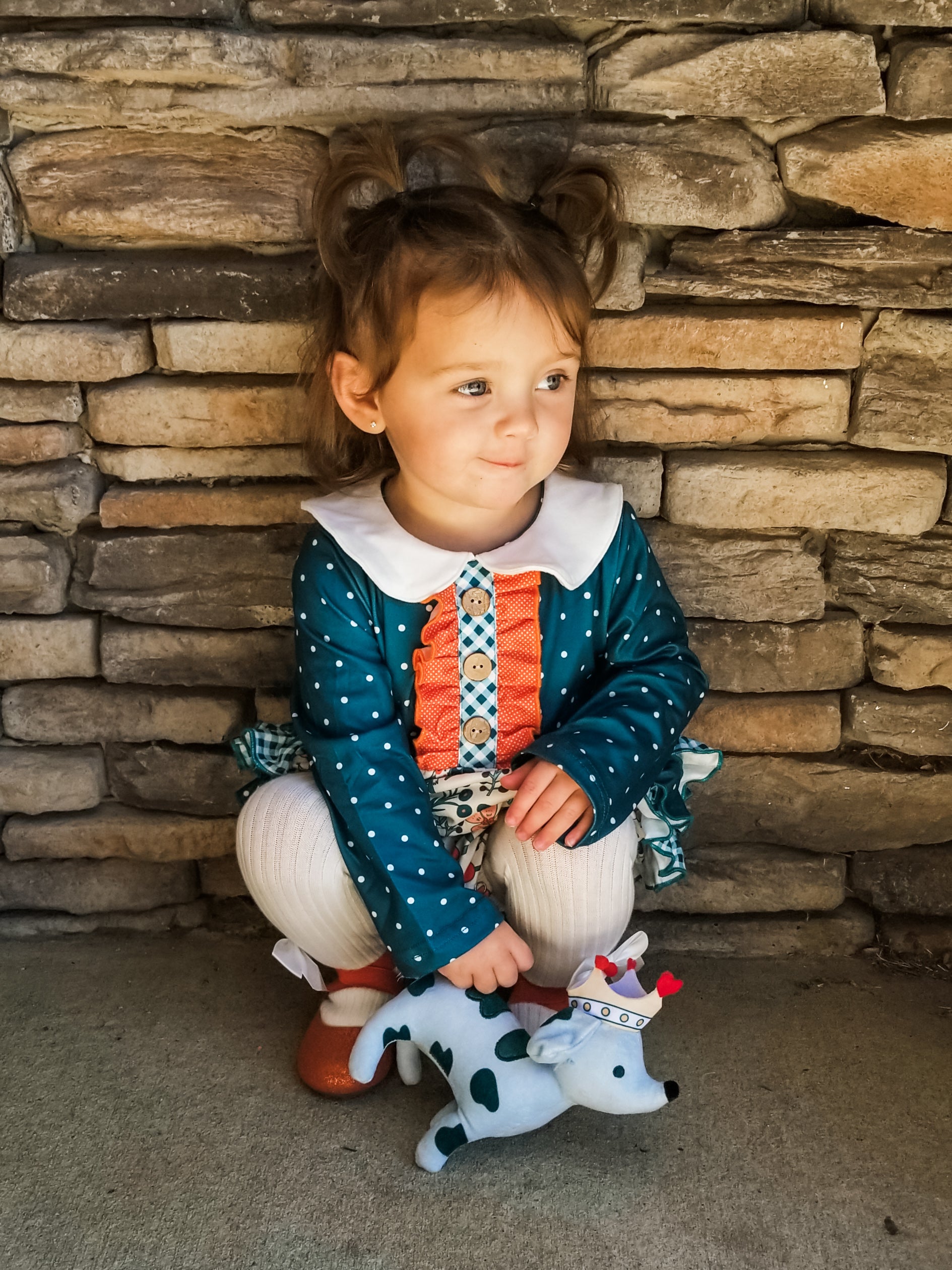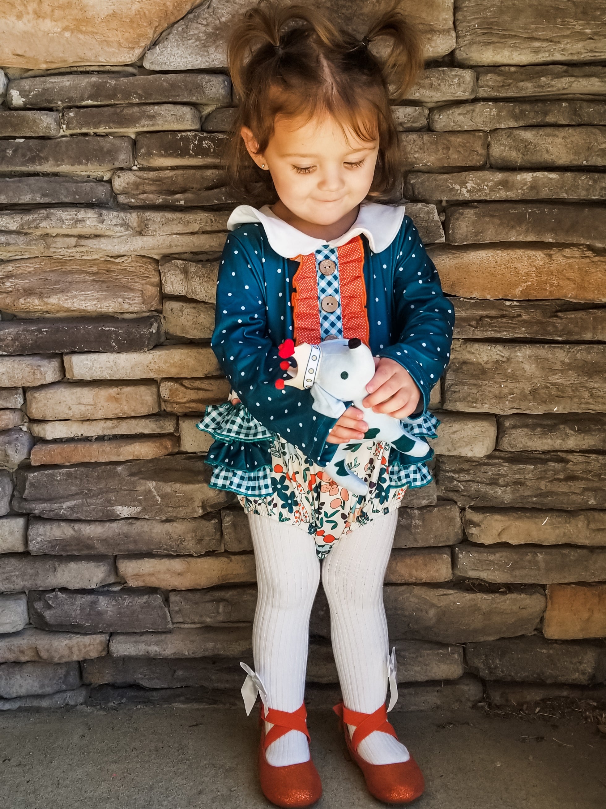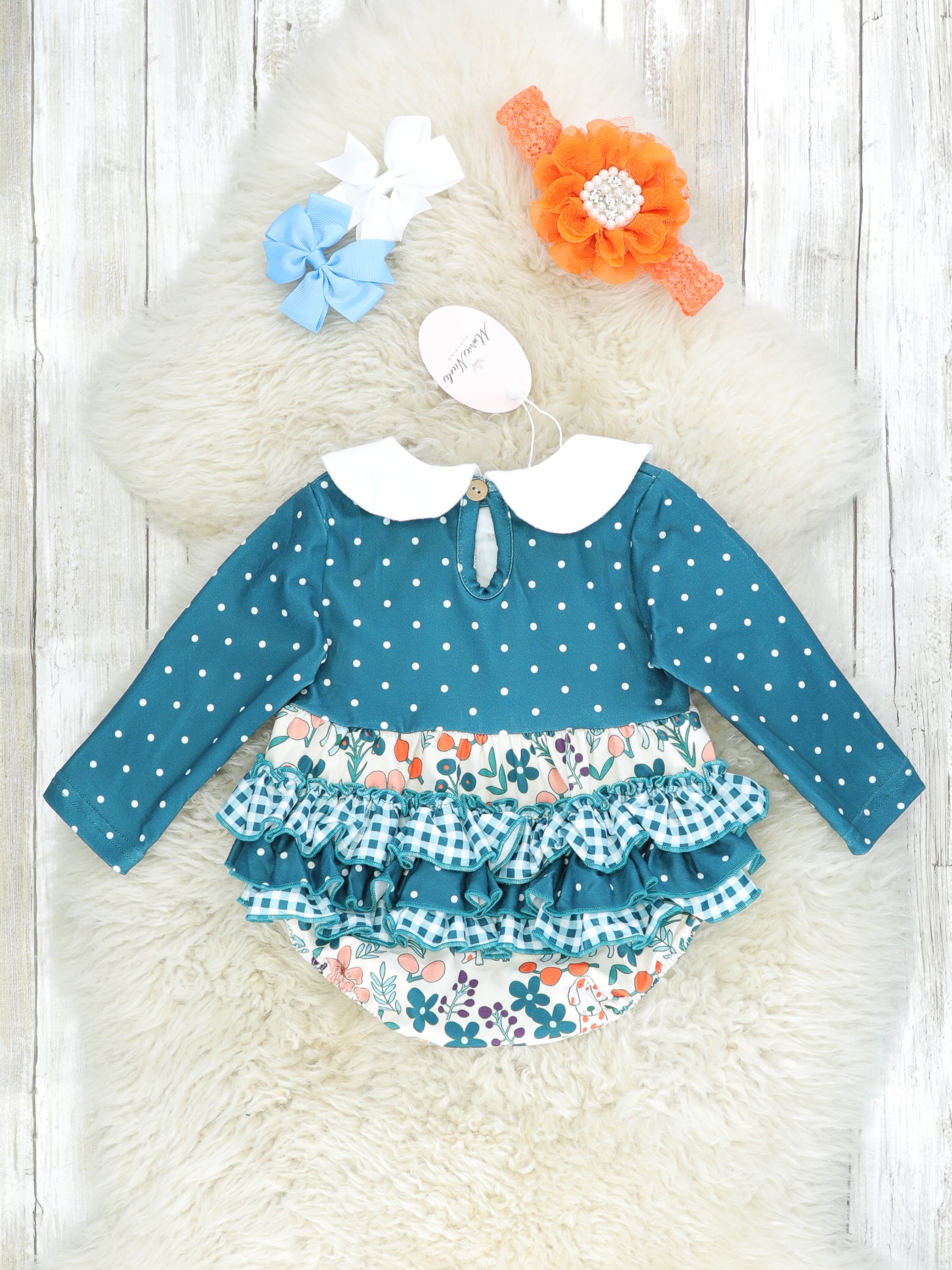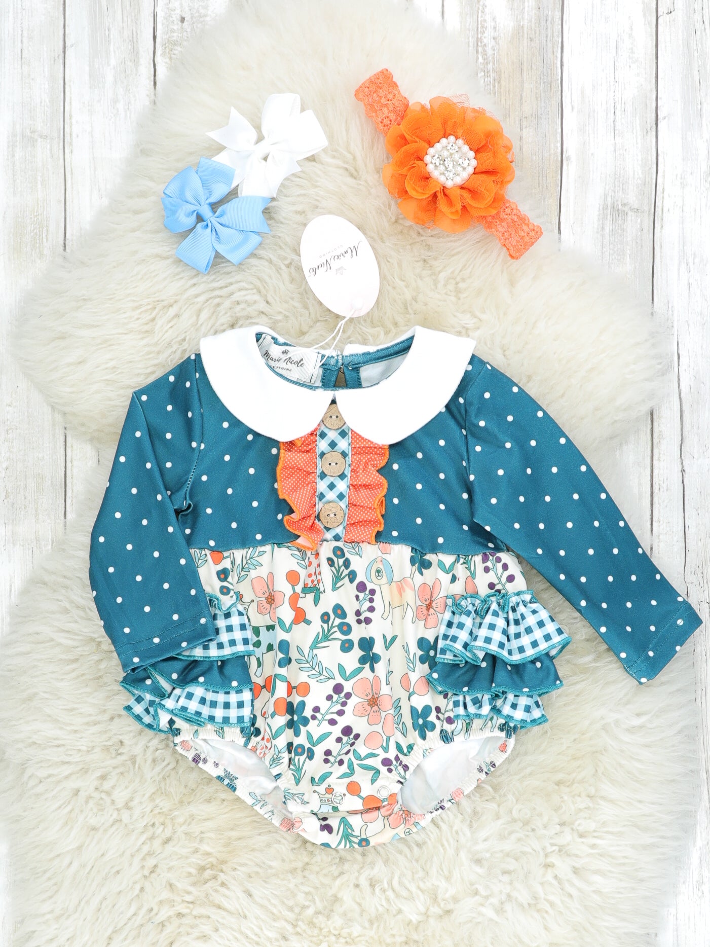 This vintage bubble romper from our exclusive MNC Collection features The Royal Pups Eloise, Brooks, and Duke. It has a beautiful floral pup mix pattern, a peter pan collar, delicate trim detail, decorative buttons, a ruffle butt, elastic leg openings and back button closure for easy on and off.