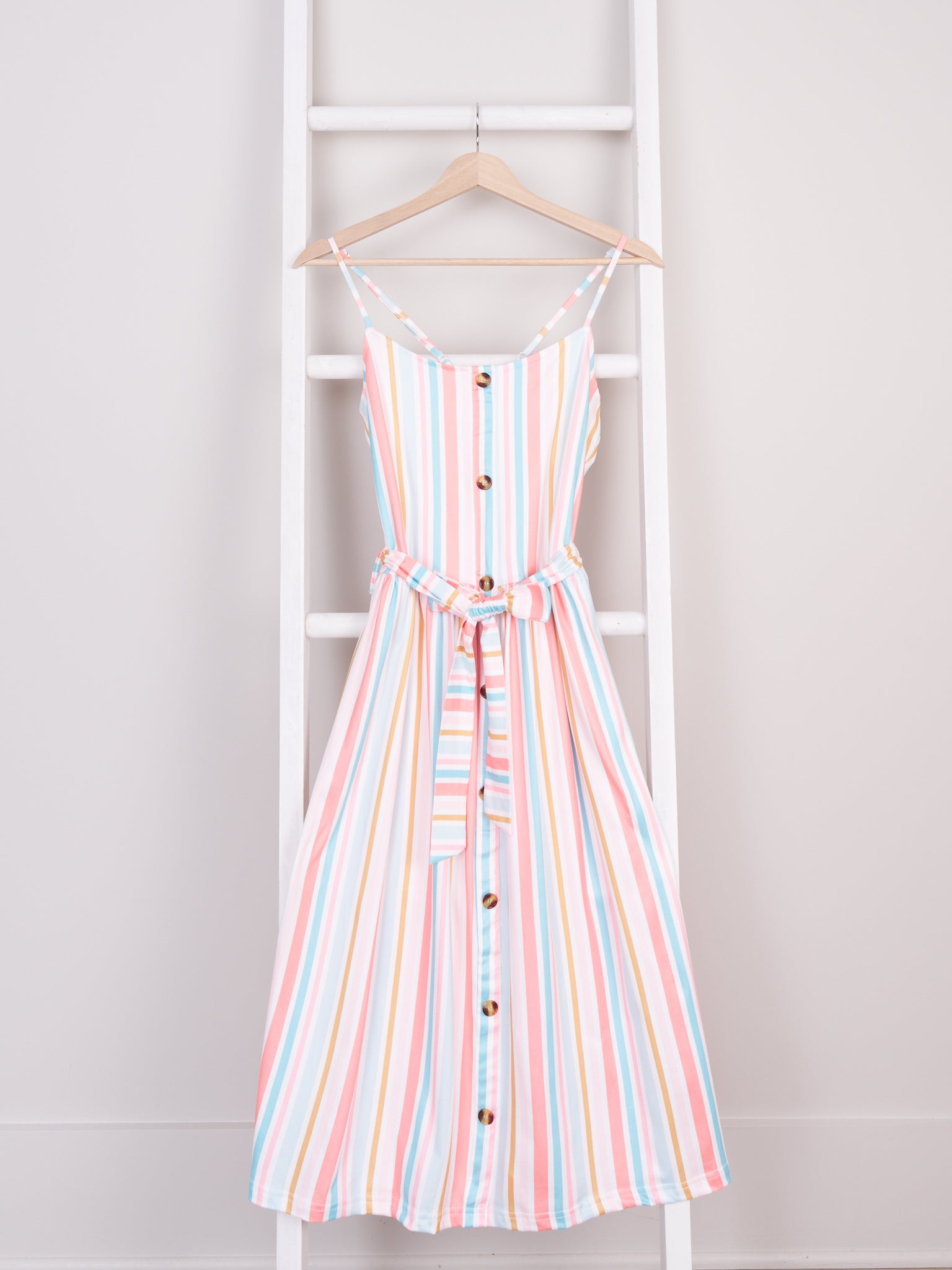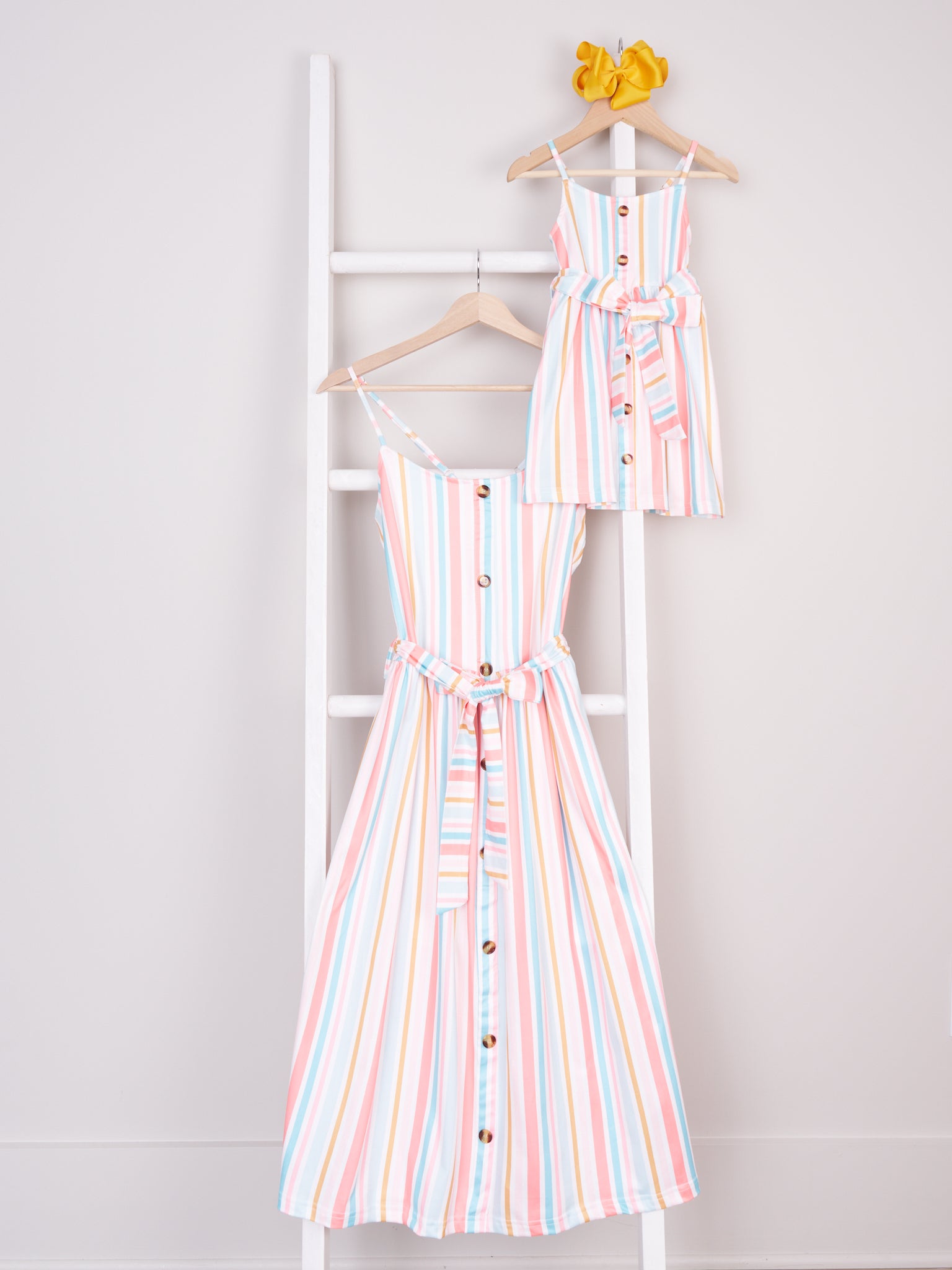 This Mom & Me Coral Striped Tank Dress is perfect for your next mother-daughter brunch, picnic, or pool party! Featuring a cute coral striped pattern and tie detail, this dress is guaranteed to be a hit!