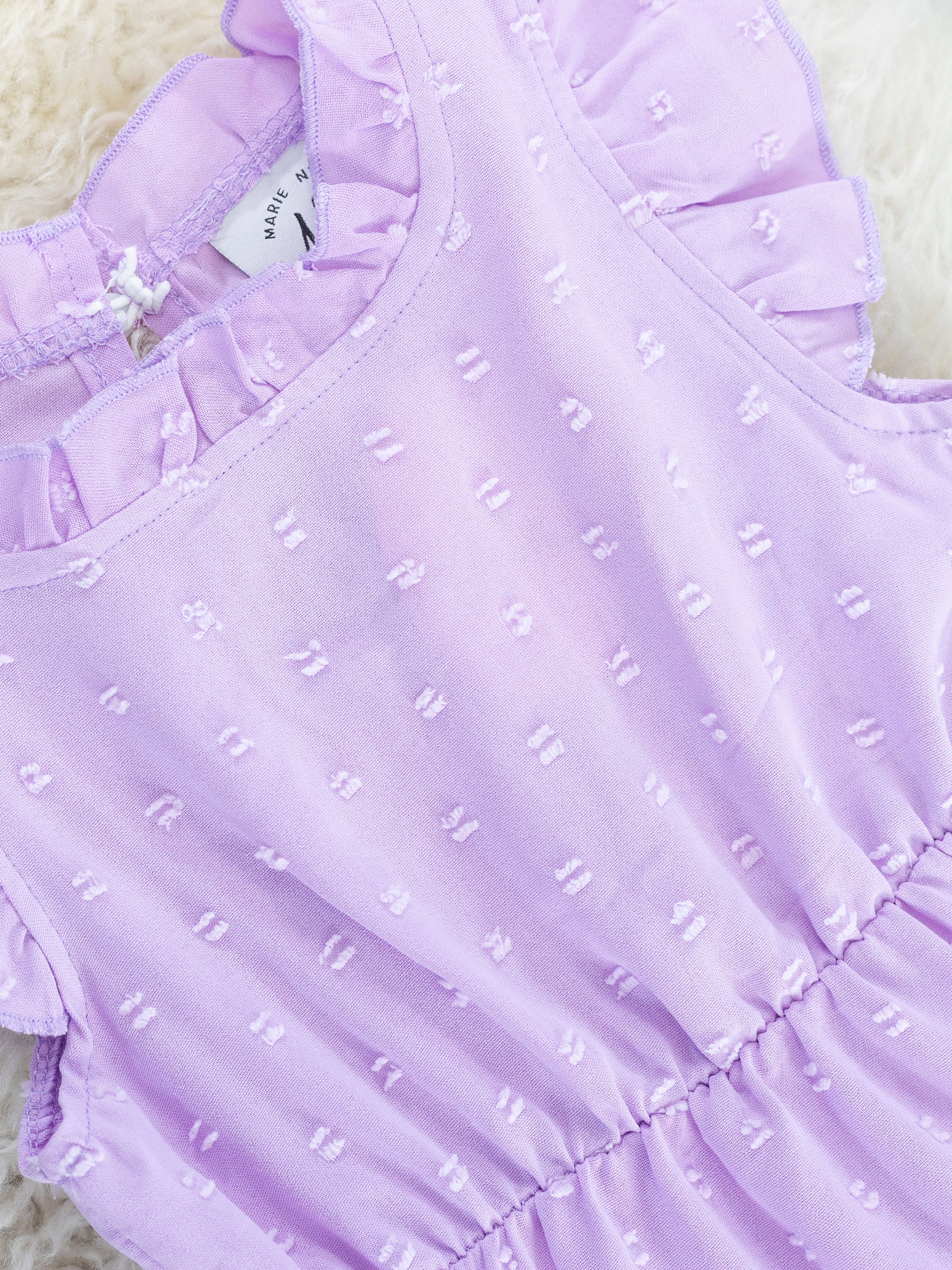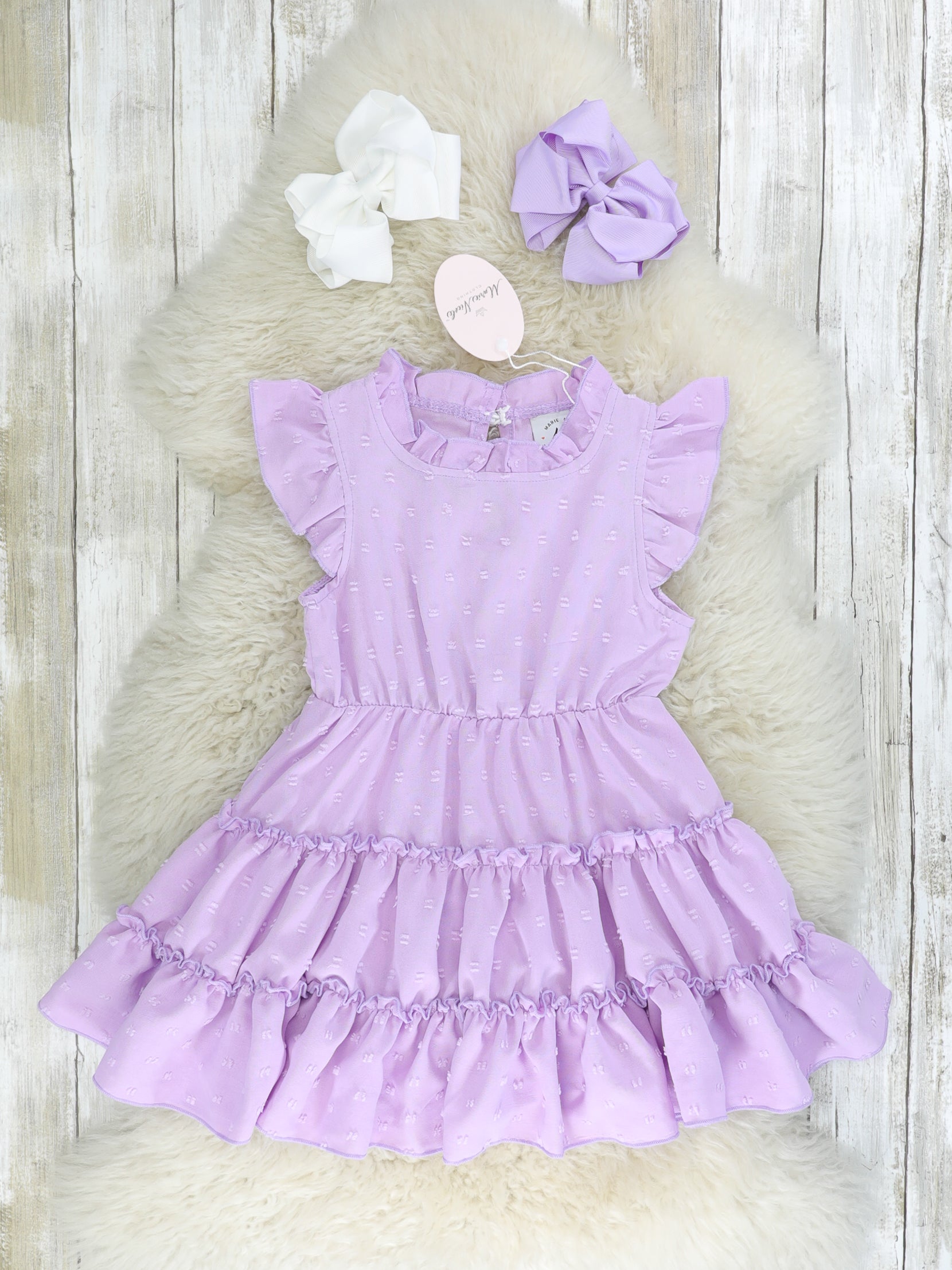 Match your mini in style this spring with these delightful dresses! These lavender dresses feature tiered layers, Swiss dot details, flutter sleeves, a ruffle mock neck, & a keyhole at the nape of the neck.