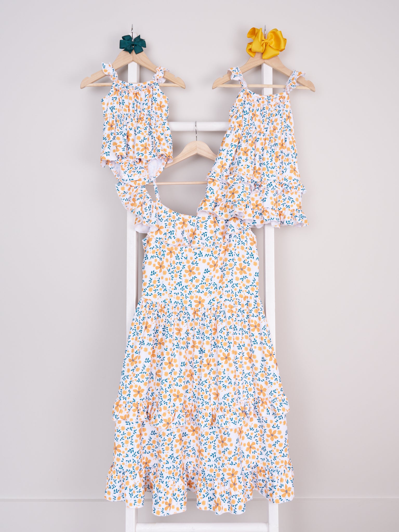 The Mom and Me set you've been waiting for! Perfect for tea parties and shopping days. These dresses have a yellow and green floral print, off-the-shoulder neckline with overlapping ruffle, elastic waist, and ruffle hem.