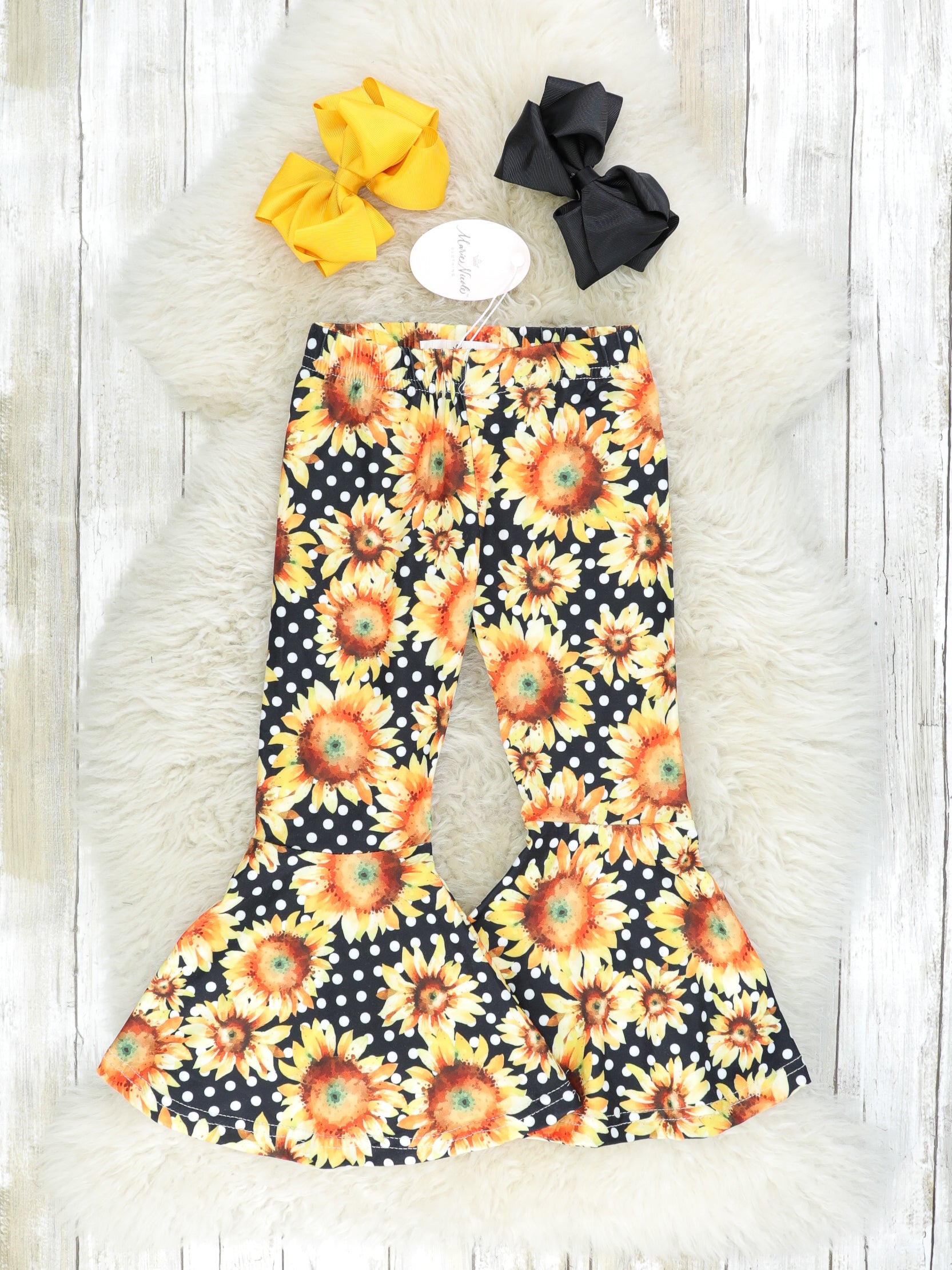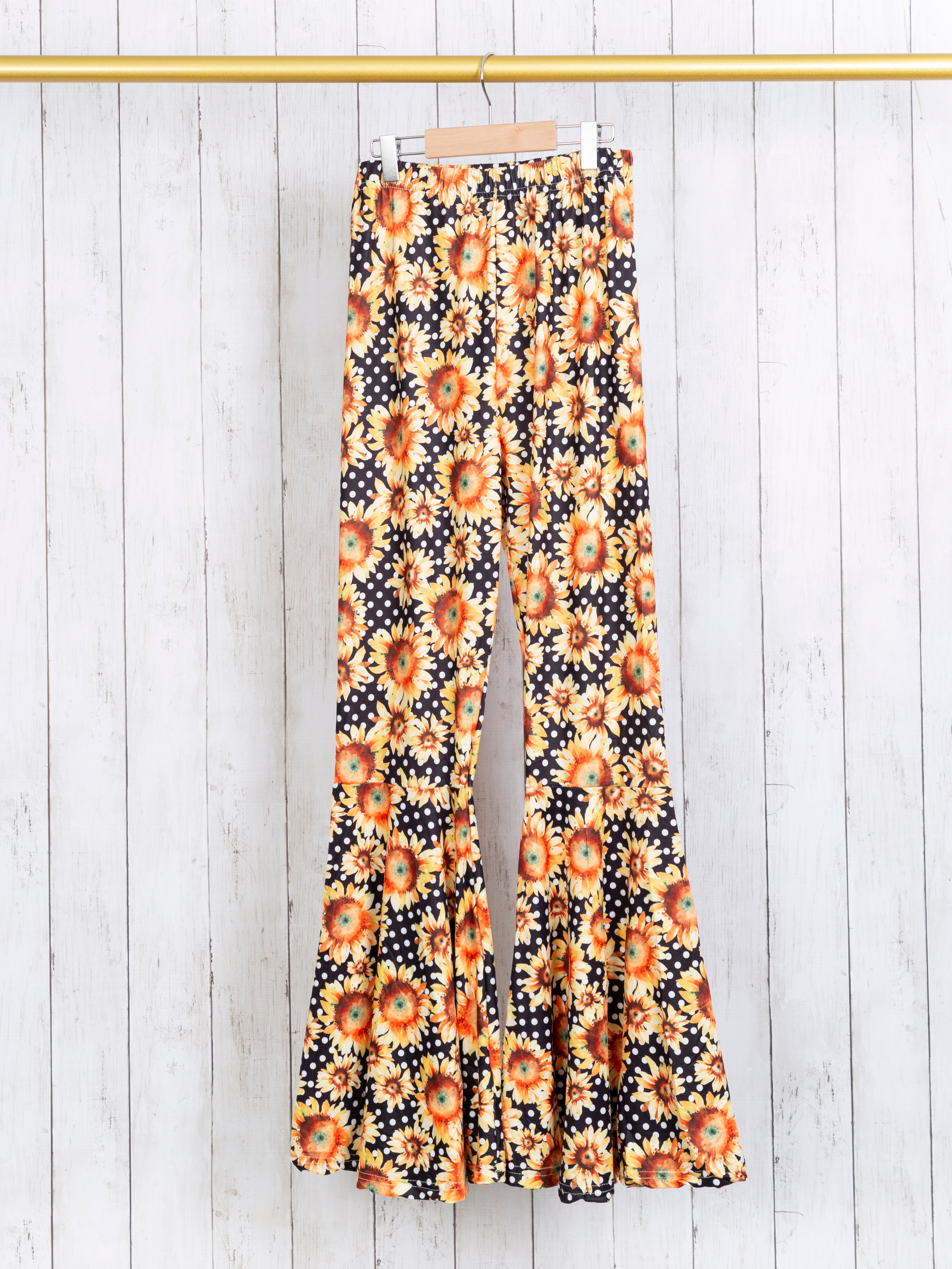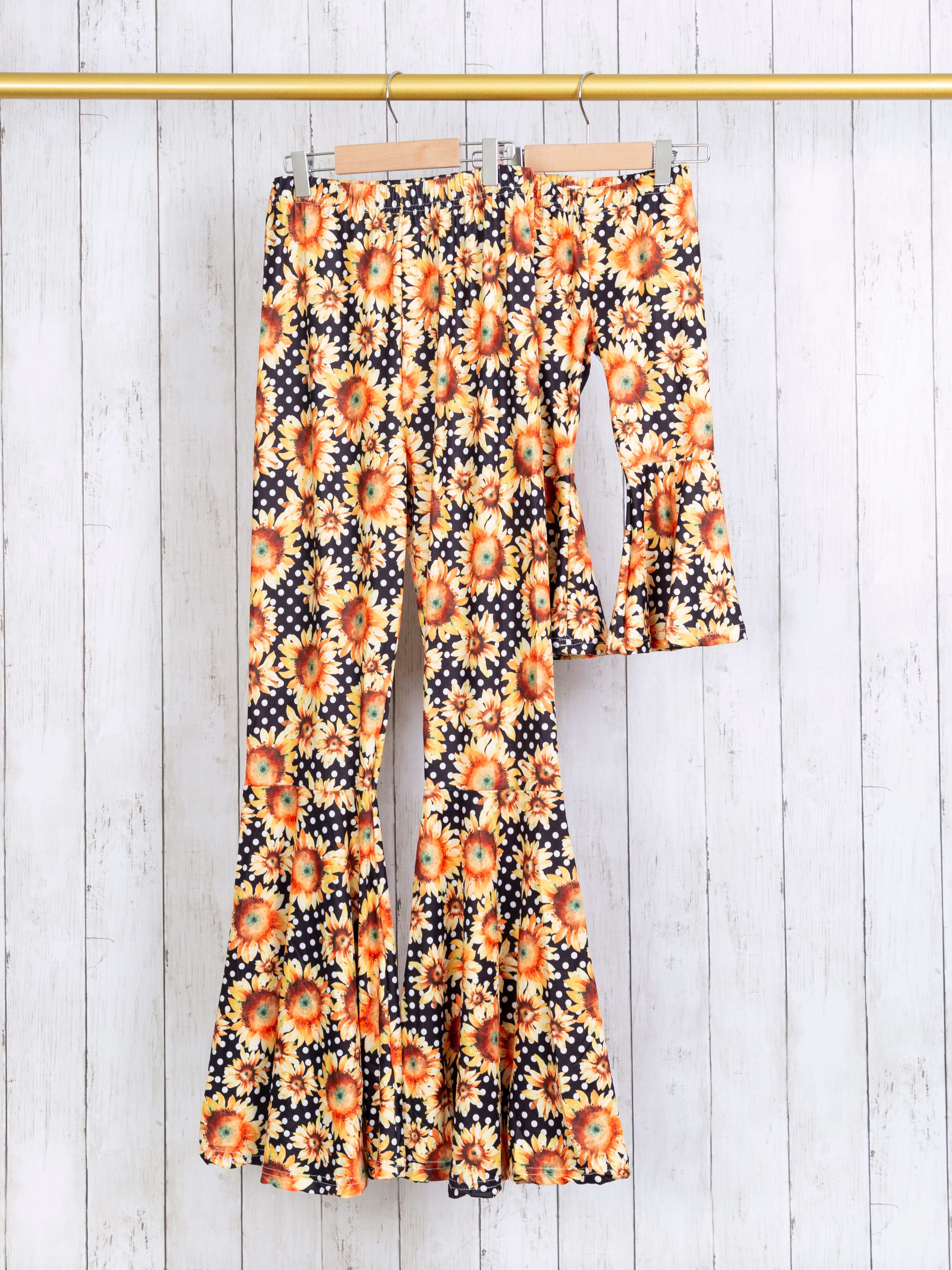 Matching bell bottoms? YES PLEASE! These navy polka dotted bell bottoms features a beautiful yellow floral design.