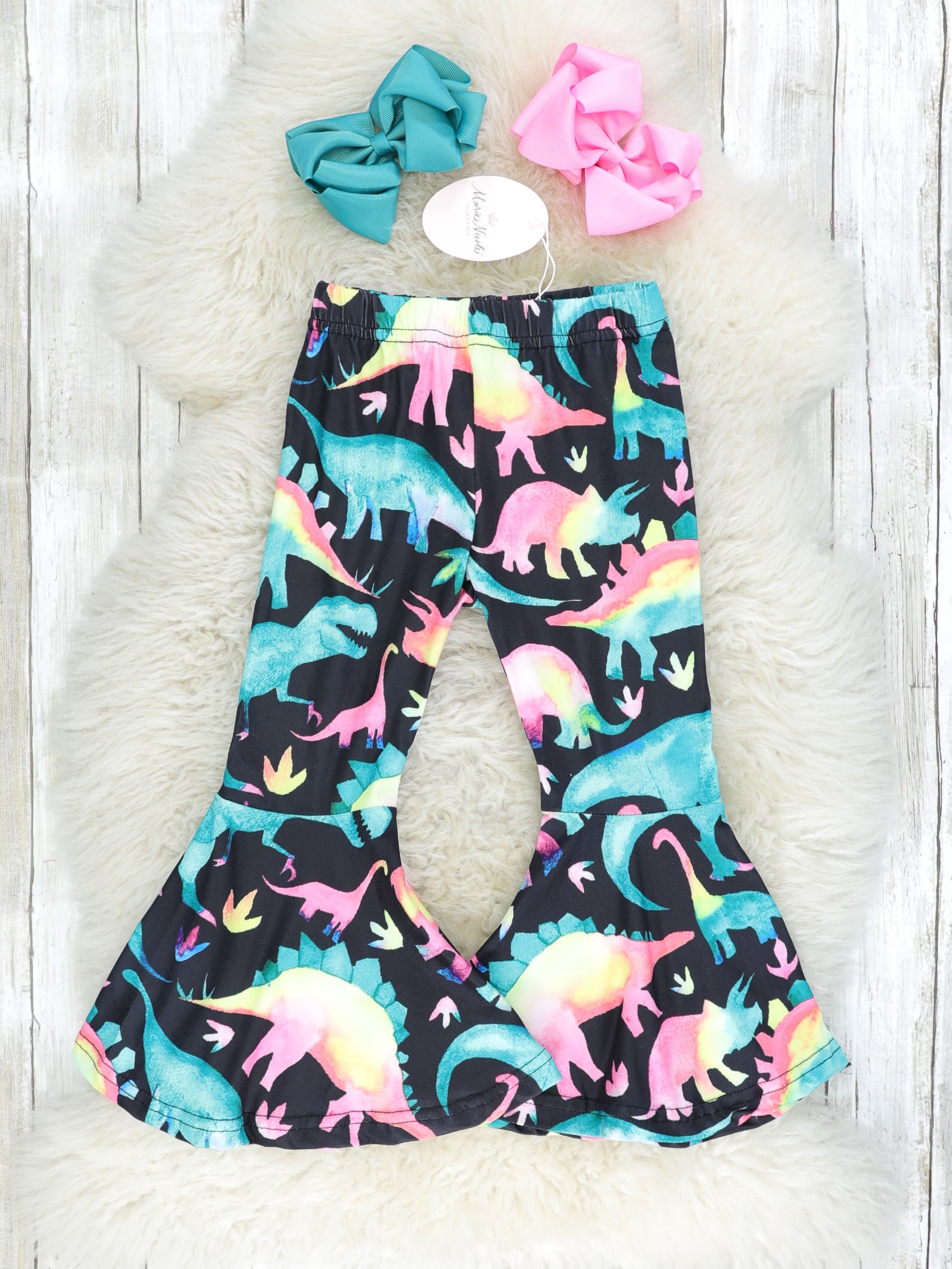Match your mini any day in this rawr-some set! These rainbow dinosaur bell bottoms feature an elastic waistband.