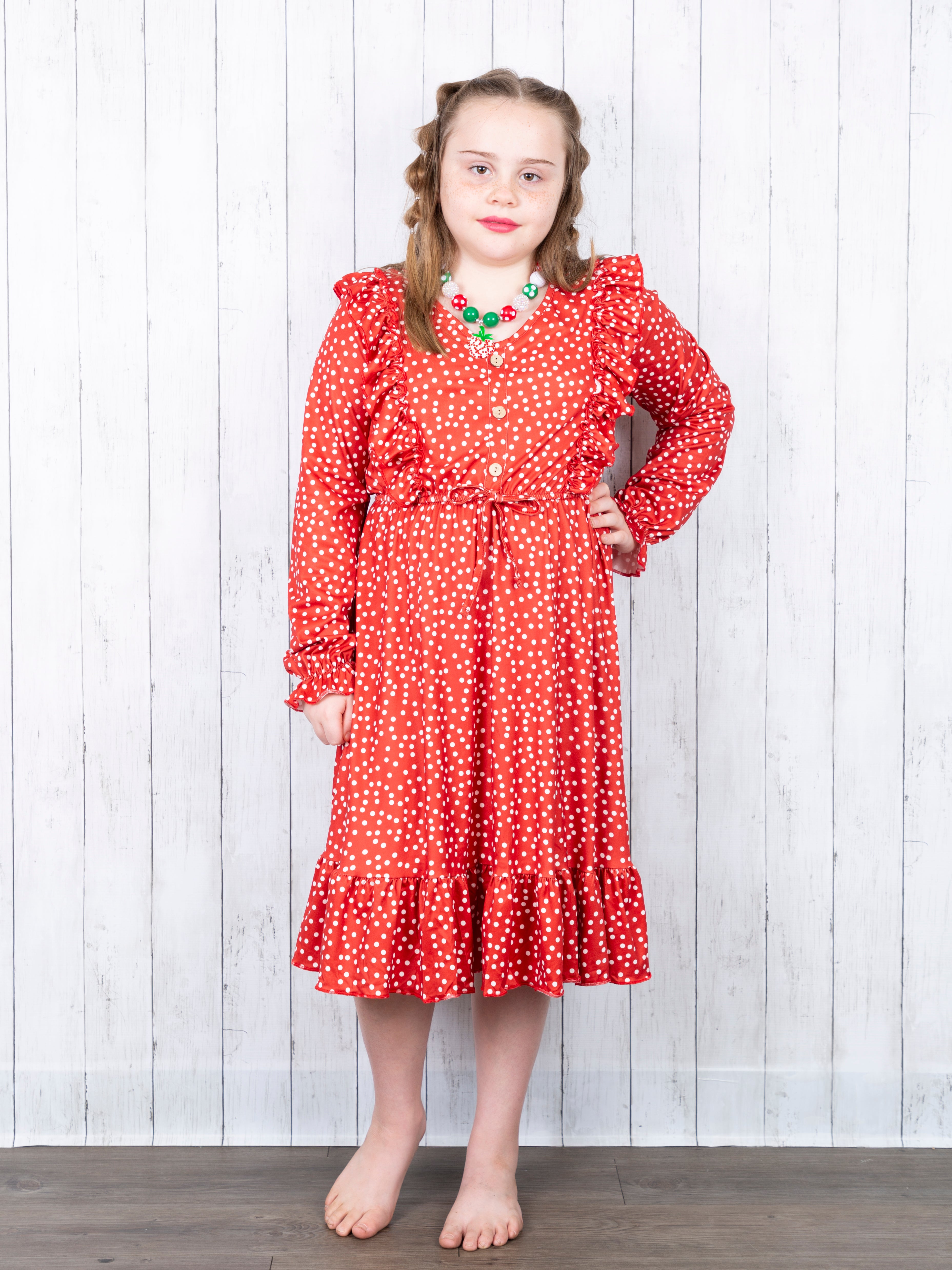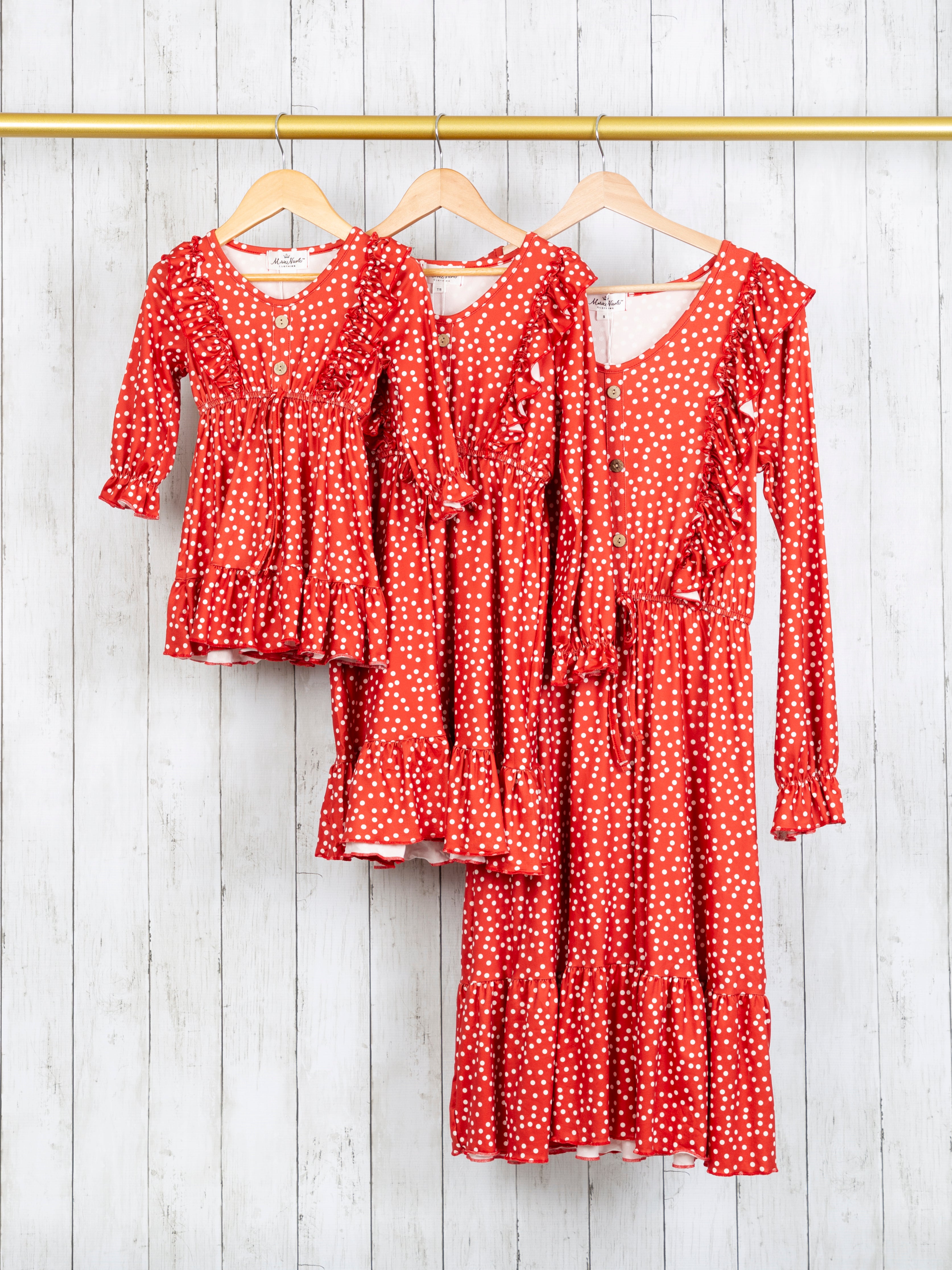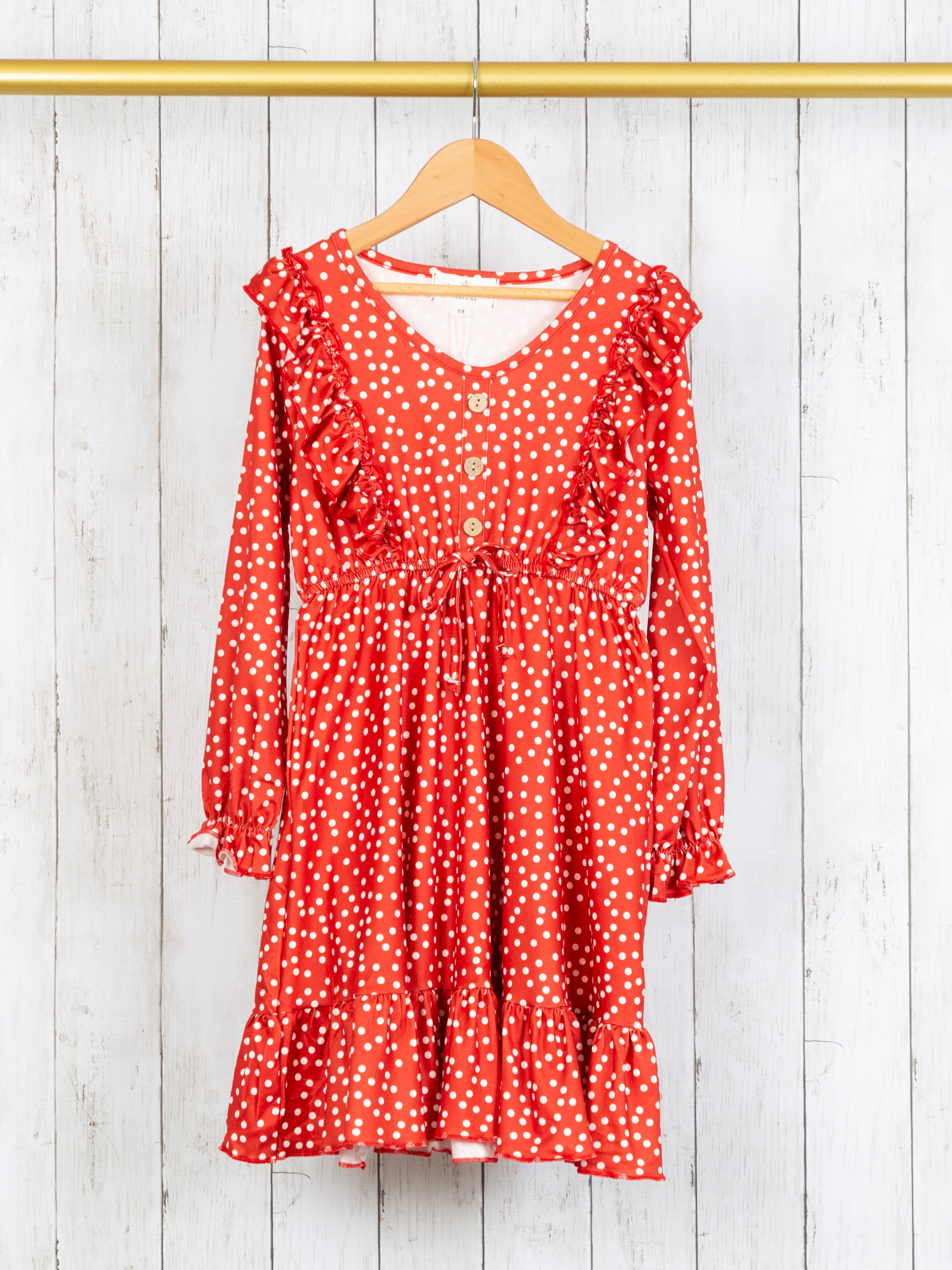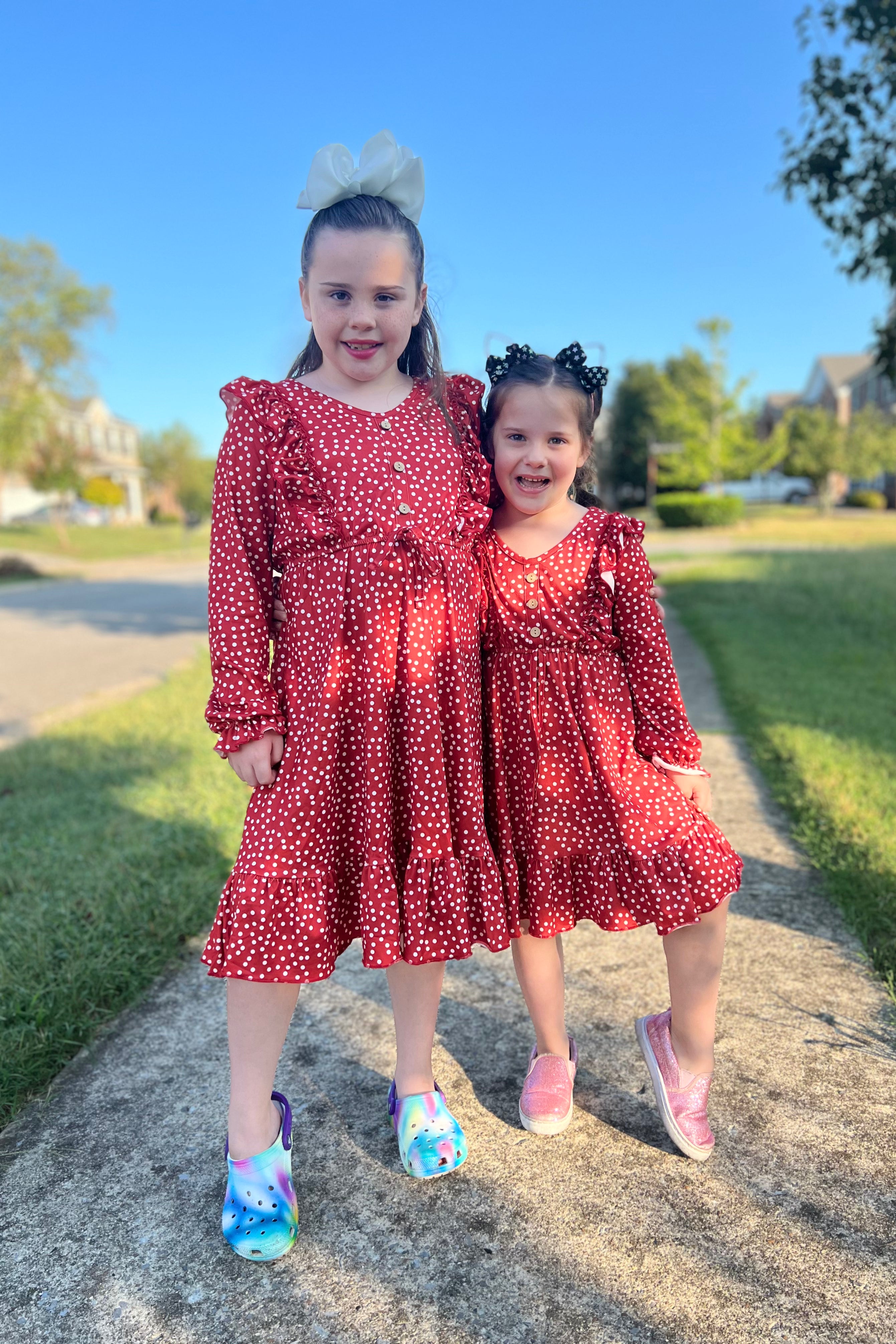 Match both your girls in this stunning dress! This red dress features polka dots, decorative buttons, & ruffles.