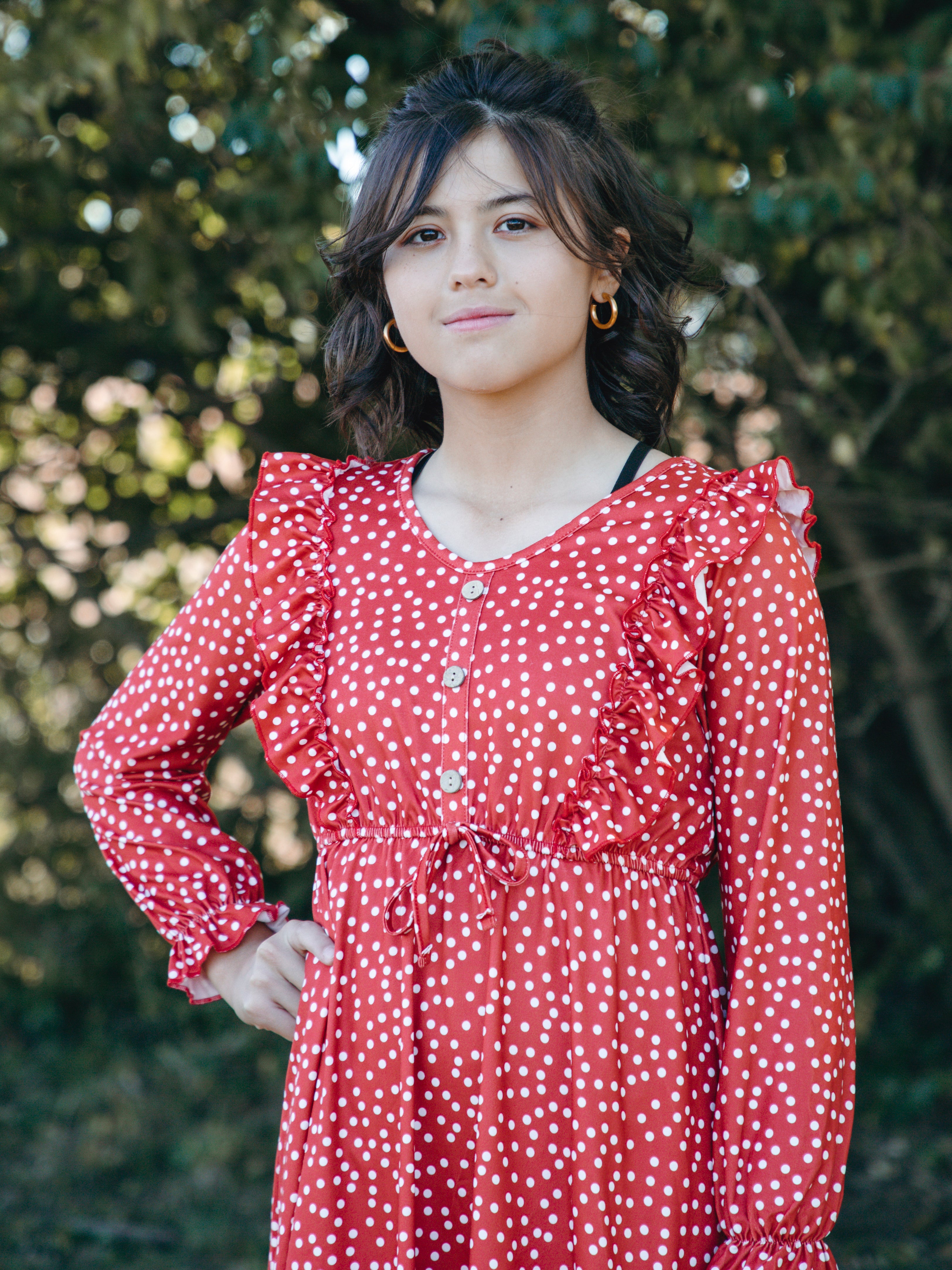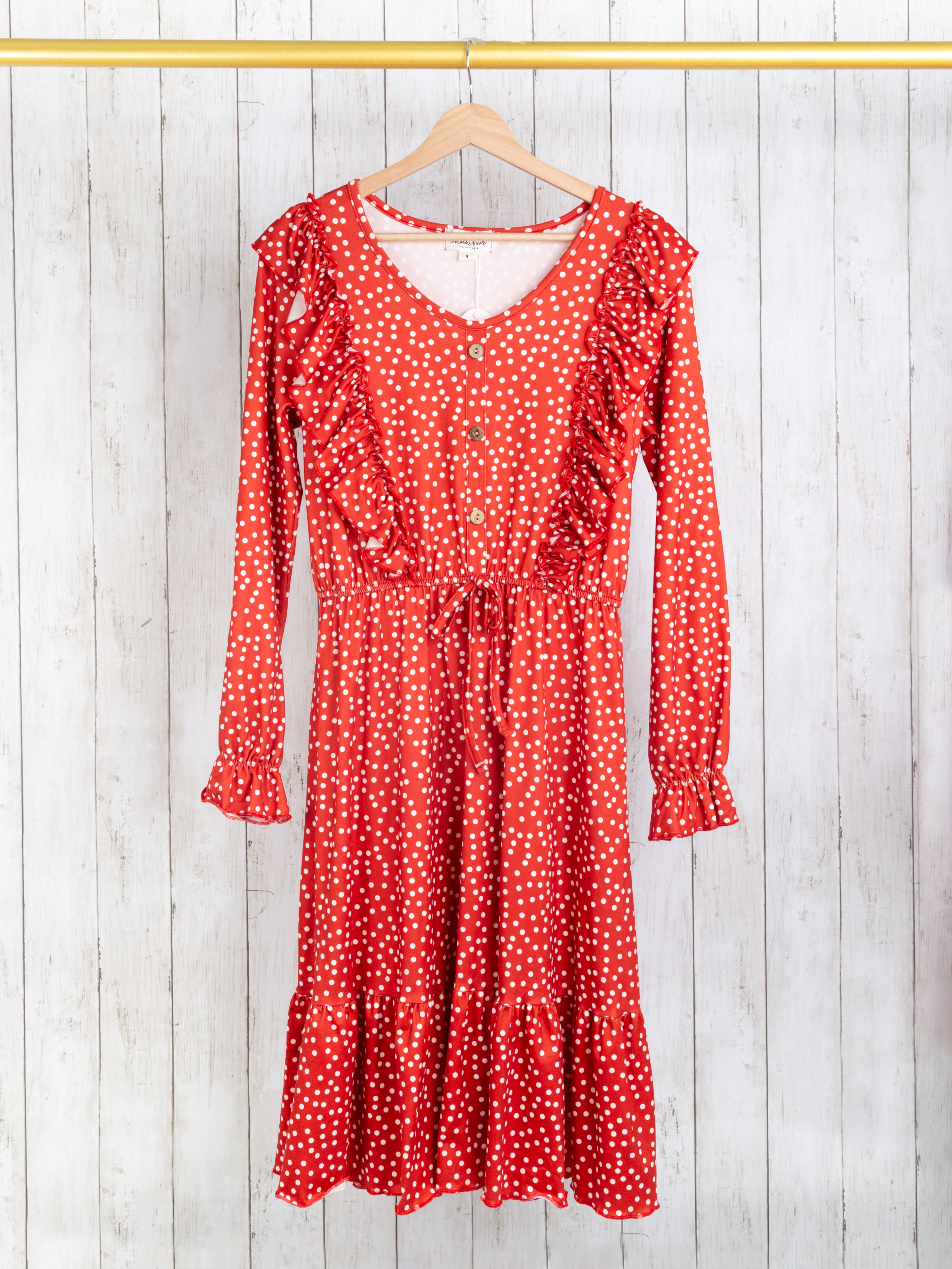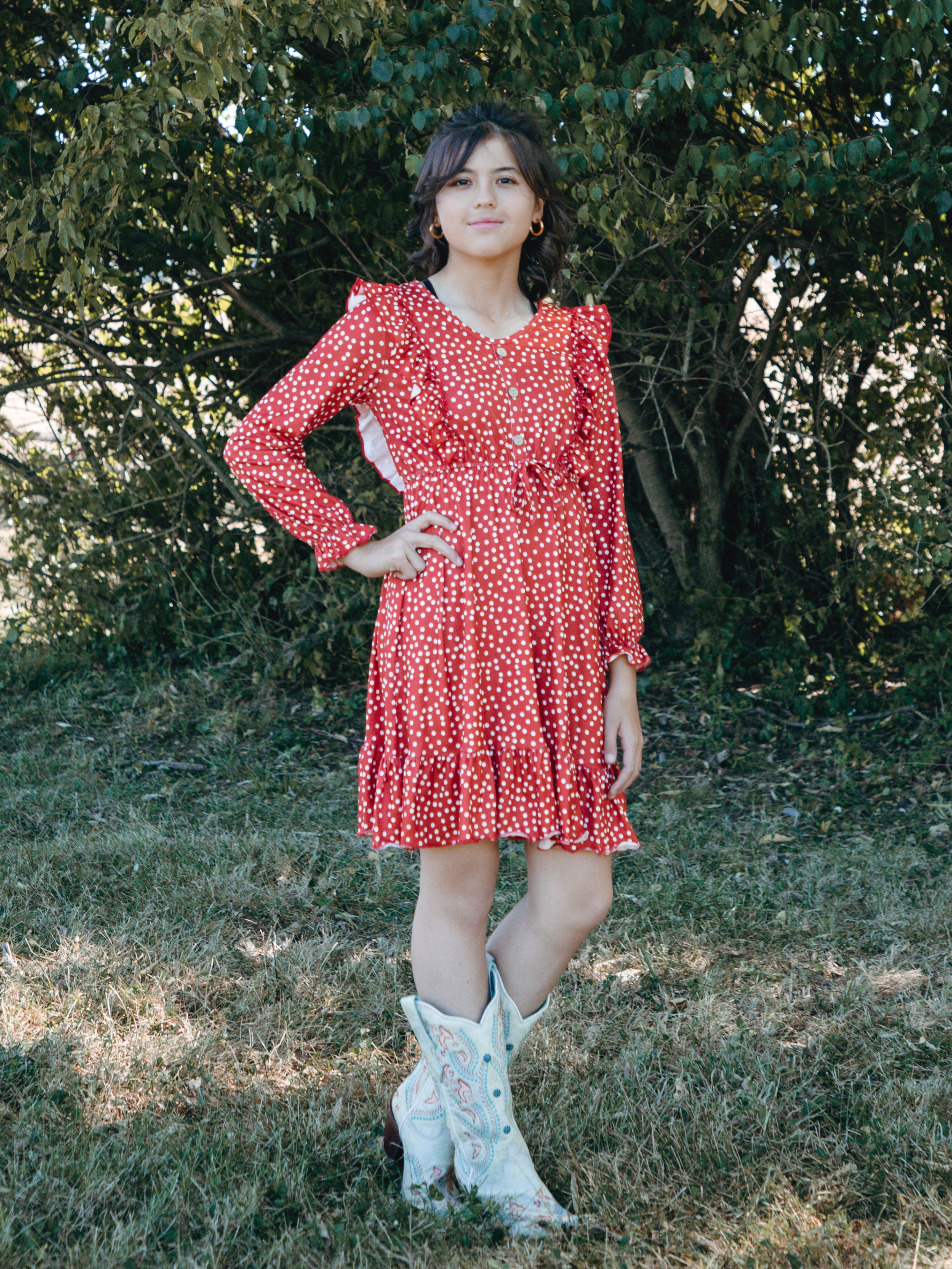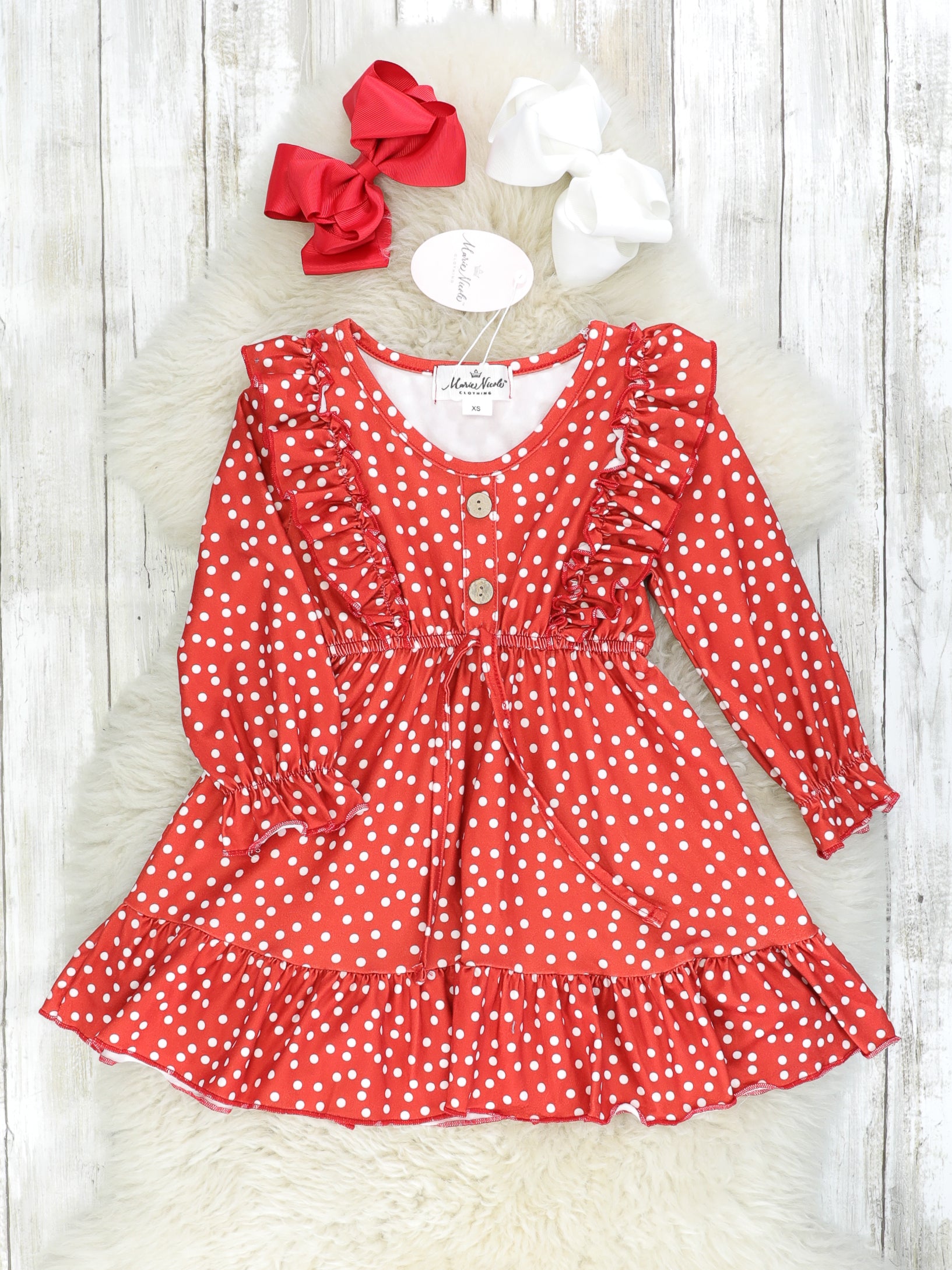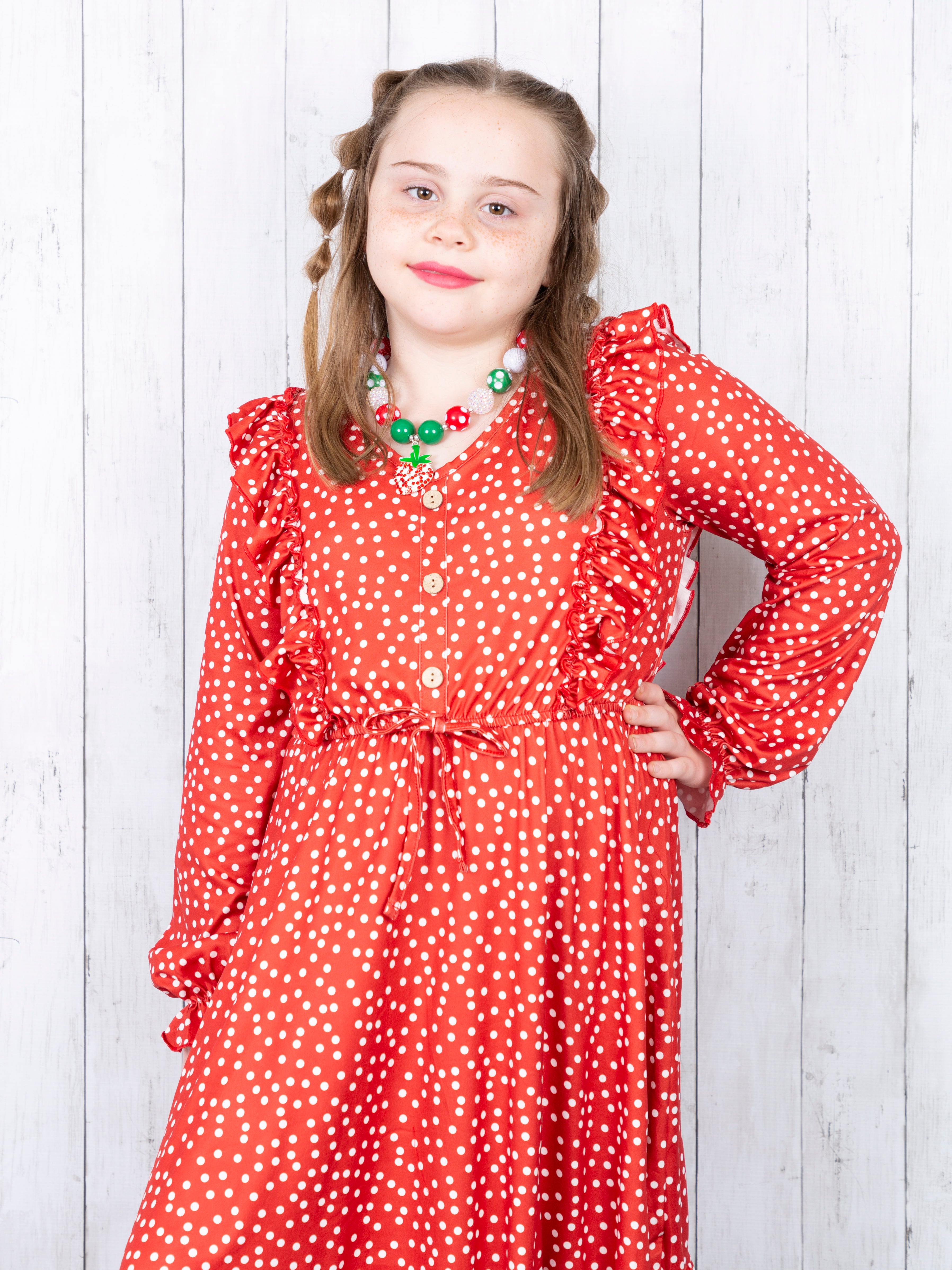 Match both your girls in this stunning dress! This red dress features polka dots, decorative buttons, & ruffles.