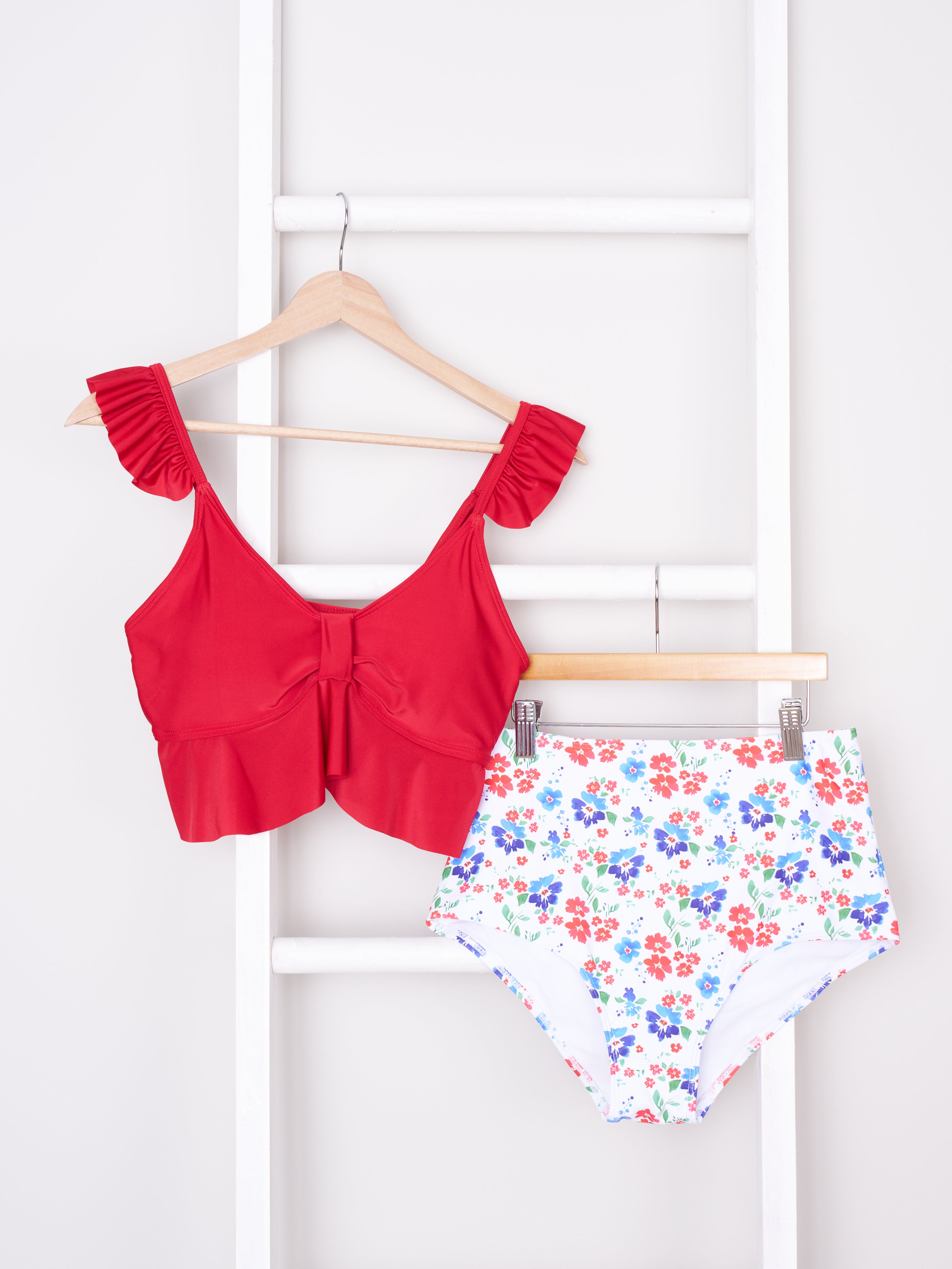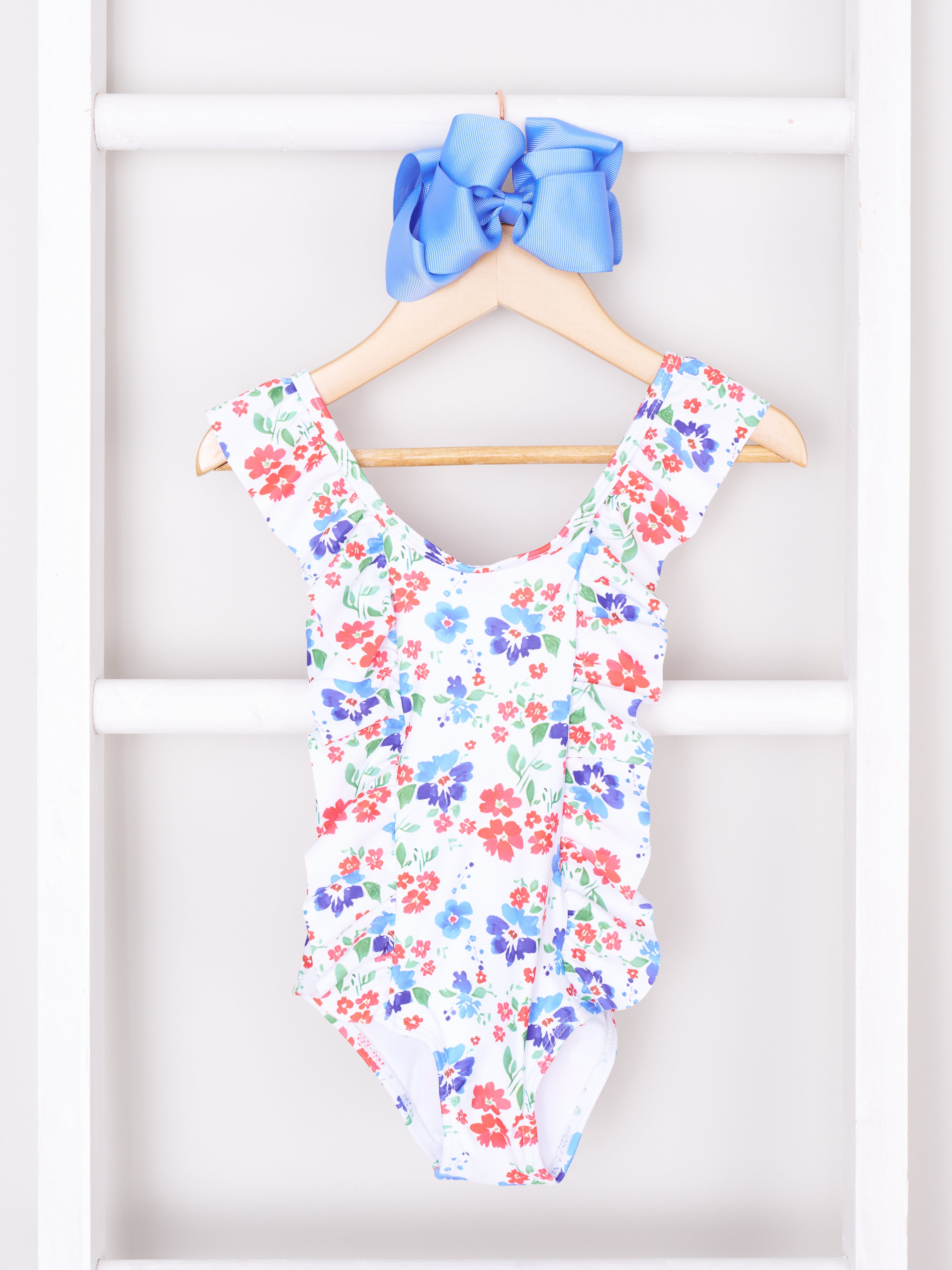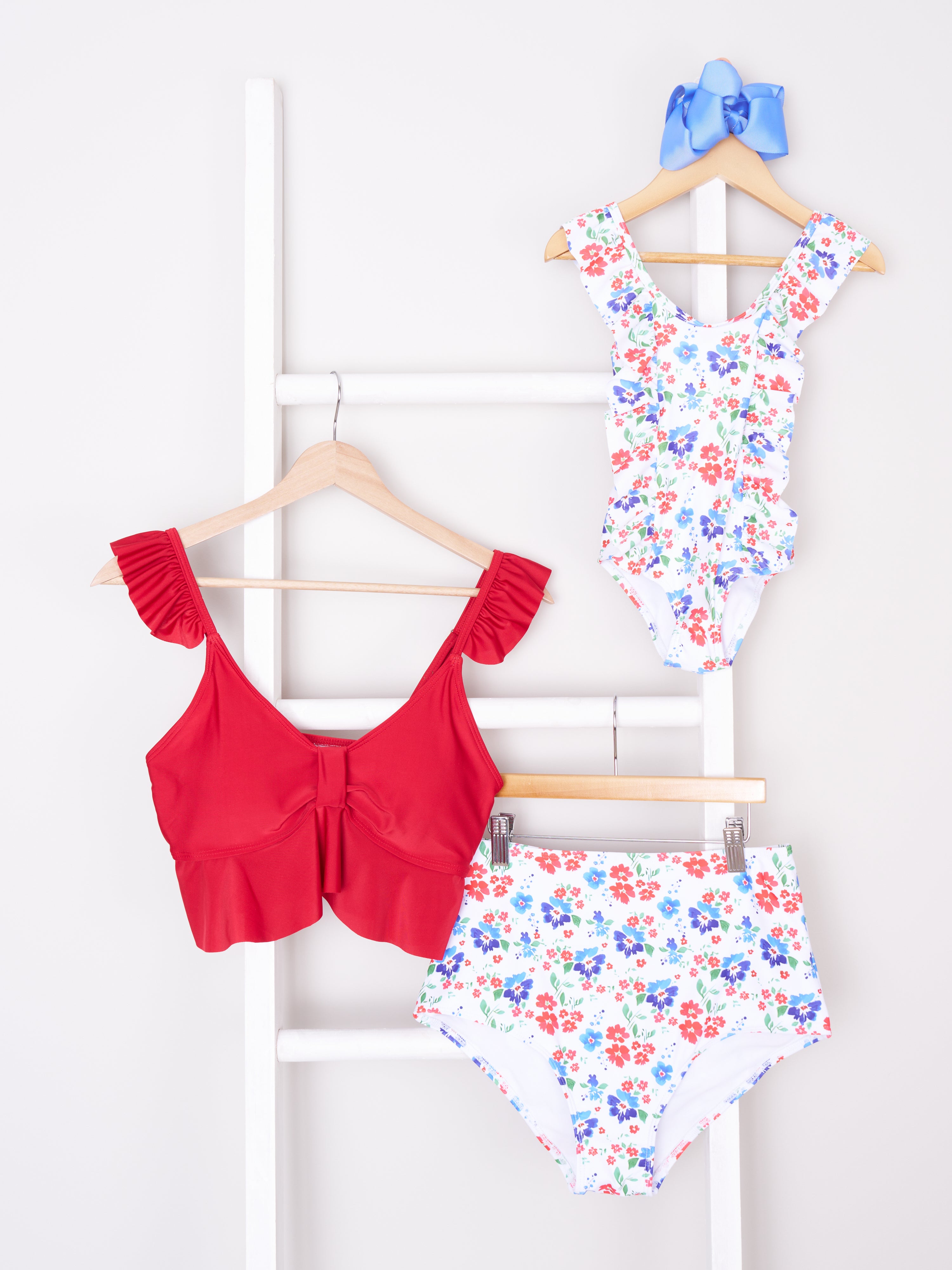 Let your patriotism bloom with this Mom & Me Red, White & Blue Poppy Swimsuit! Featuring a stunning red, white & blue poppy print, ruffles, and a double dose of Mom & Me fun, this swimsuit is sure to make a splash!