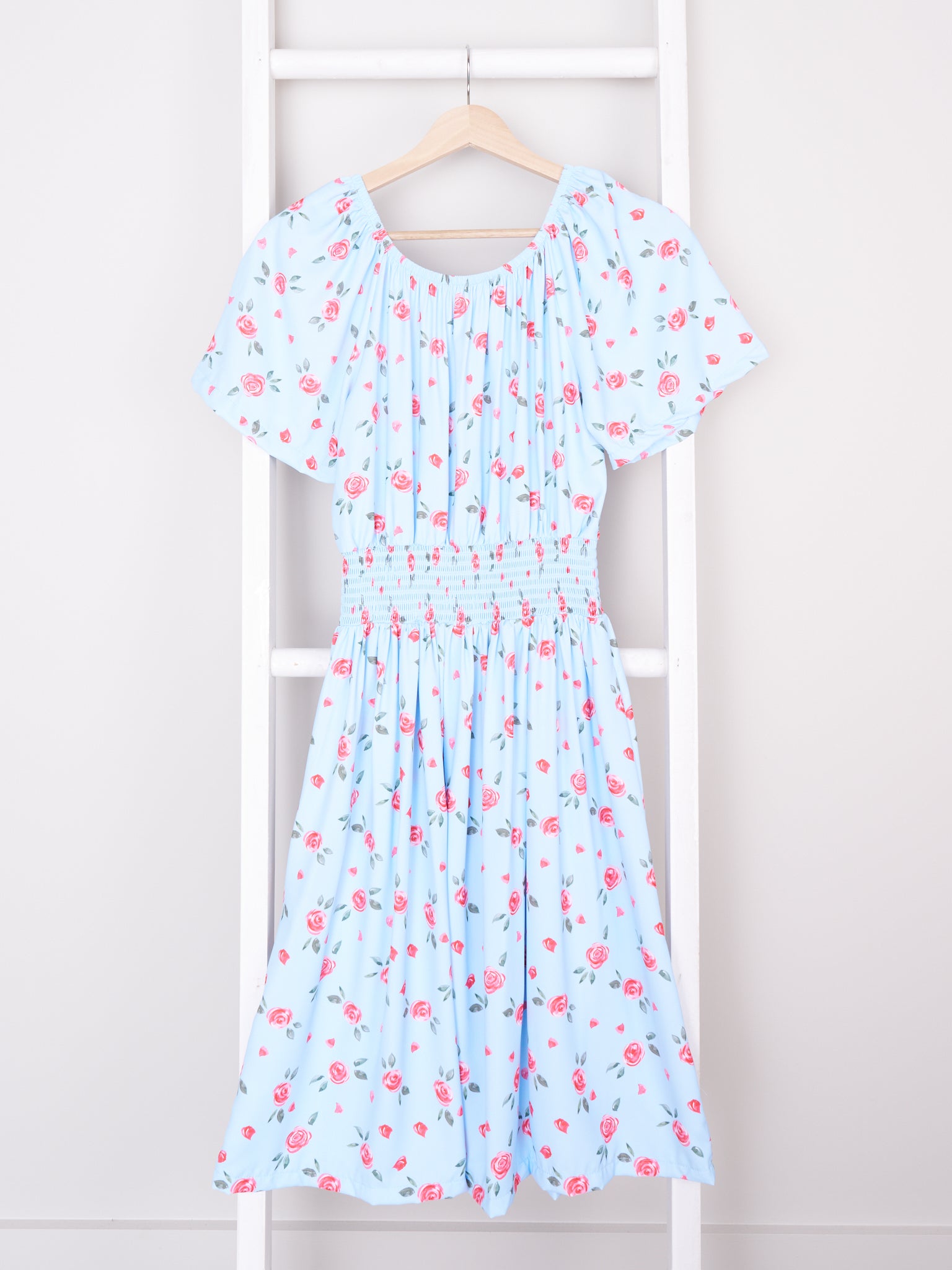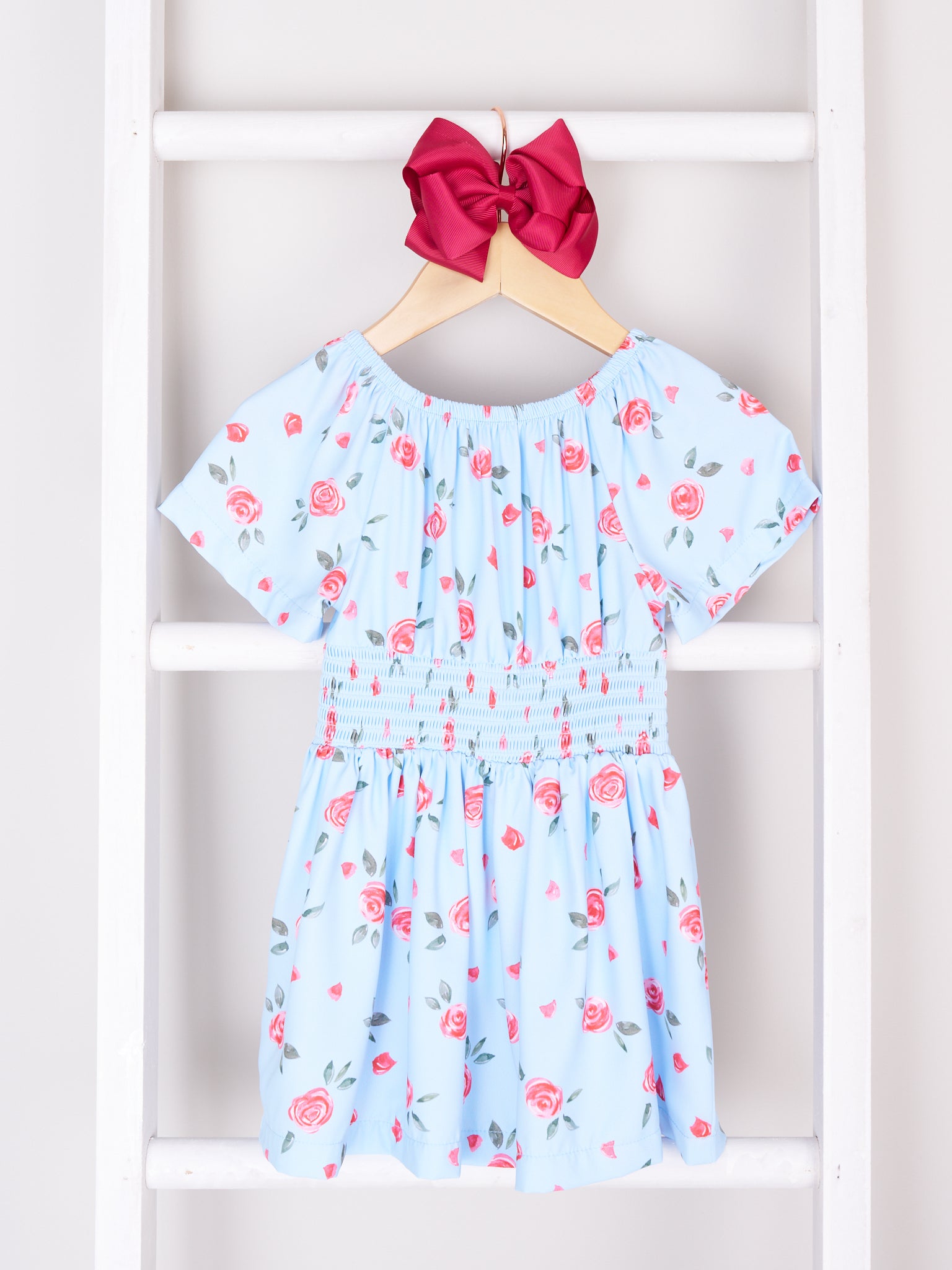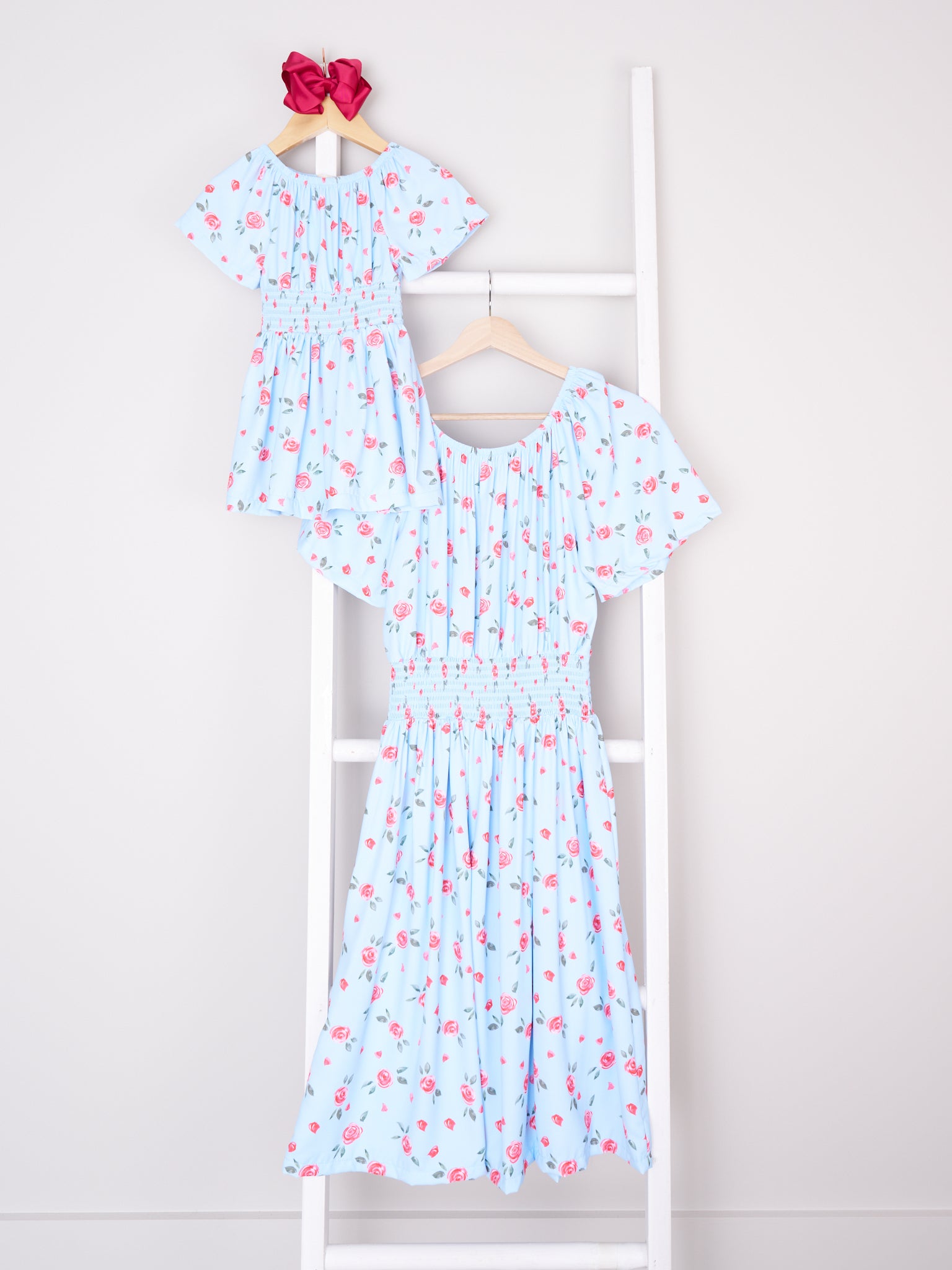 Take your little one out on the town in our Mom & Me Smocked Rose Dress! These adorable blue dresses feature a delicate rose print and charming smocking.