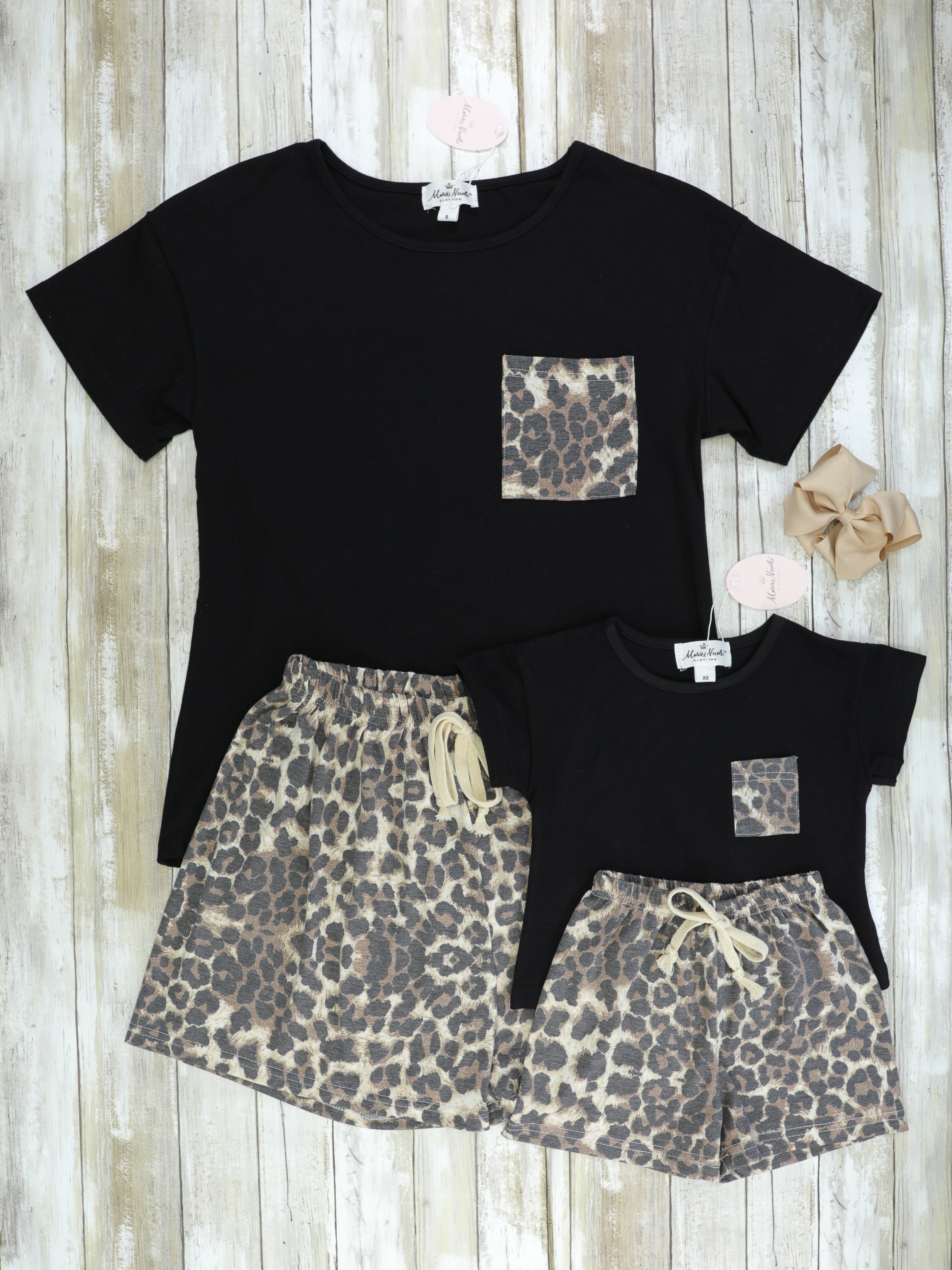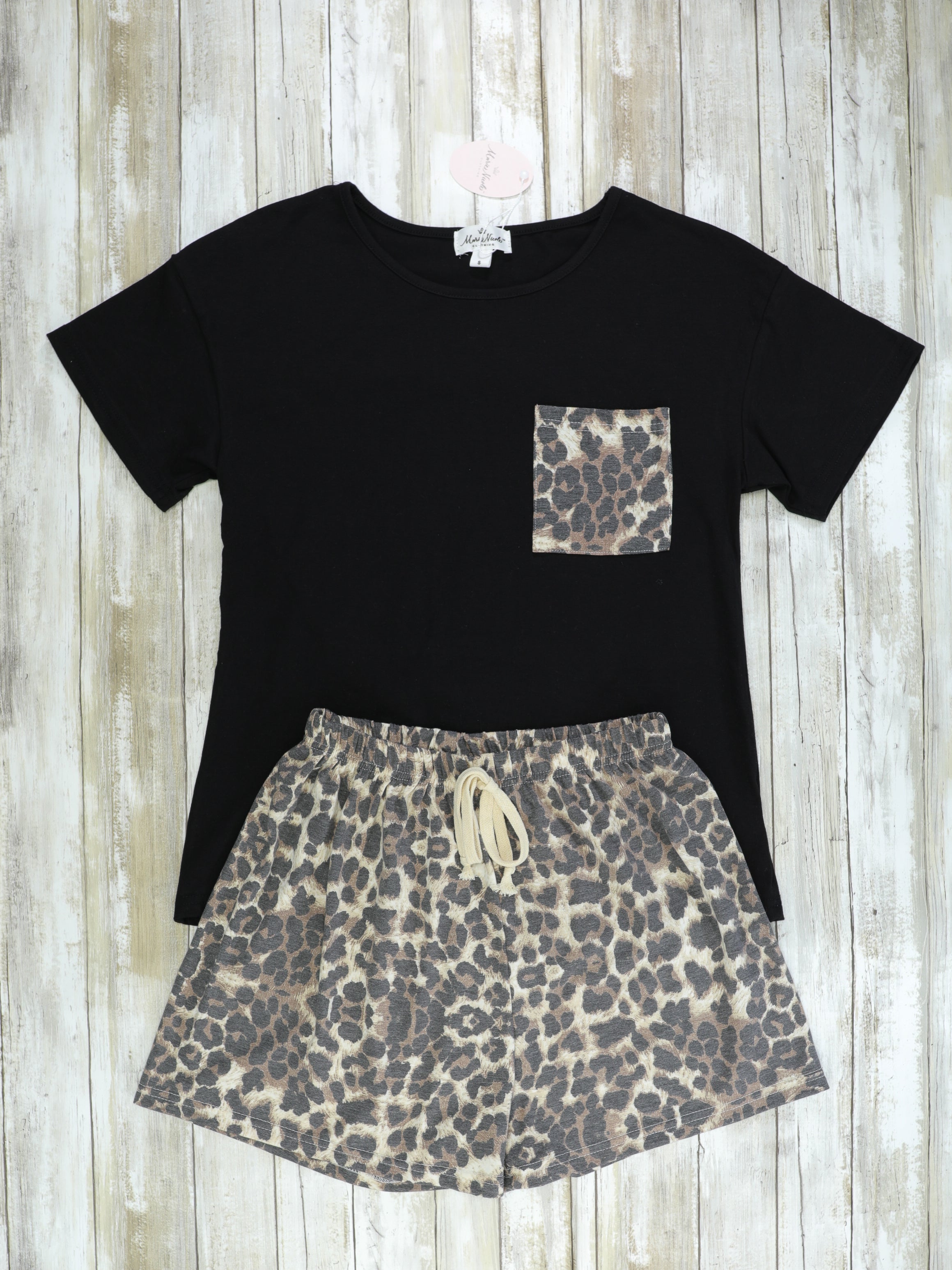 The cutest loungewear set for lounging around with your little! This set features a black top with a leopard pocket & matching flowy leopard shorts.