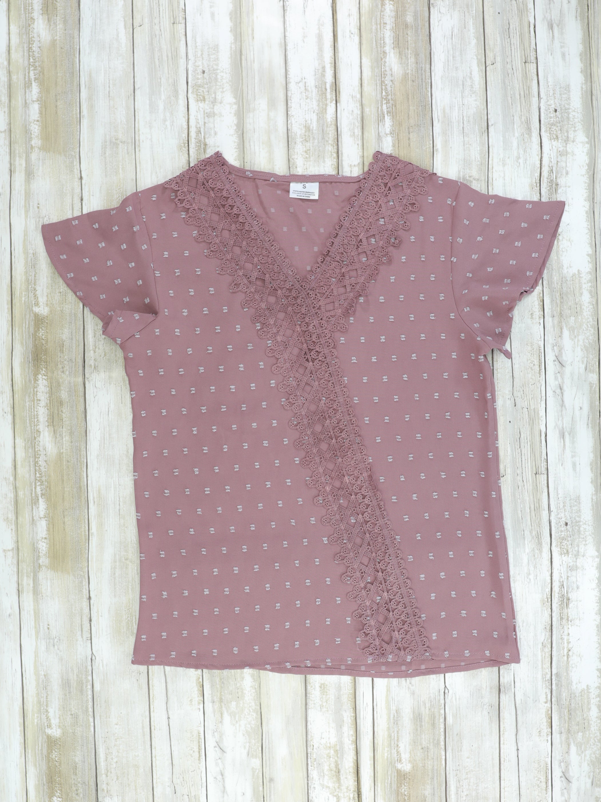 The cutest top to match your mini in on a day out! You'll be getting all the compliments! This dusty rose top features a cross over detail, lace, & Swiss dots.