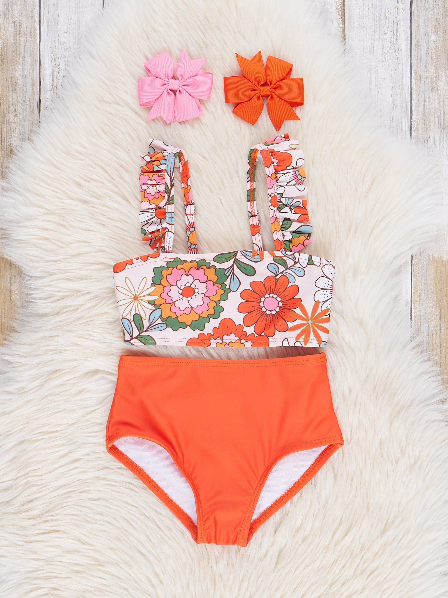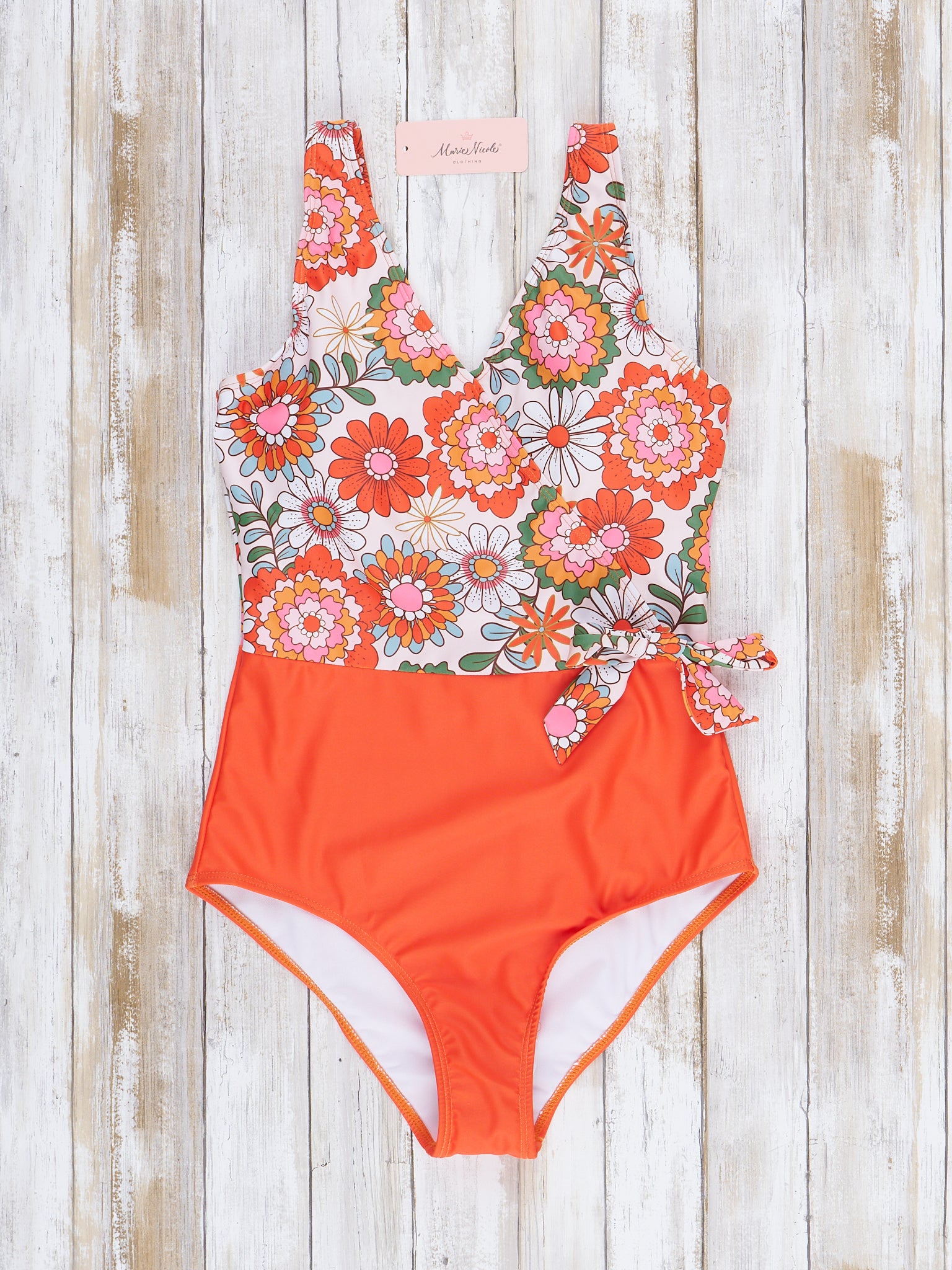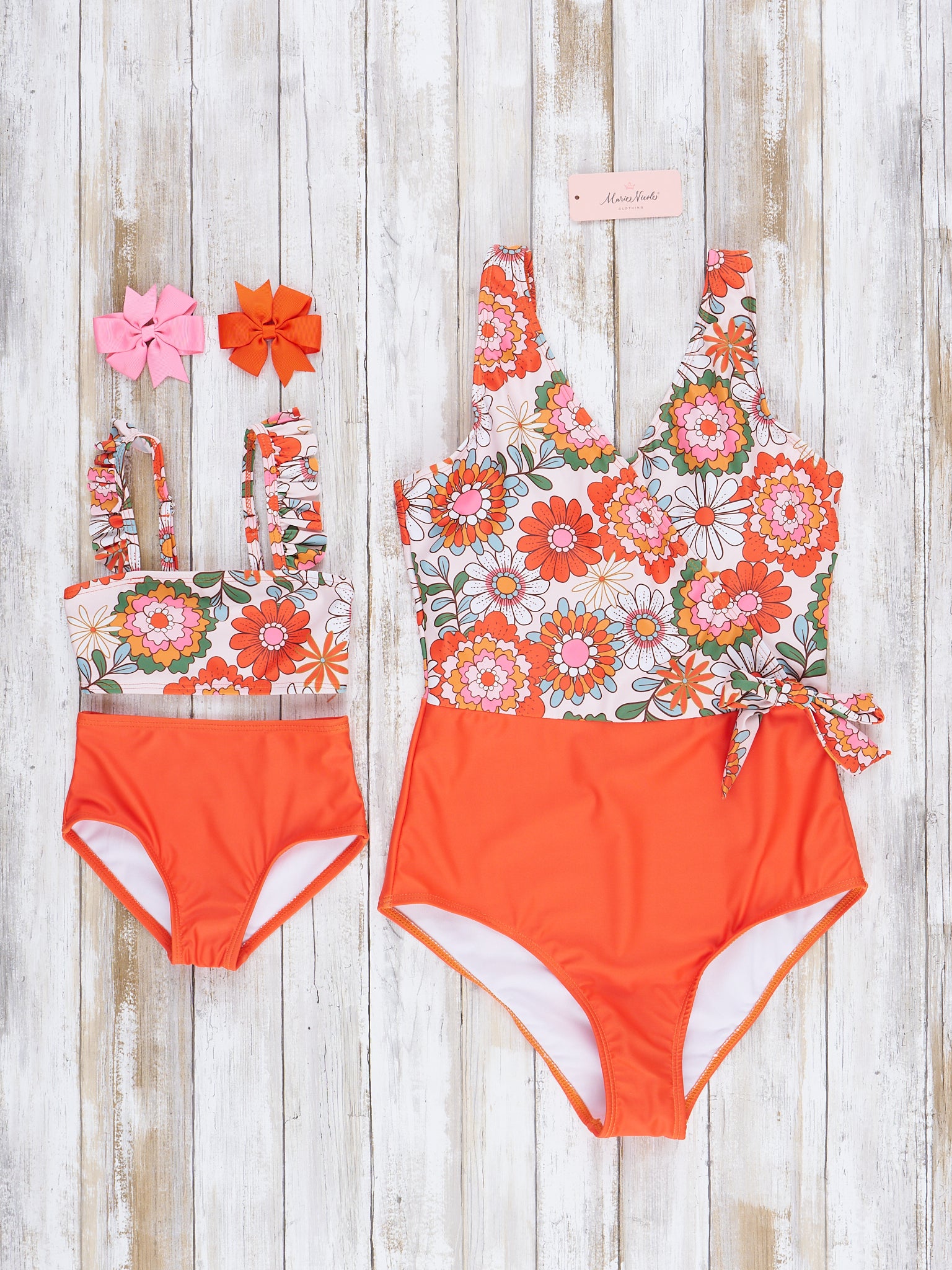 Rock the beach with this Mom & Me Retro Blooms Swimsuit! With vibrant orange and green retro flowers, this swimsuit is perfect for mother-daughter twinning. The orange bottoms add a pop of color, making you stand out in style. Get ready to make a splash and create unforgettable memories!