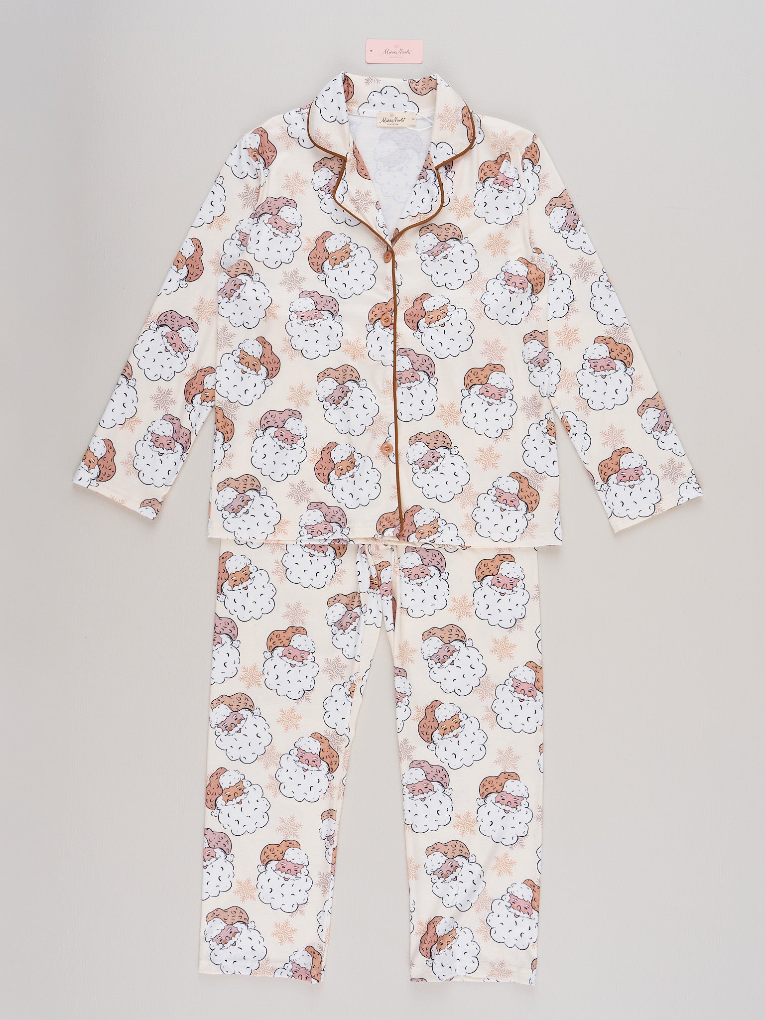 The Mom & Me Santa Snow Cloud Pajamas by Marie Nicole features a classic collared long-sleeve top paired with matching pants, both adorned in an adorable allover print of fluffy bearded Santas and snowflakes. Designed for holiday dreams and winter charm, this two-piece pajama set brings a cozy Christmas theme to bedtime. This comes as a matching mother and daughter set as well!