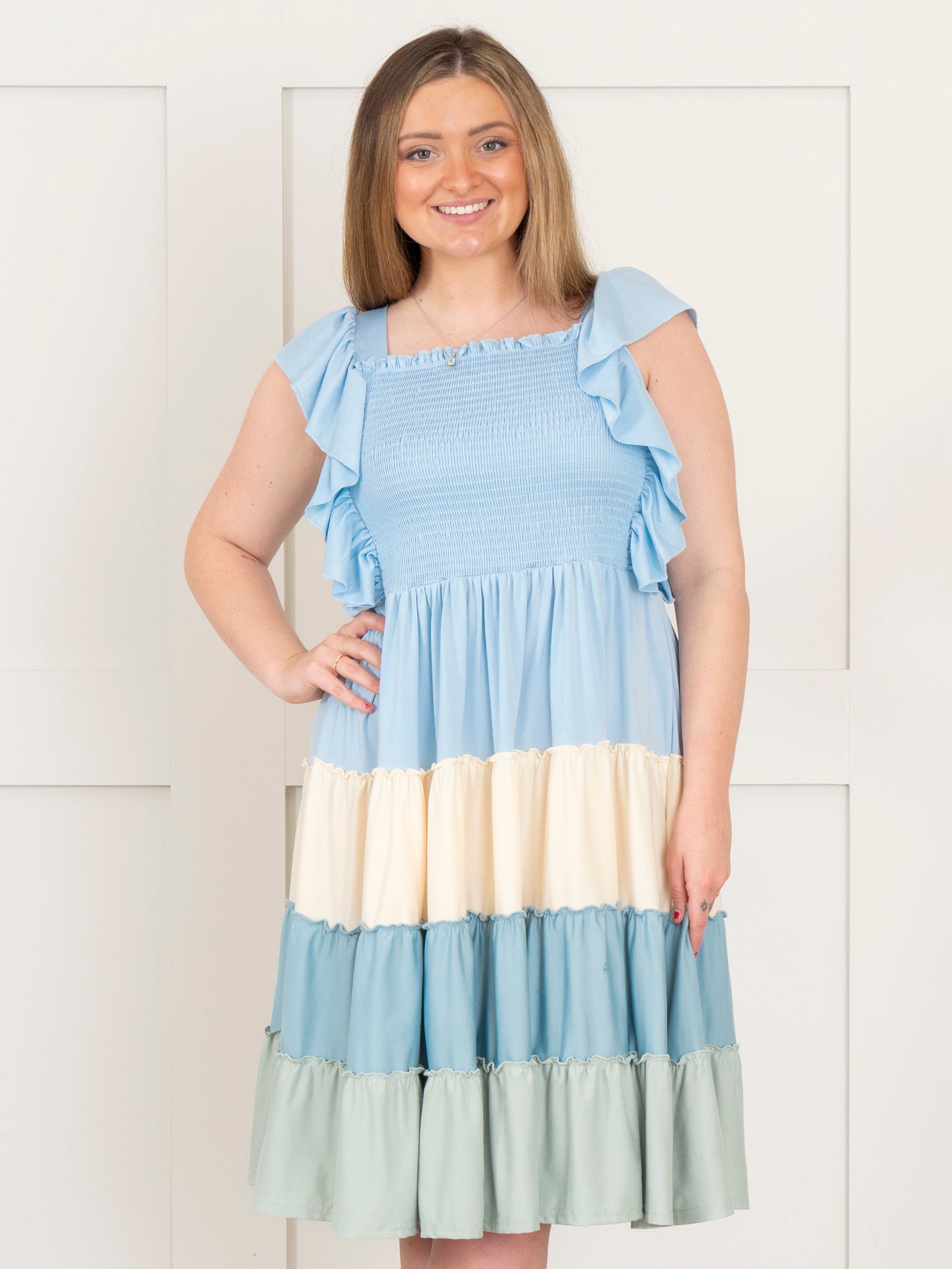 Be a summer princess in our Tiered Color Blocked Dress! This playful Mom & Me set features ruffled bodice and tiered cool colors. Perfect for twinning with your little one. By Marie Nicole Clothing.