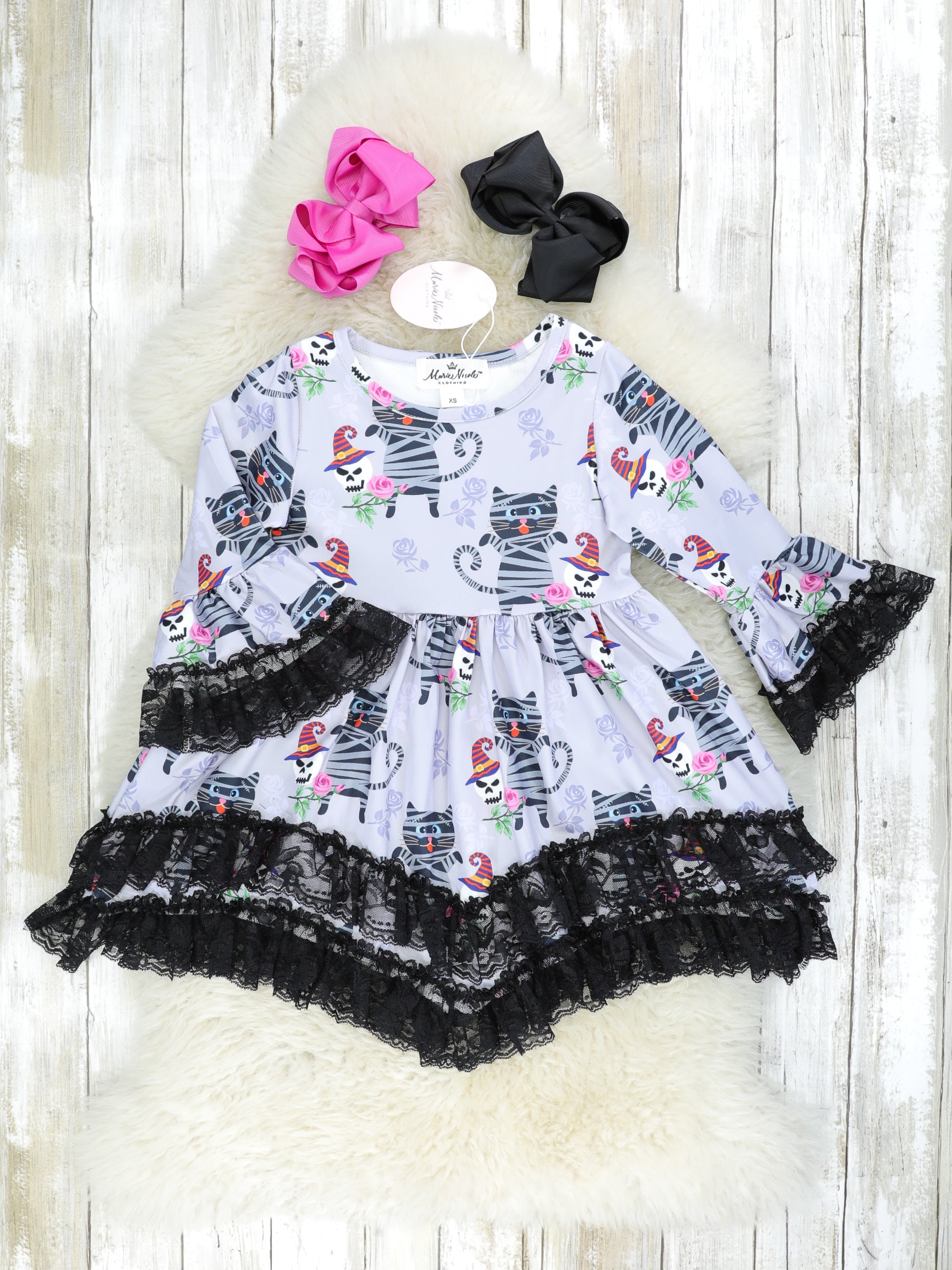 This mummy dress has us all wrapped up! This dress features the cutest mummy cat design with lace trim details & bell sleeves.