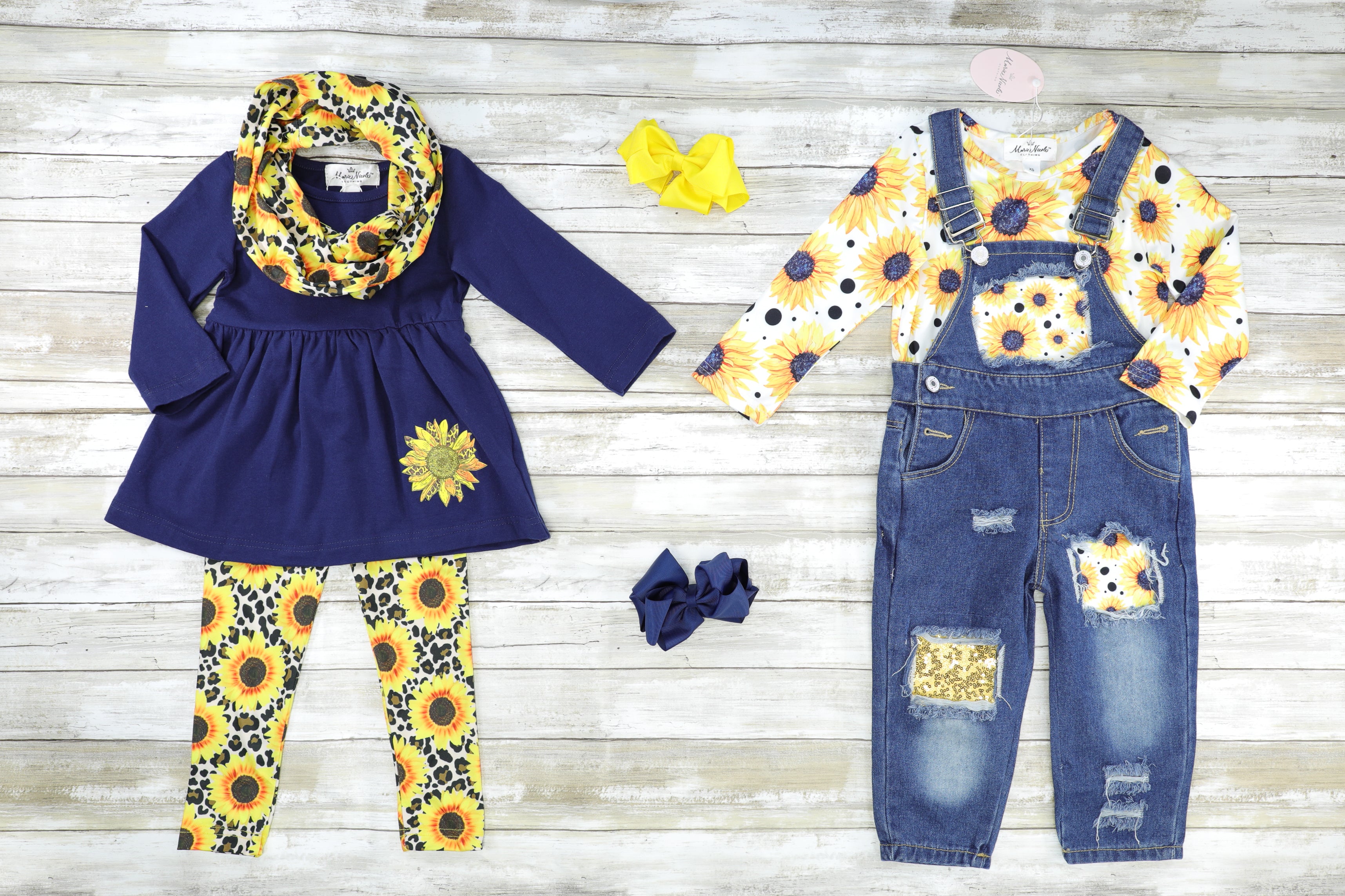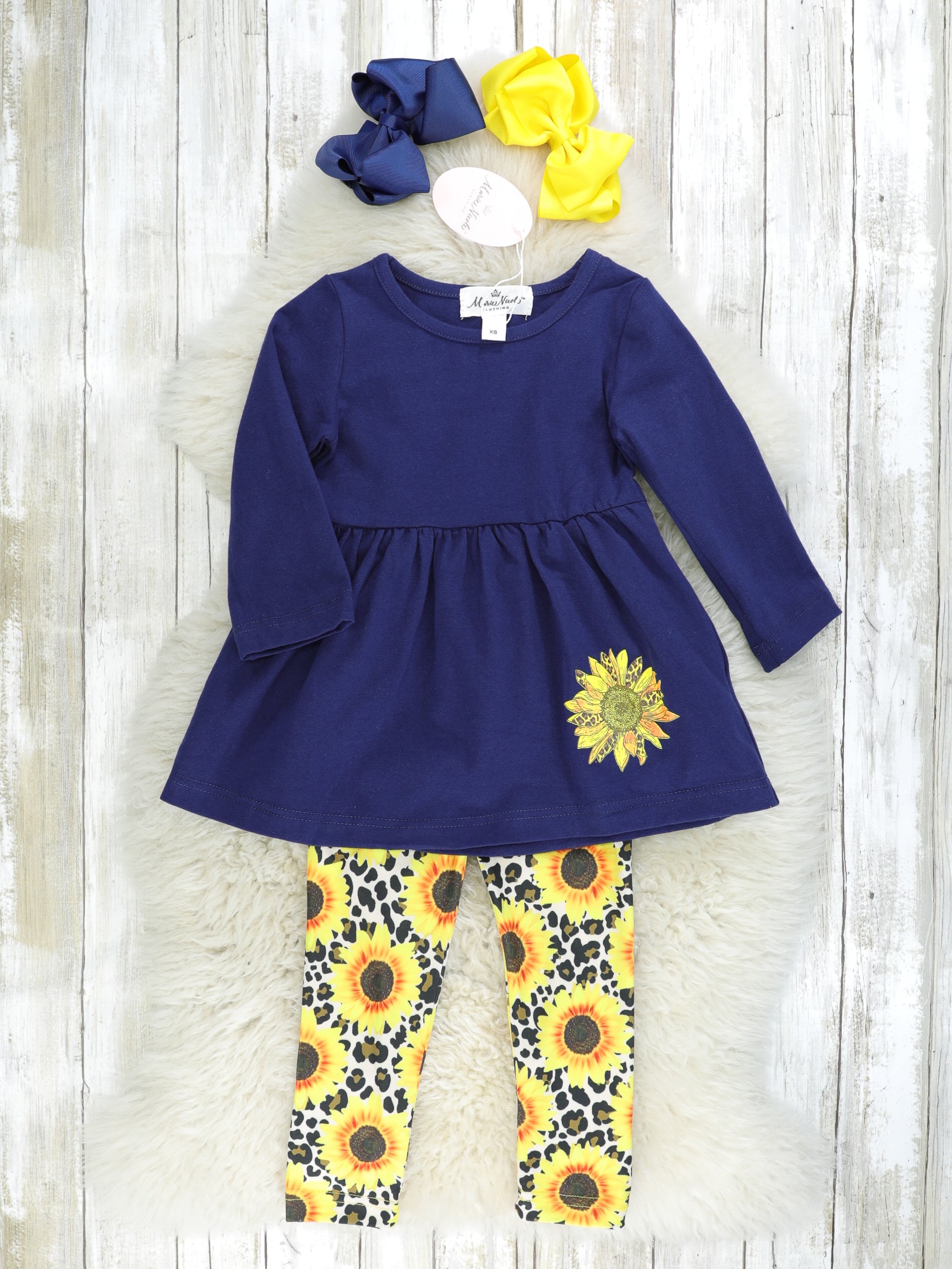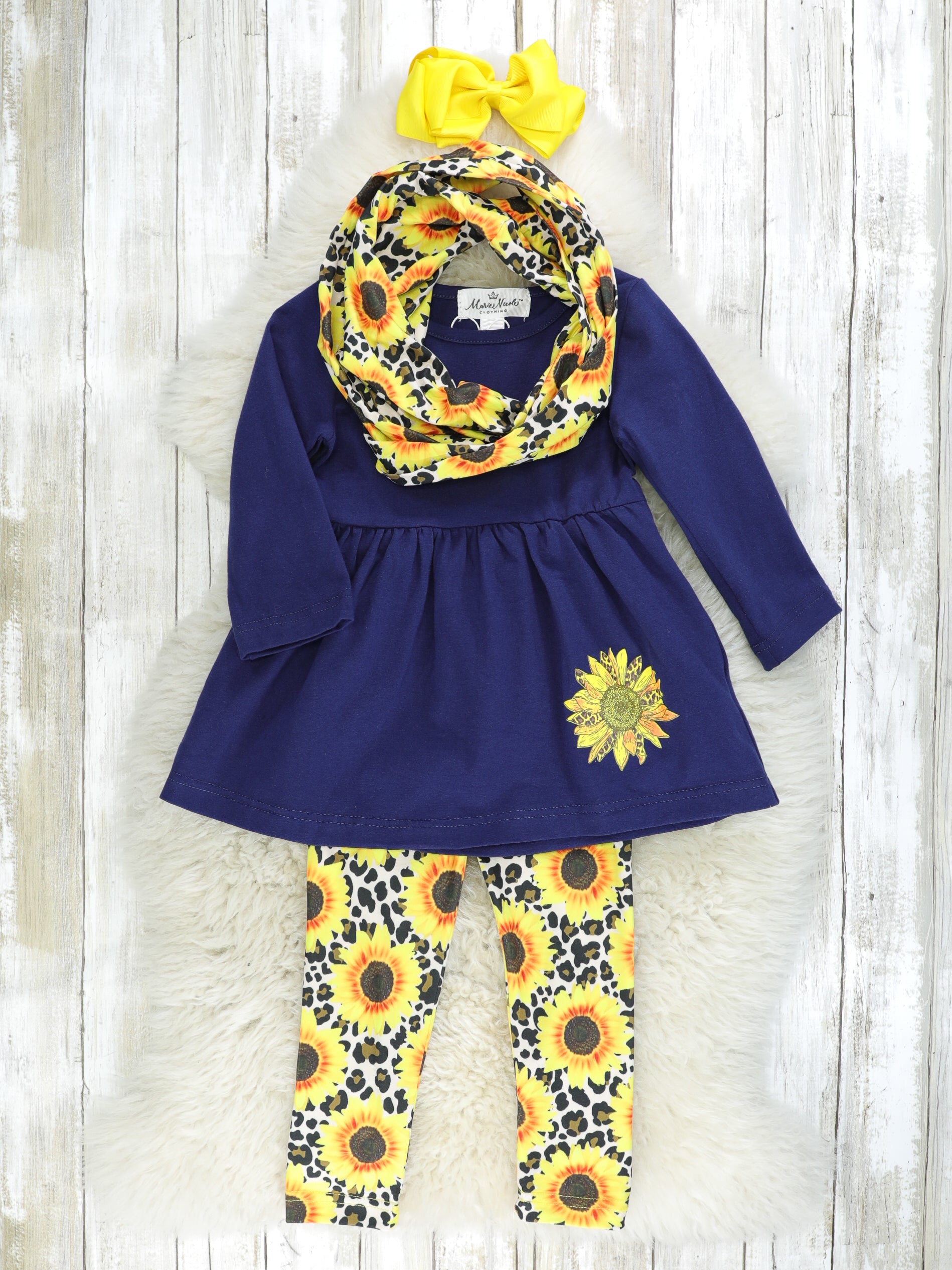 A sassy sister set for your stunning sunflowers! This navy peplum top features a sunflower detail with leopard print sunflower pants & a matching scarf.