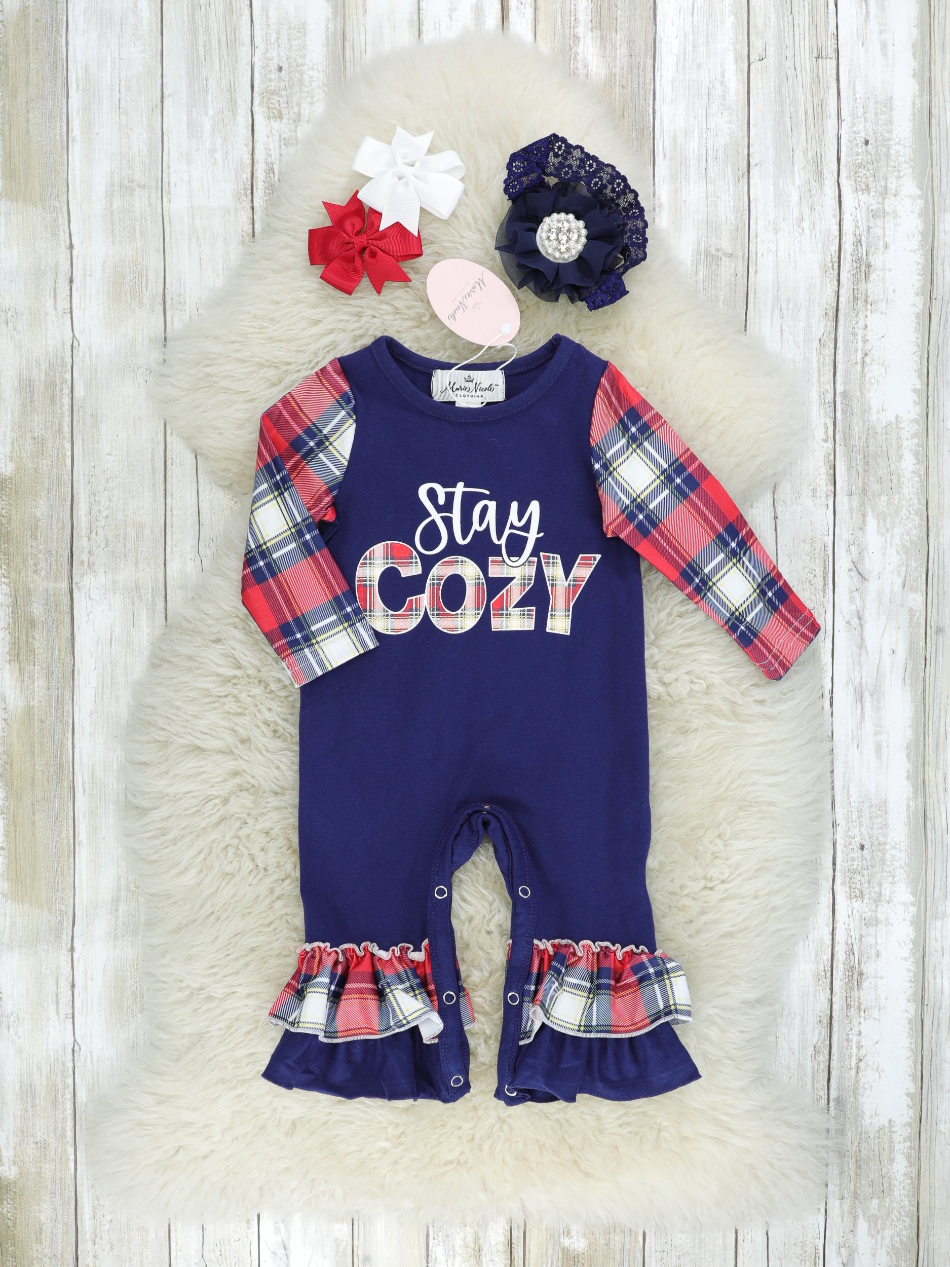 Navy & Red "Stay Cozy" Plaid Ruffle Raglan Romper