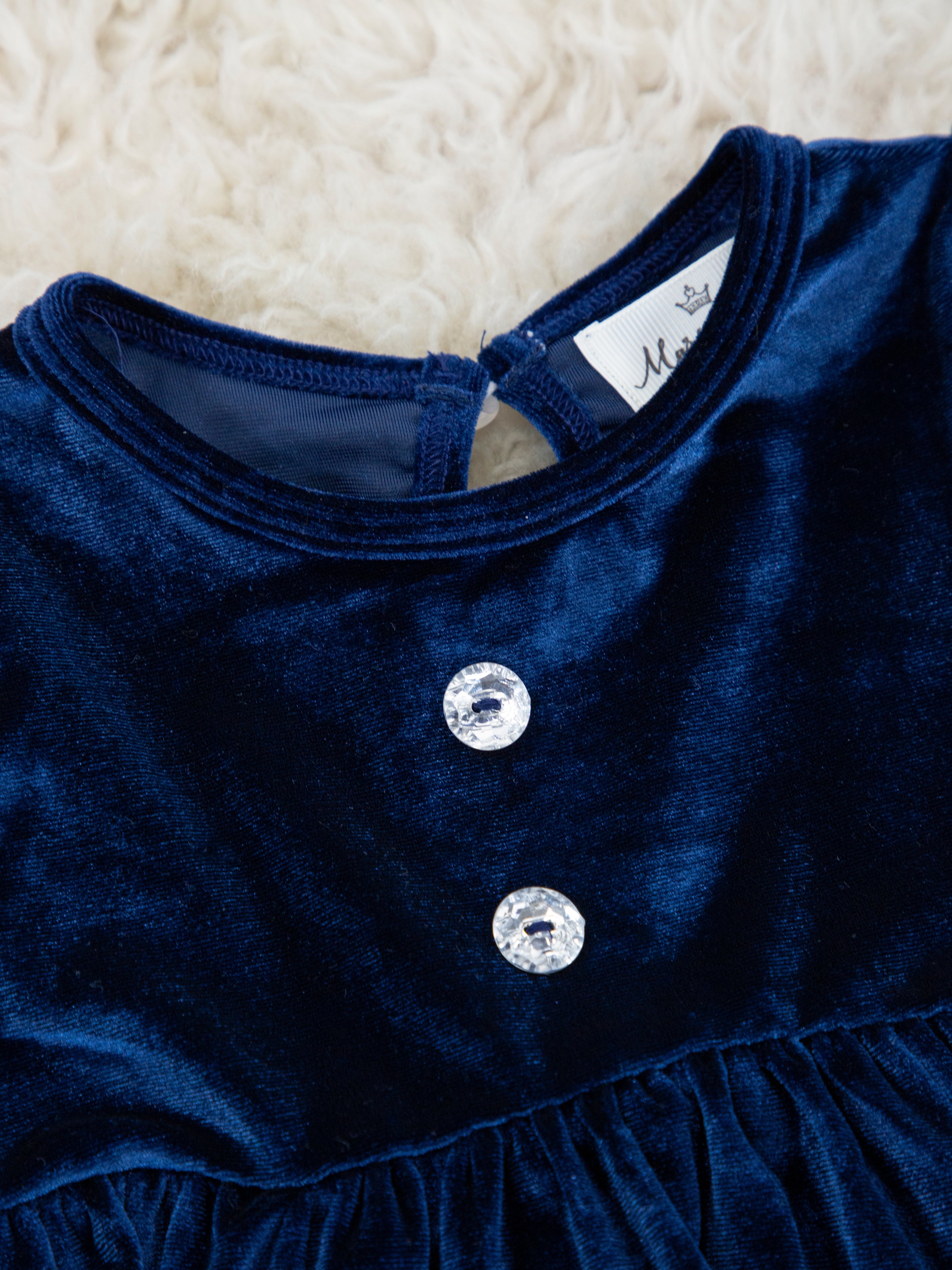 We have the sweetest & softest velvet sets for your littles! This navy dress features bubble sleeves, crystal buttons, & a keyhole at the back of the neck for easy changing!