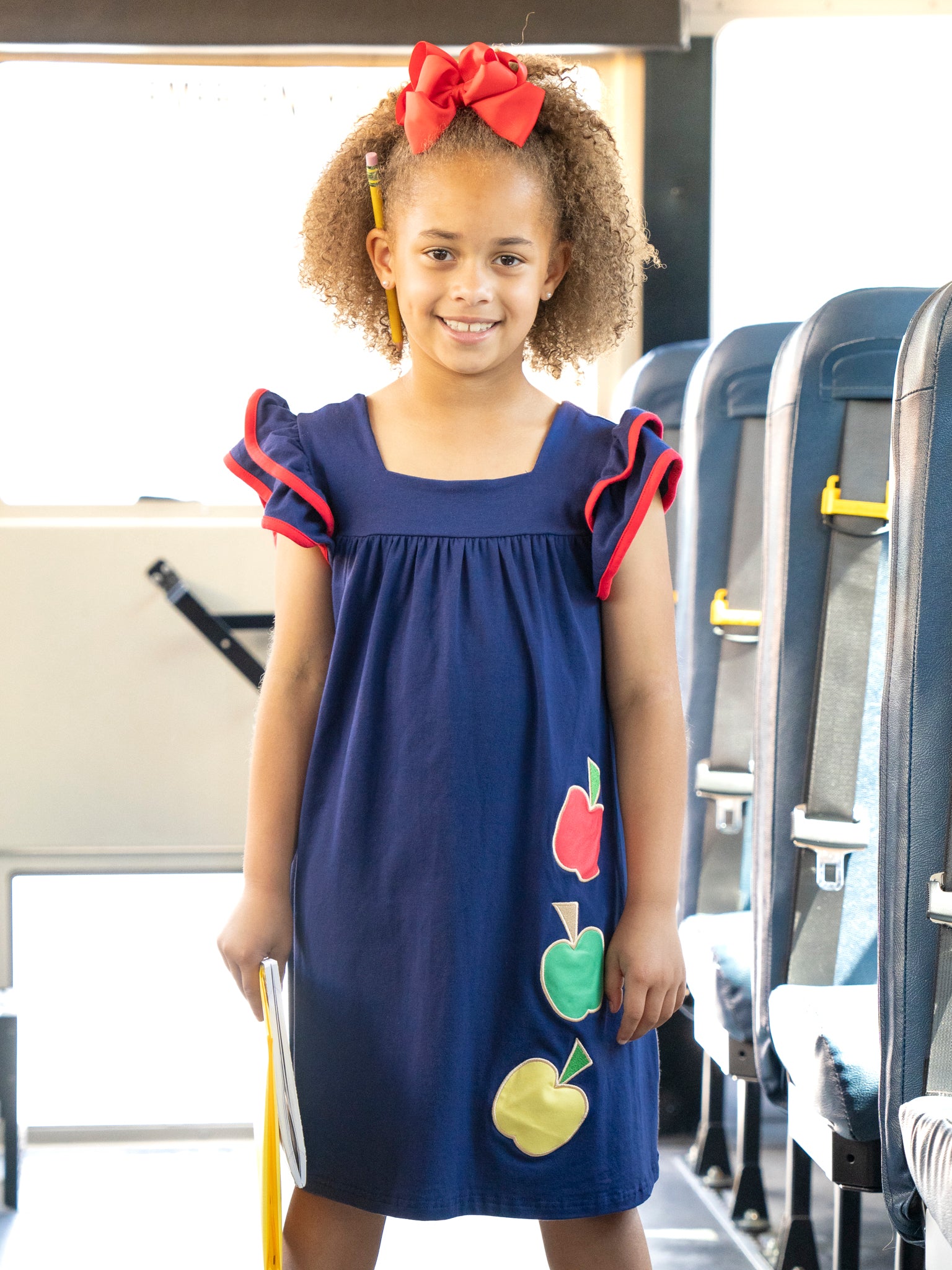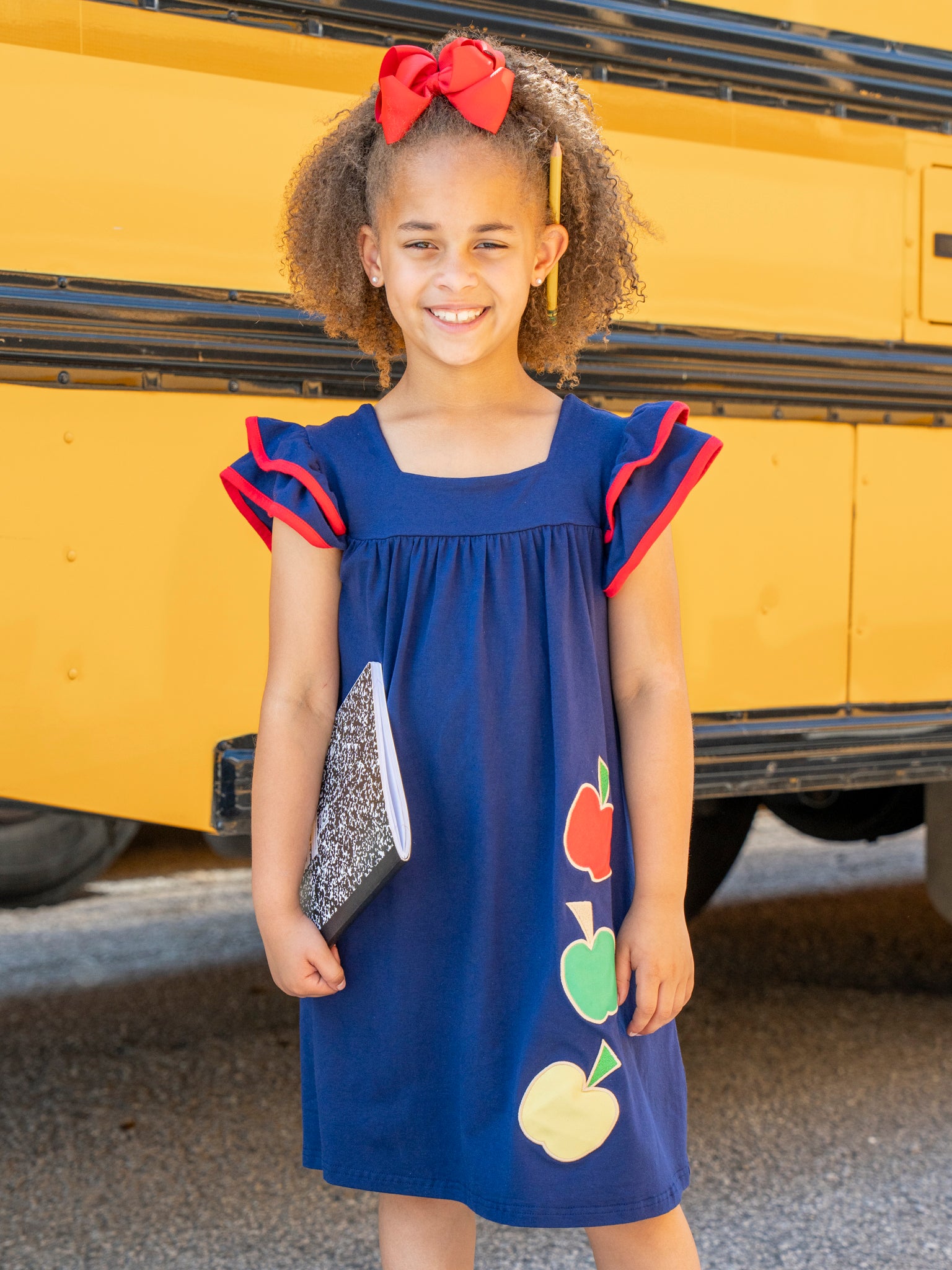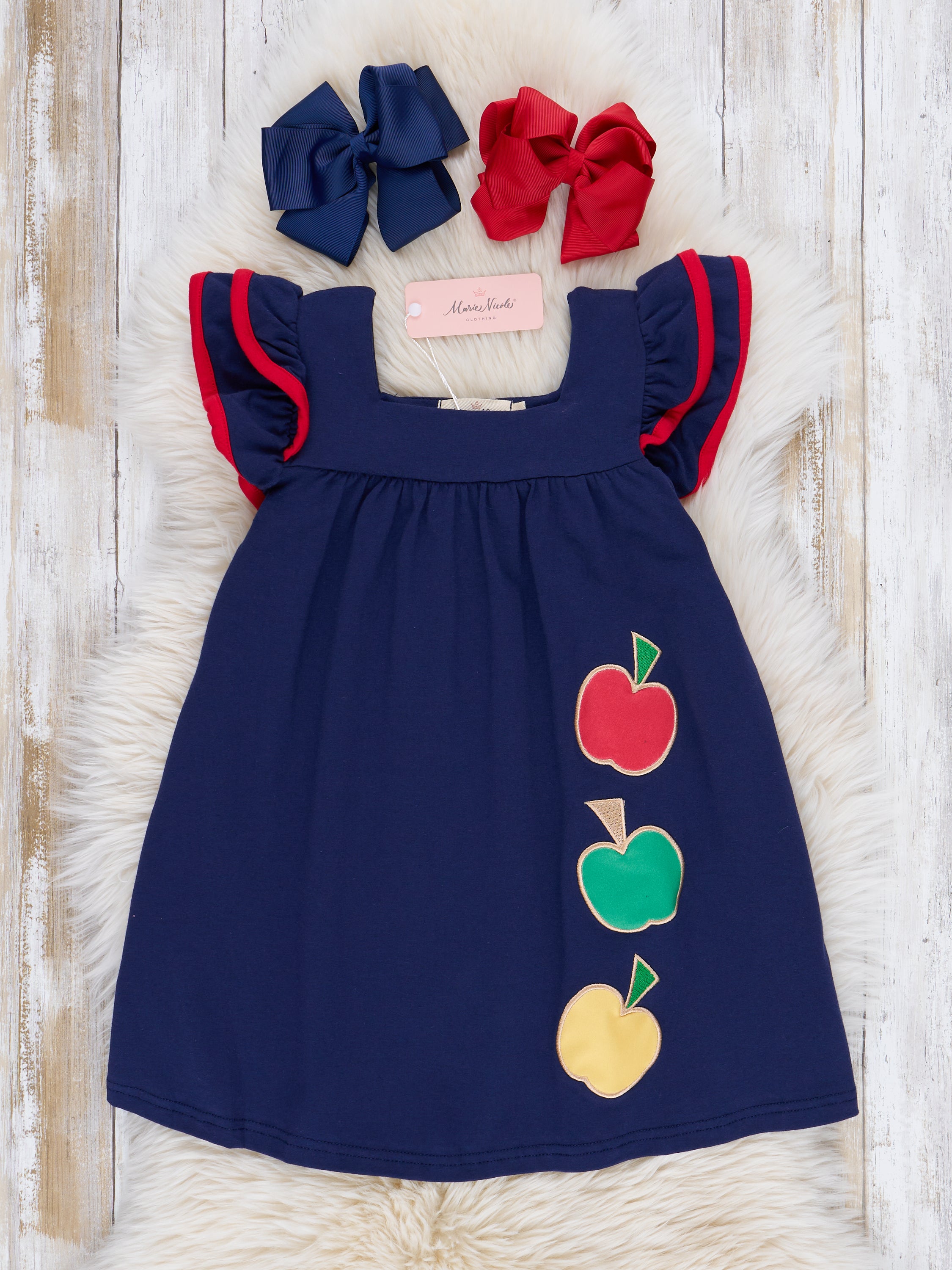 Add a pop of fun with our Navy Falling Apples Ruffle Dress! Perfect for the back-to-school season, this dress features charming embroidered apples in primary colors. The navy blue dress also has eye-catching red ruffle trim sleeves. Get ready to make a stylish statement with this playful dress. š