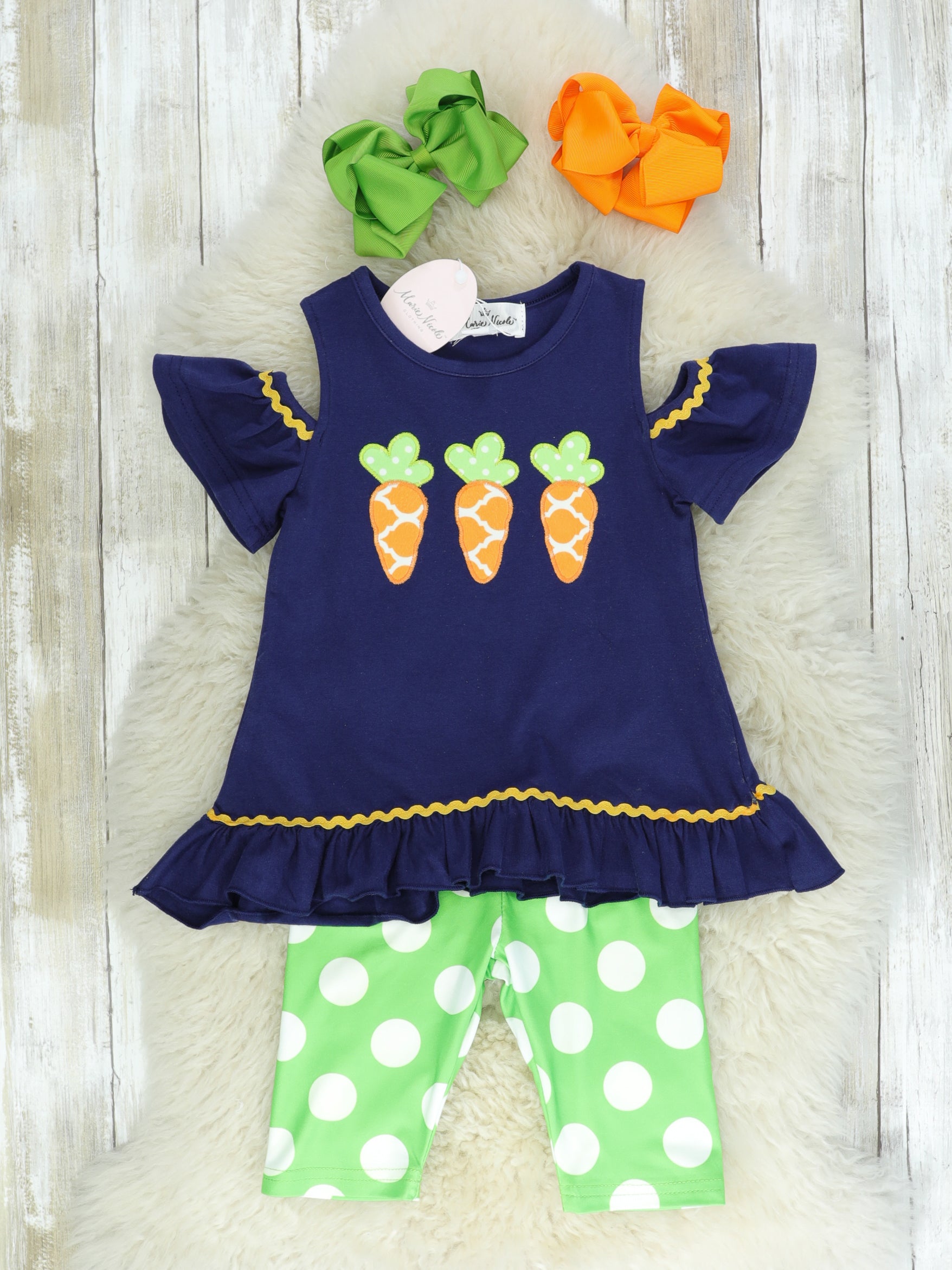 Did somebunny say carrots? This outfit features a cold shouldered navy top with ruffles & carrot appliqués matched with green & white polka dotted bottoms. Shop the sister set here!