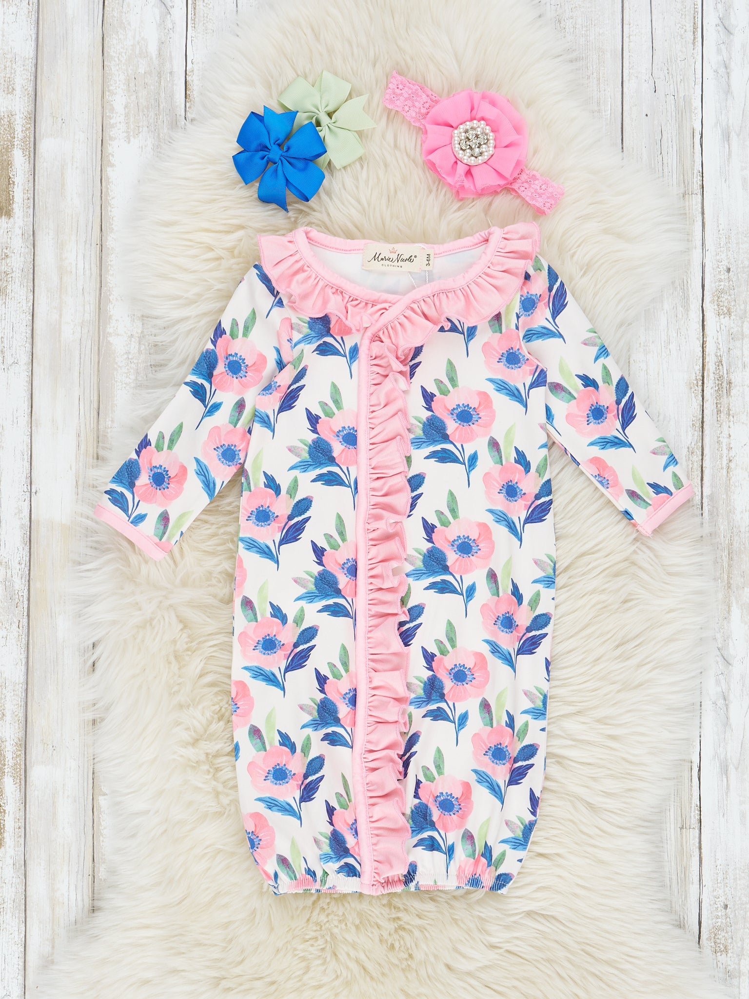 This stunning sister set is perfect for classic floral lovers! Bring baby home in this sweet gown featuring an adorable watercolor floral print and ruffle details at the collar, wrists, and ruffles along the front closure.