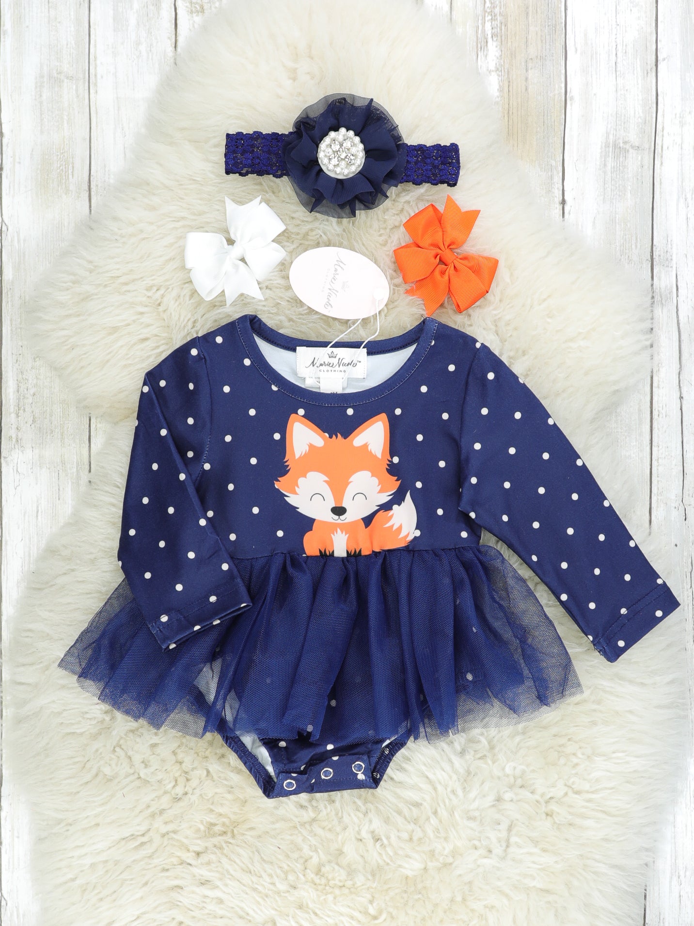 This fabulous fox set is a sight FUR sore eyes! This navy dress bubble features polka dots, an adorable fox appliqué, & tulle.