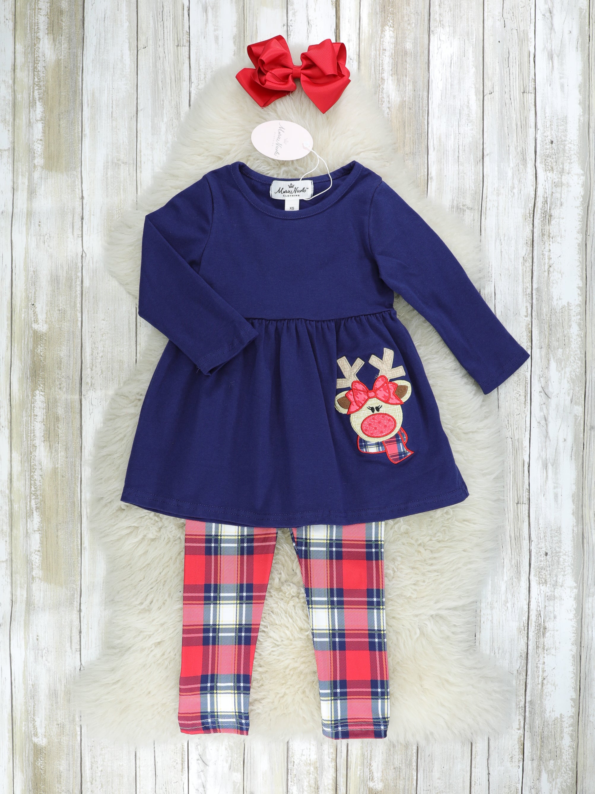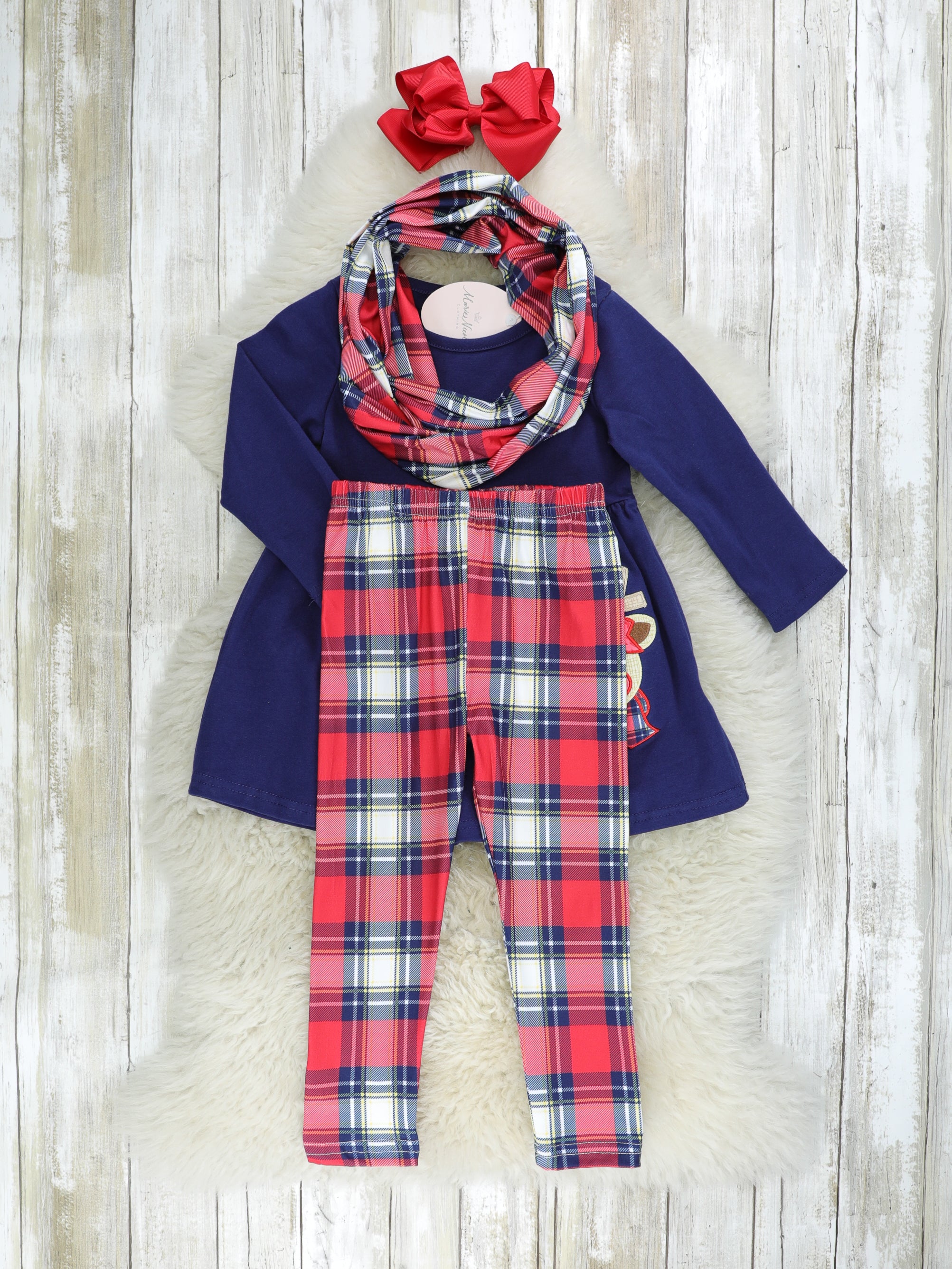 This darling outfit lights up this Christmas season! This outfit features a navy peplum top with a sassy reindeer detail & plaid pants with a matching scarf.