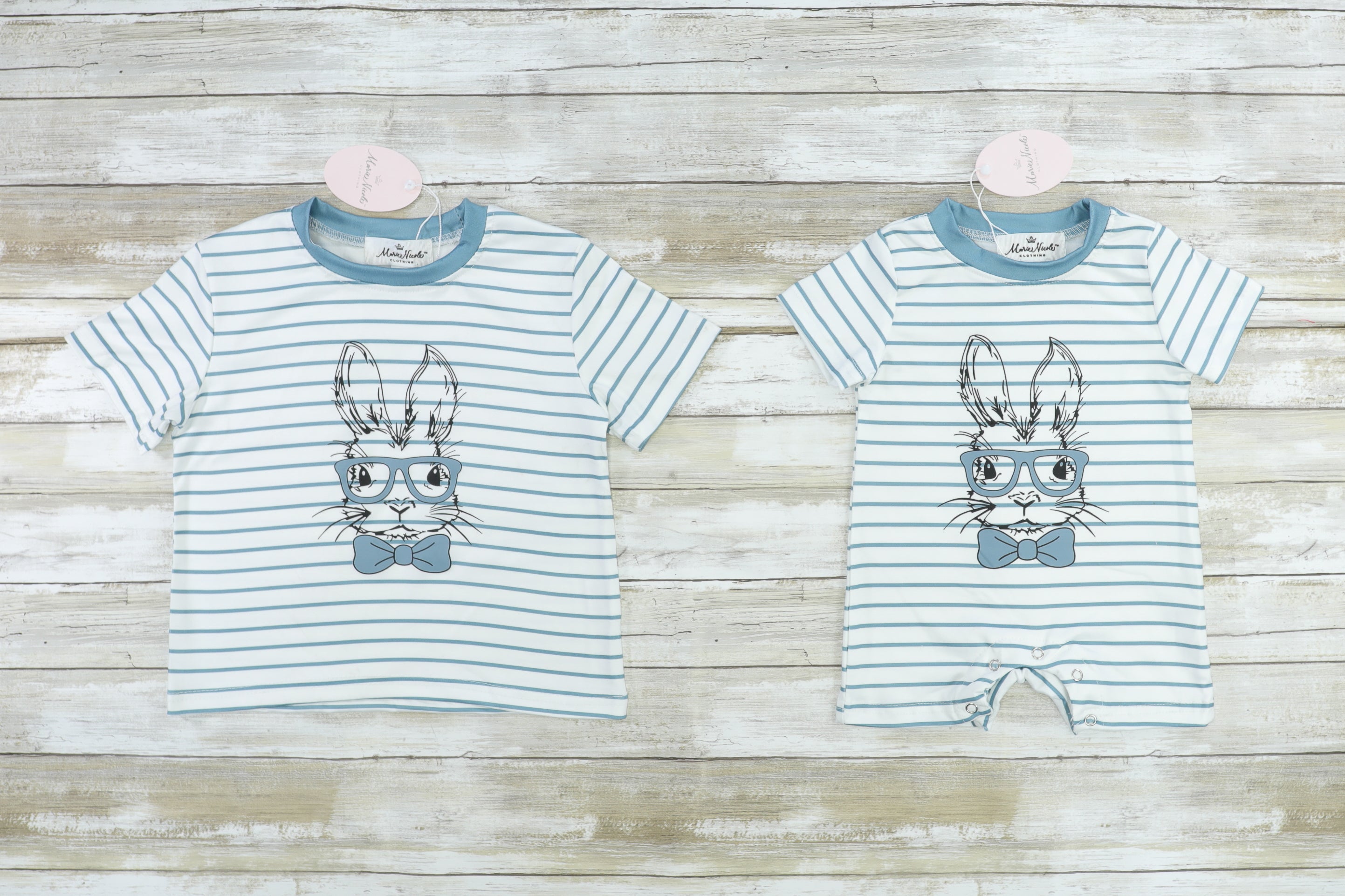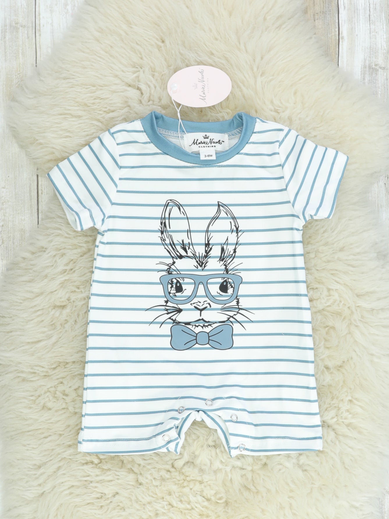A bunny with style! This romper features blue stripes, a "nerdy bunny" detail, & snap buttons. Shop the brother set here!