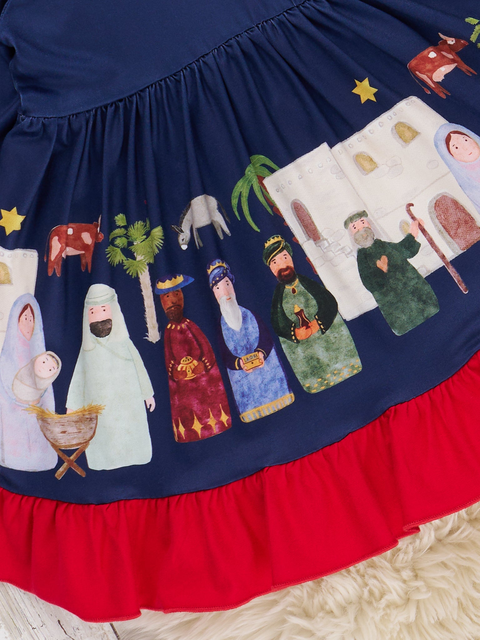 The Night of Nativity Ruffle Dress brings the story of Christmas to life! The scene on the skirt is a wonderful gathering of all the important characters at Jesus's birth. The scalloped collar and ruffled skirt edge give a festive flare that is perfect for the holidays. Make any day special for your little girl with this lovely dress by Marie Nicole Clothing!