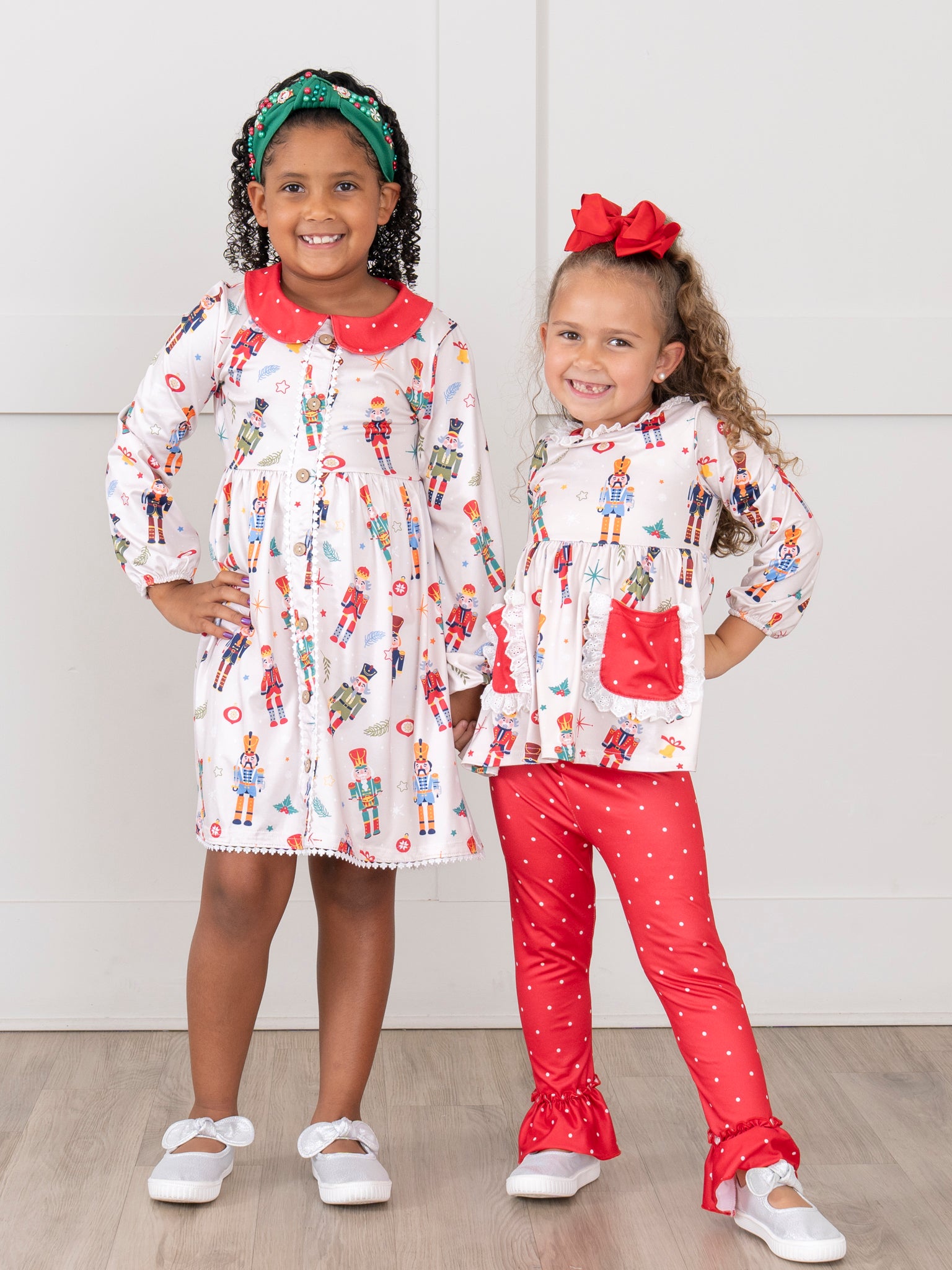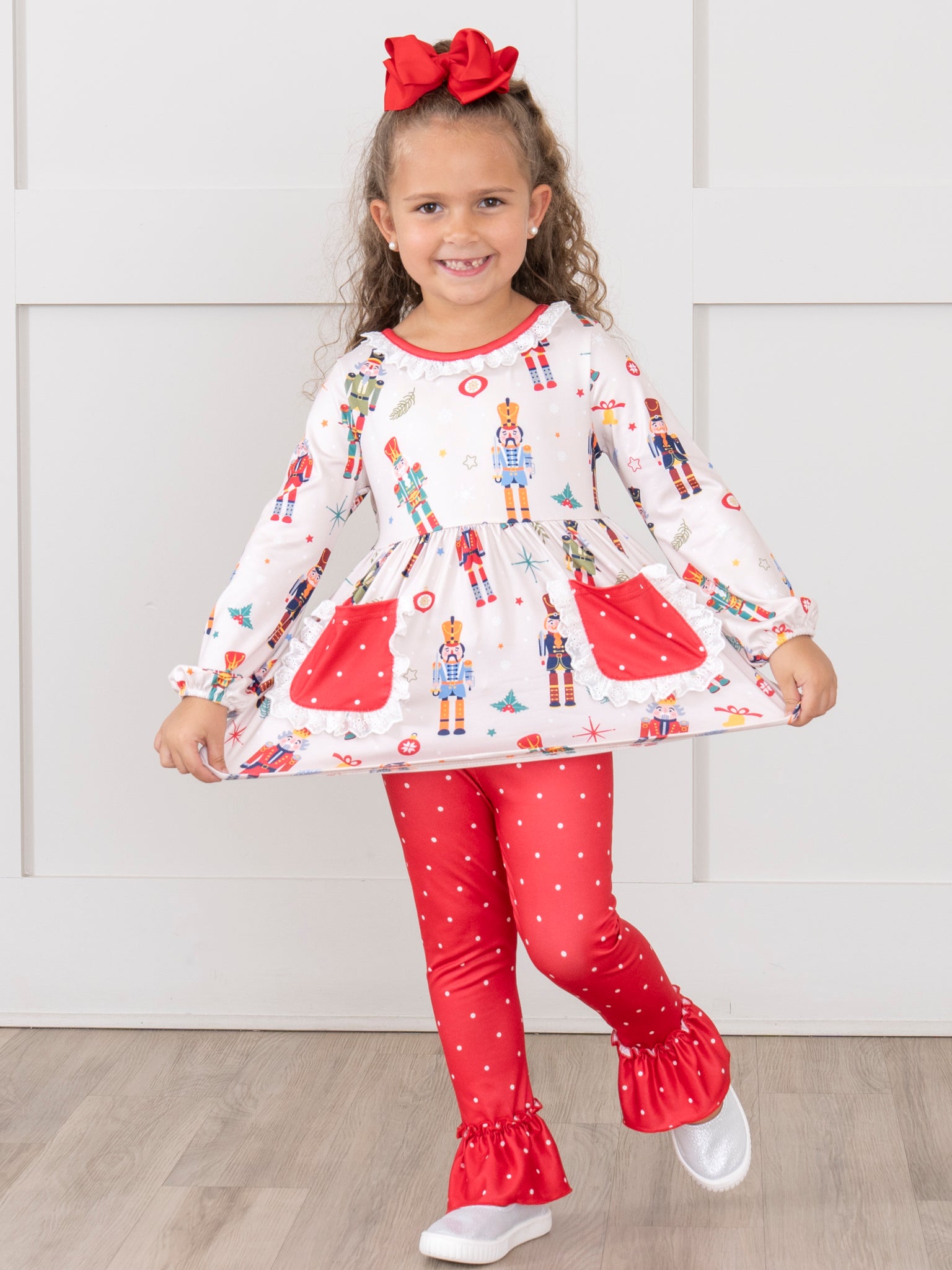 Get ready to jingle all the way with our Nutcracker Dreams Pocket sister set! This outfit features a festive nutcracker print top and a charming polka dot ruffle pants. Perfect for the holiday season and spreading Christmas cheer.