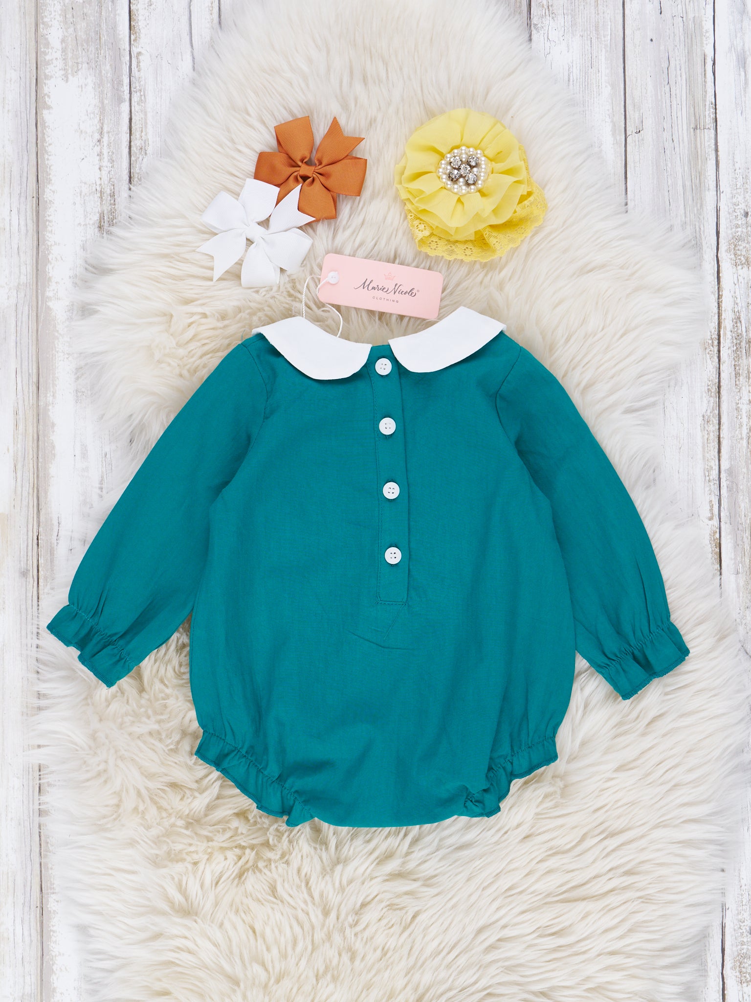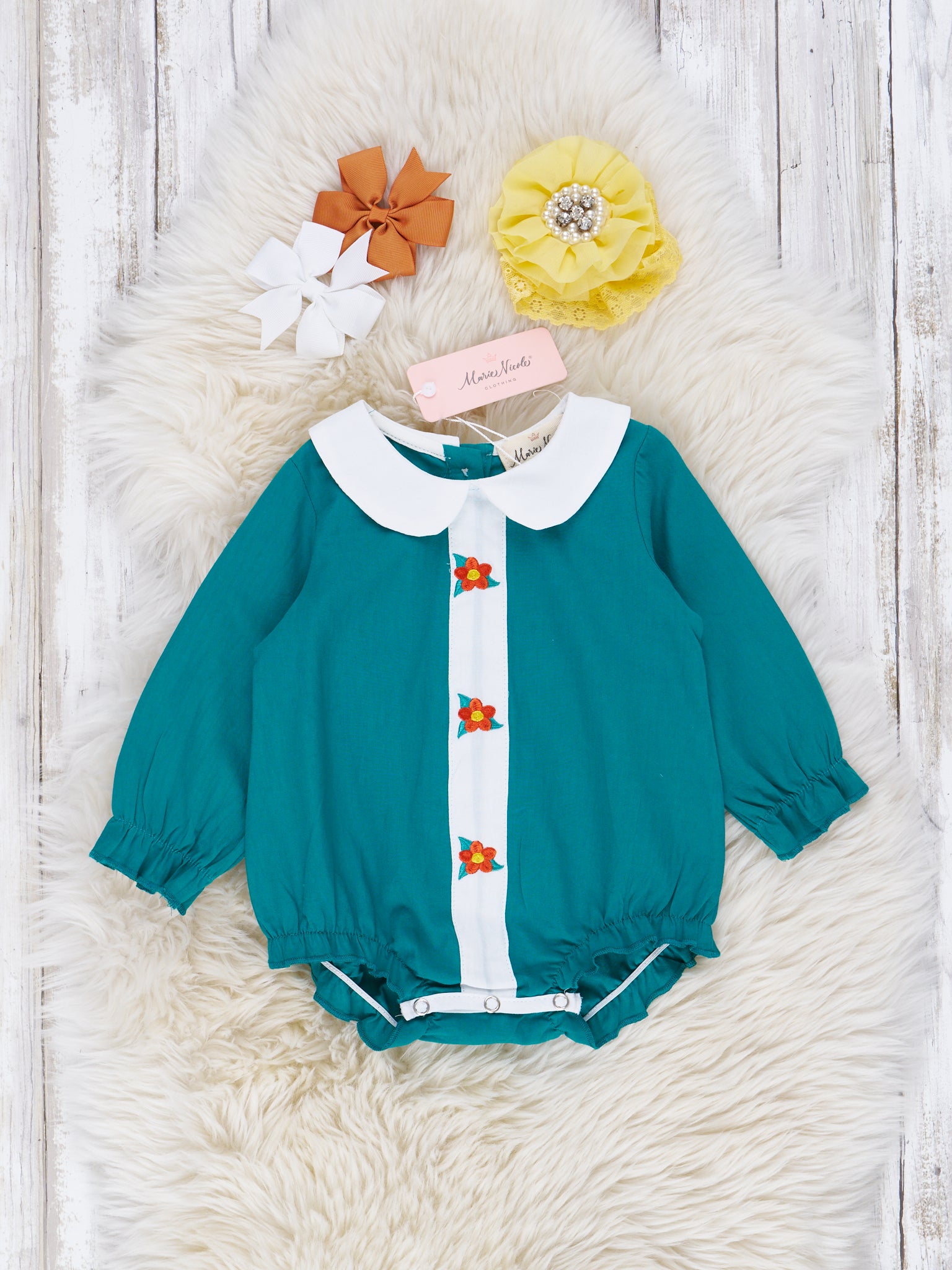 Let your little ones take a dip in the style pool this fall in this ocean blue floral romper! Whether a matchy-matchy moment or a mix-and-match look, this sister set is sure to be a hit! Kids will look absolutely bloomin' gorgeous with these embroidered flower details and a dainty peter pan collar. Cuter than a button with functioning buttons down the back. Now, that's a blossom of style!