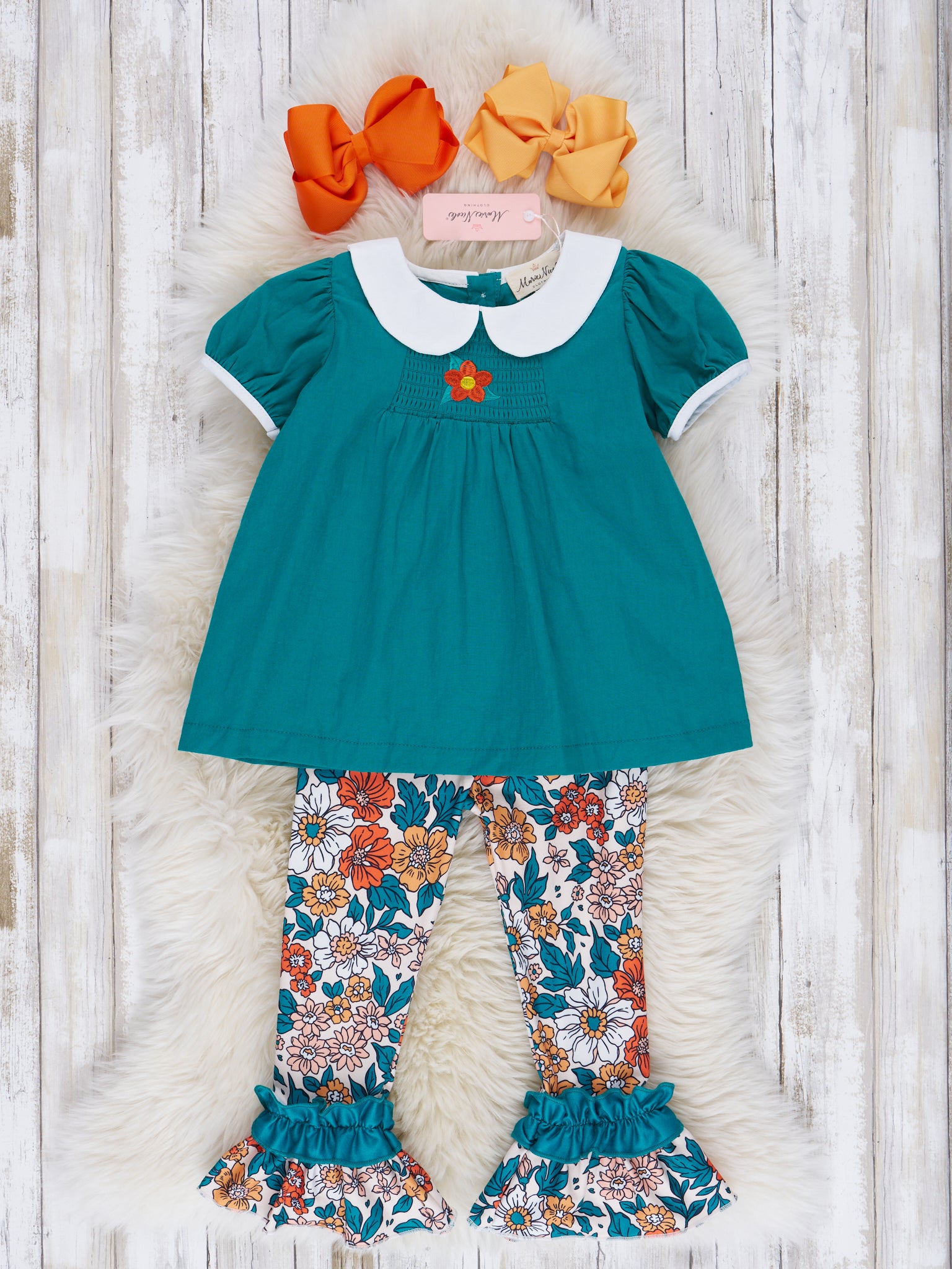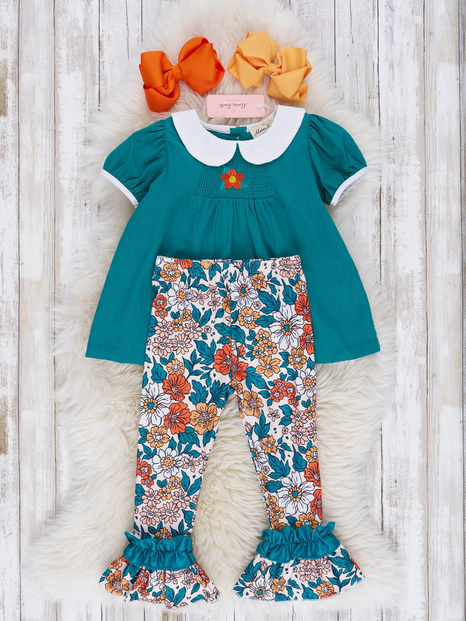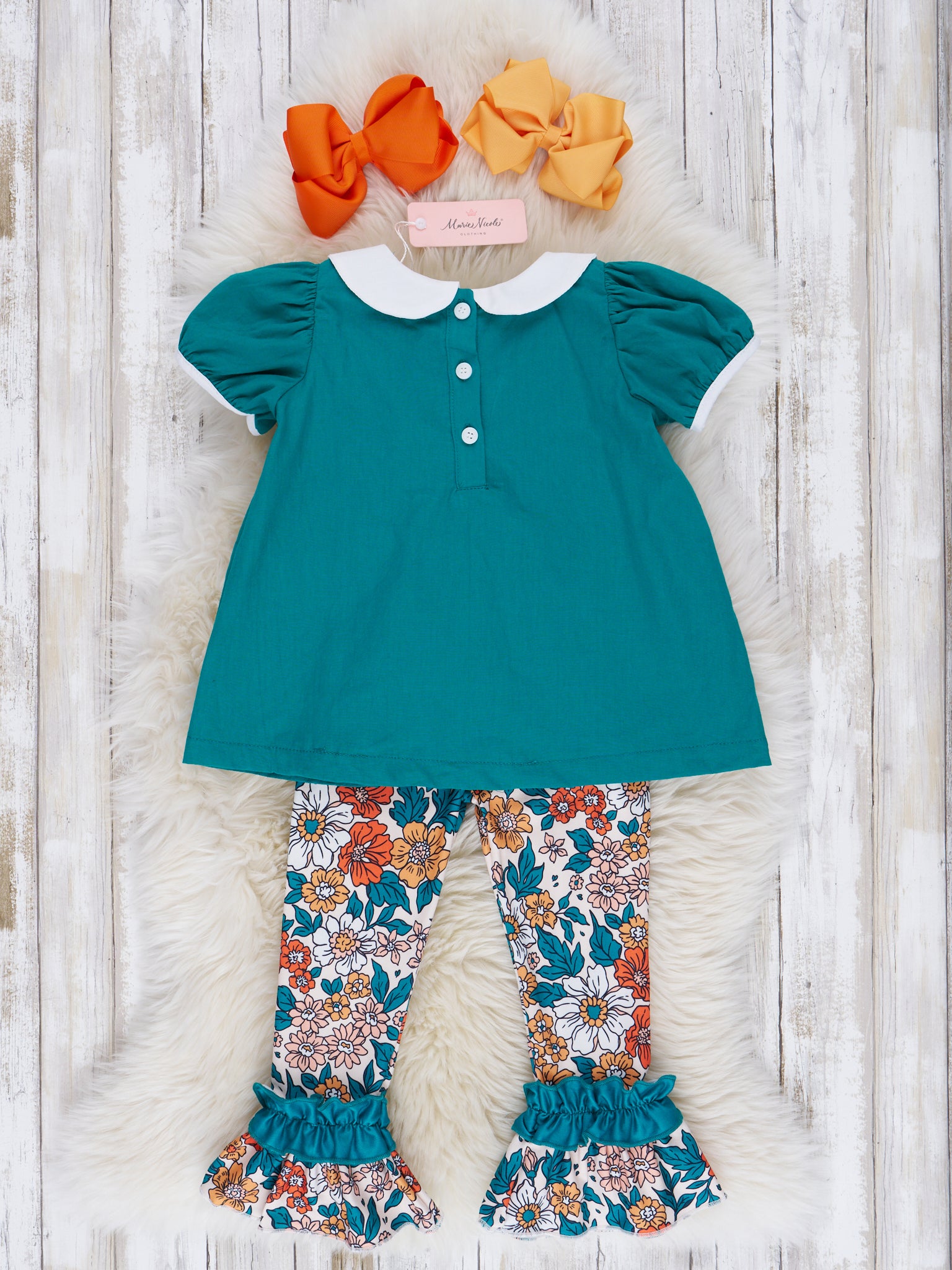Let your little ones take a dip in the style pool this fall in this ocean blue floral ruffle outfit! Whether a matchy-matchy moment or a mix-and-match look, this sister set is sure to be a hit! Kids will look absolutely bloomin' gorgeous with these flower details and a dainty peter pan collar. Cuter than a button with functioning buttons down the back. Now, that's a blossom of style!