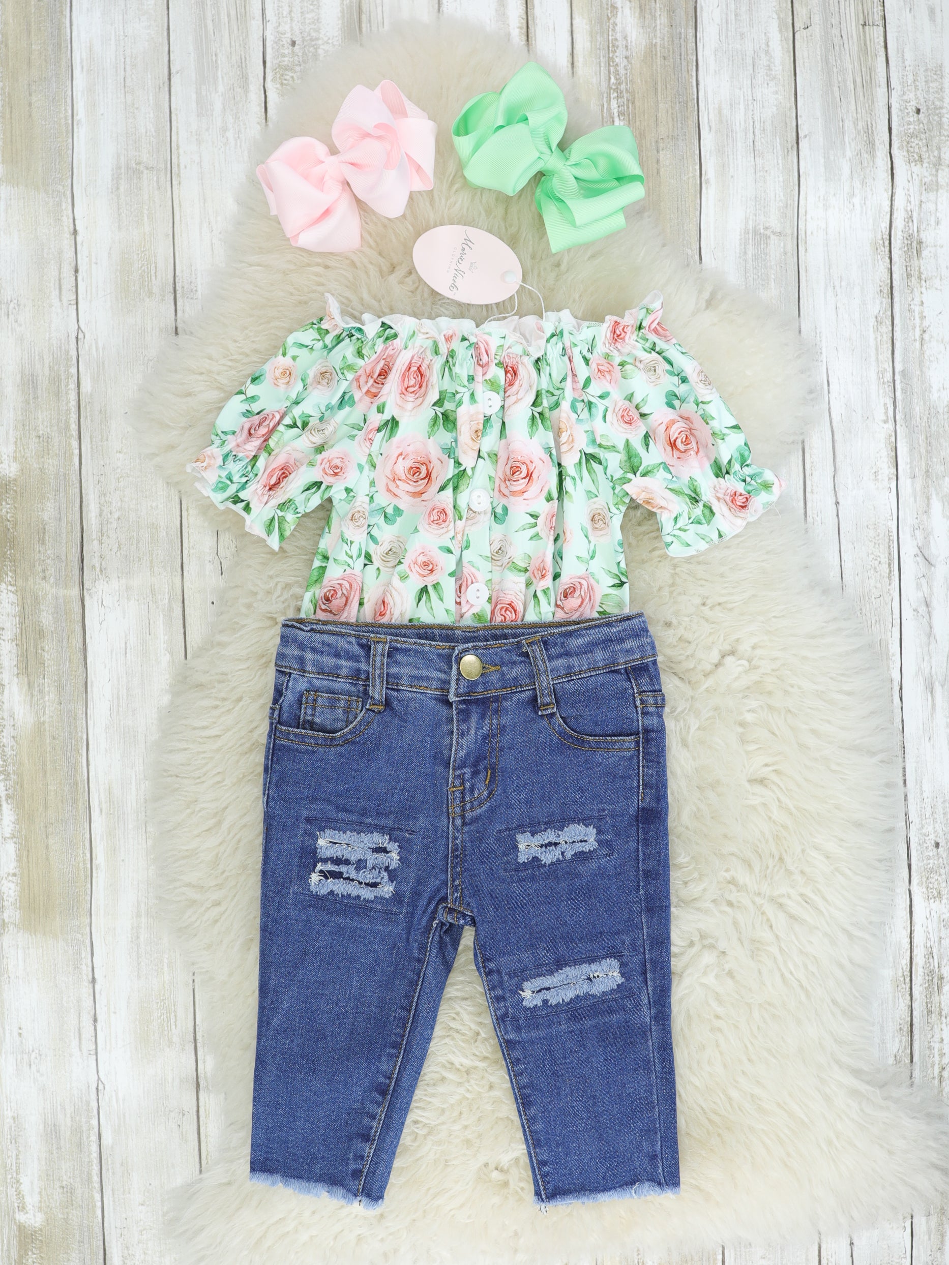 Off-the-shoulder Rose Top & Distressed Denim Outfit