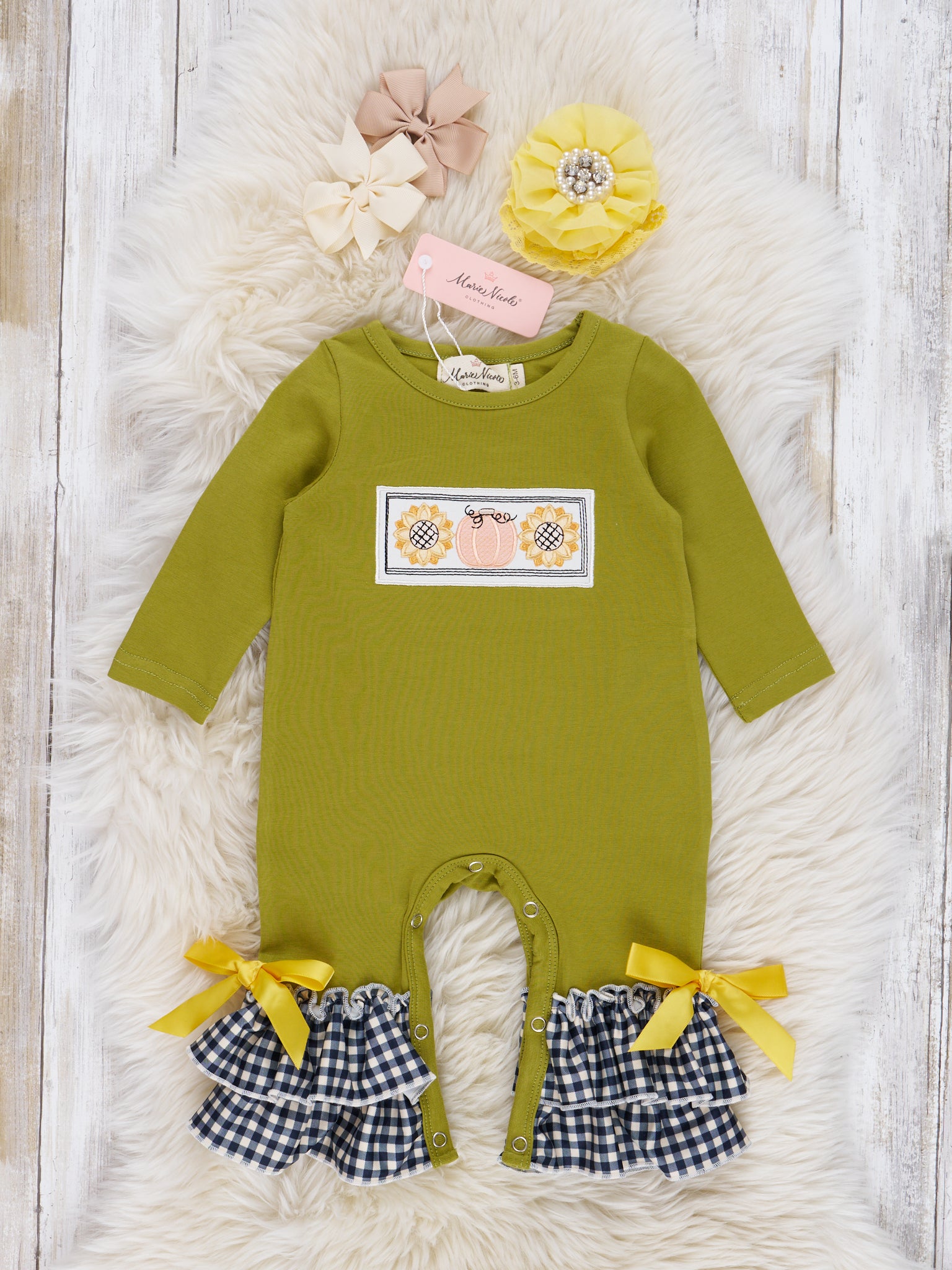 This Olive Embroidered Sunflower Gingham sister set is a picnic-perfect look! Featuring signature black & white gingham and delicate embroidered sunflowers, it's sure to have 'em sunflower-smiling. Slay the day with this stylish ruffle romper – you'll be gingham-gorgeous!