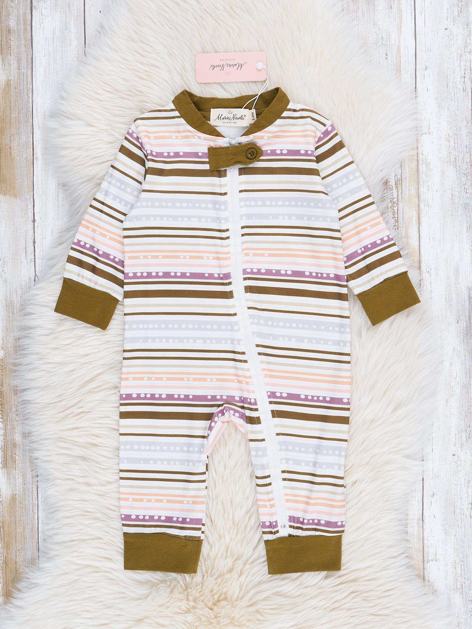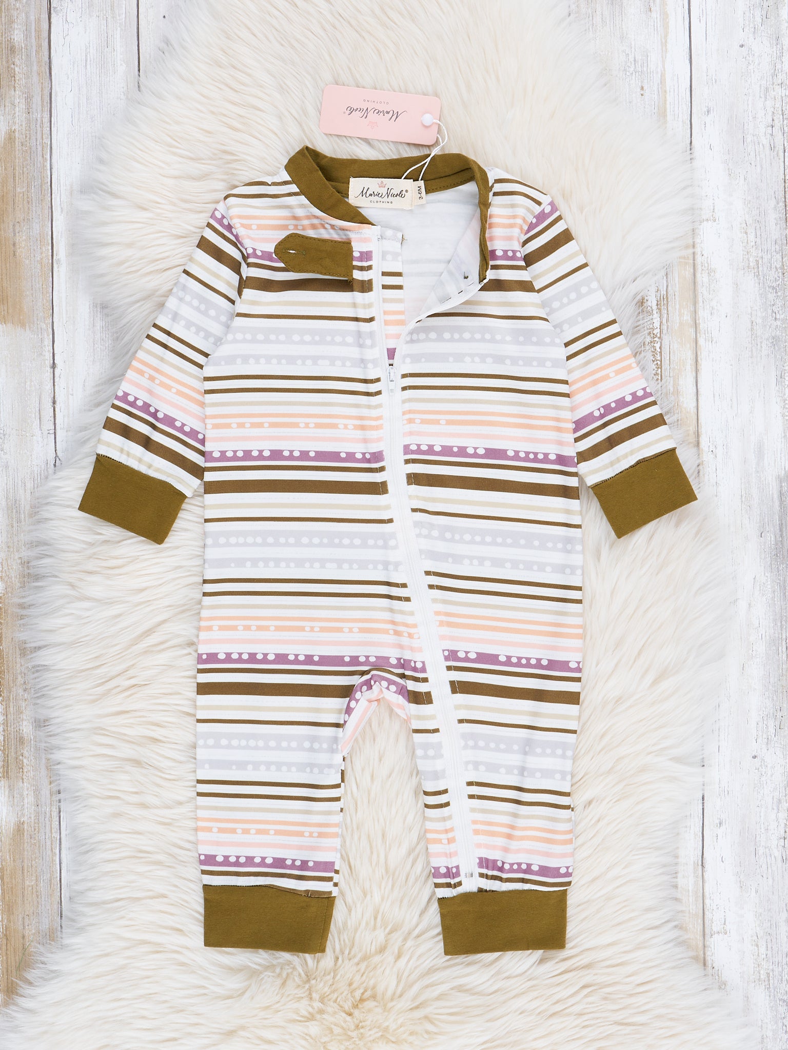 Get your stripes on with our Olive Stripes Sleeper Romper! This playful one-piece features a unique asymmetrical zipper and trendy olive trim for a fun twist on a classic design. Stay stylish and comfy all day long.