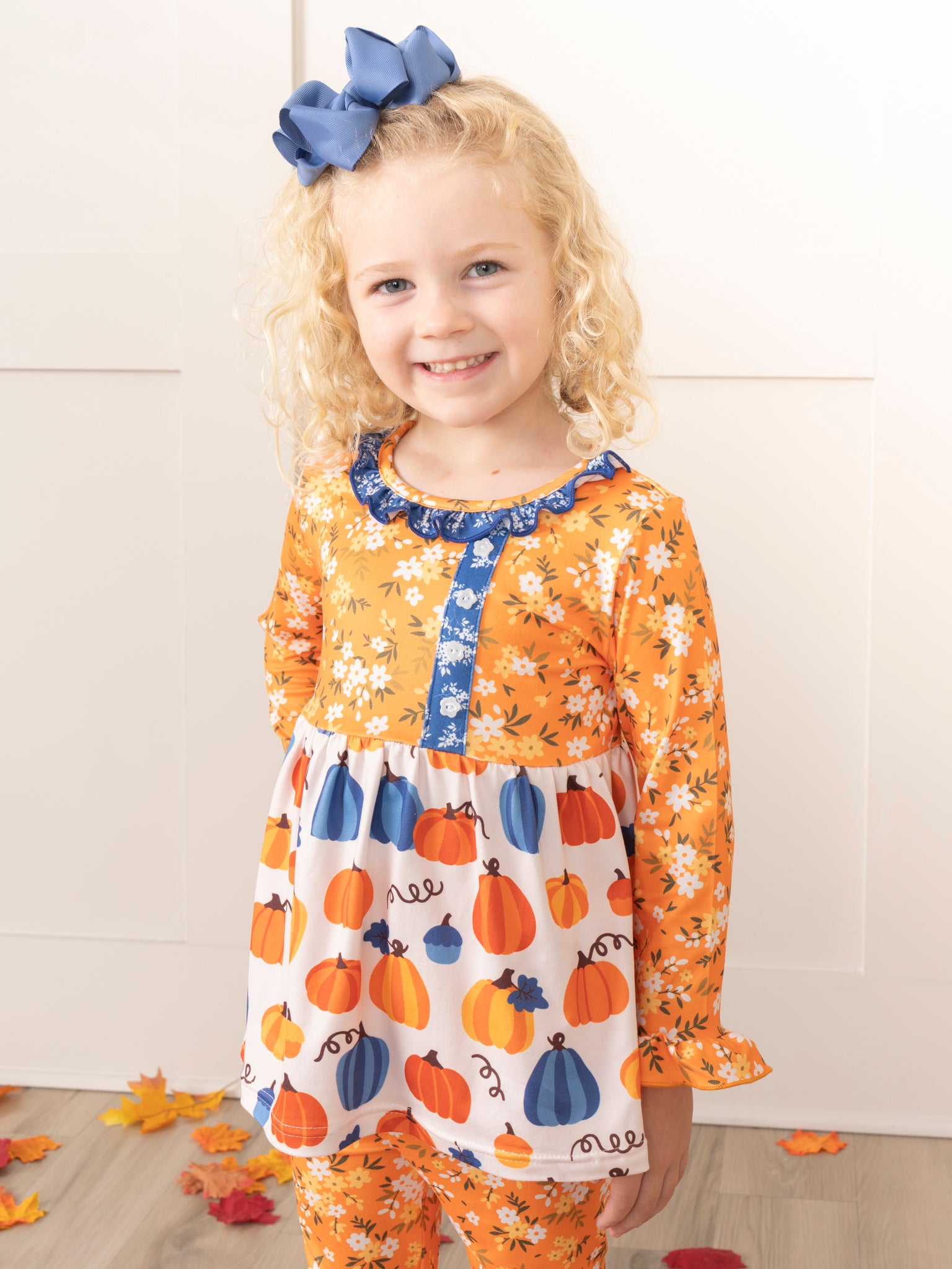 Get ready for fall with this pumpkin spice sister set. This girls outfit features a chic Orange floral bodice and a playful pumpkin flare top. Match it with the coordinating orange floral pants for a stylish and comfy look. Perfect for any adventure this season!