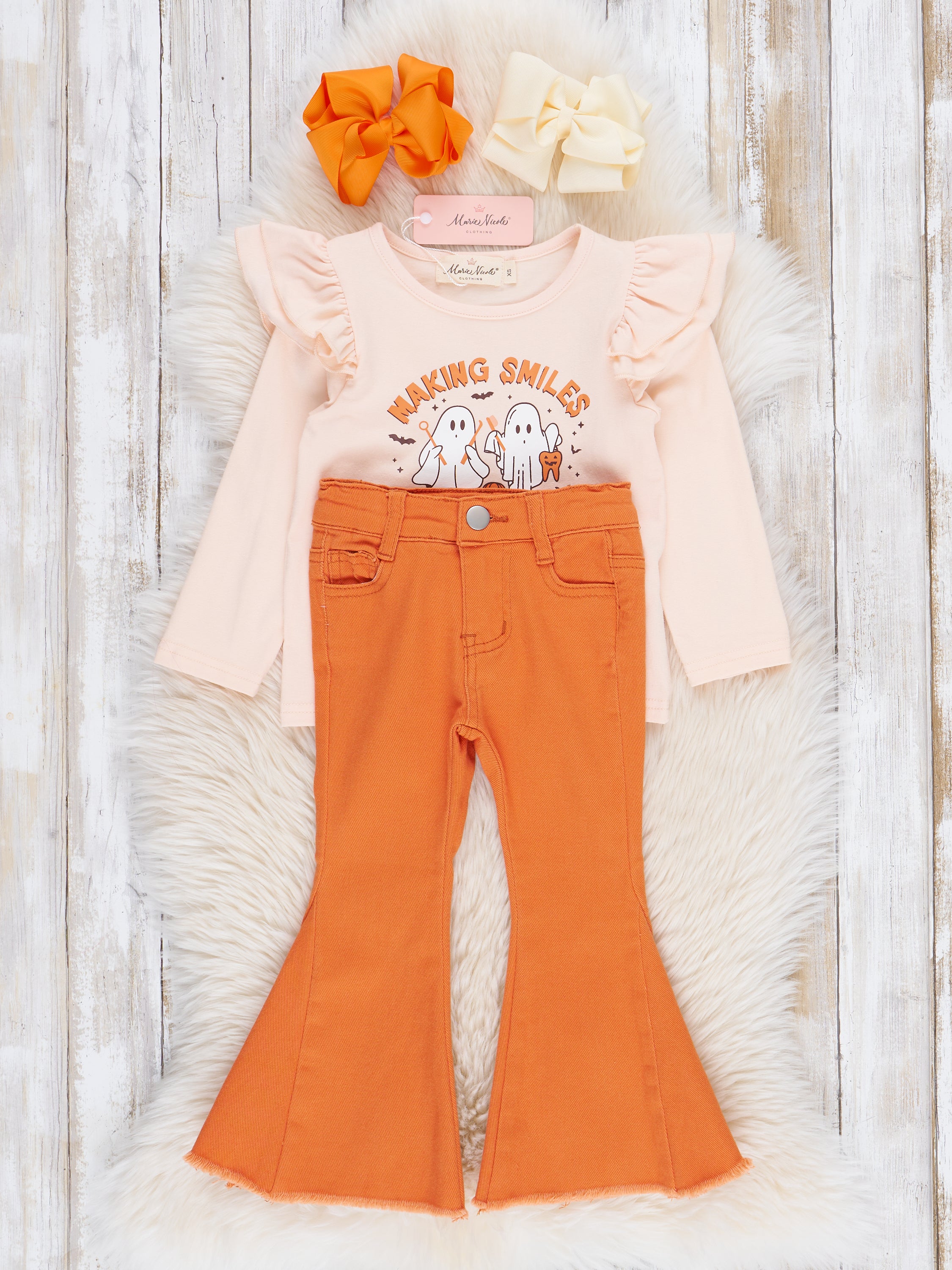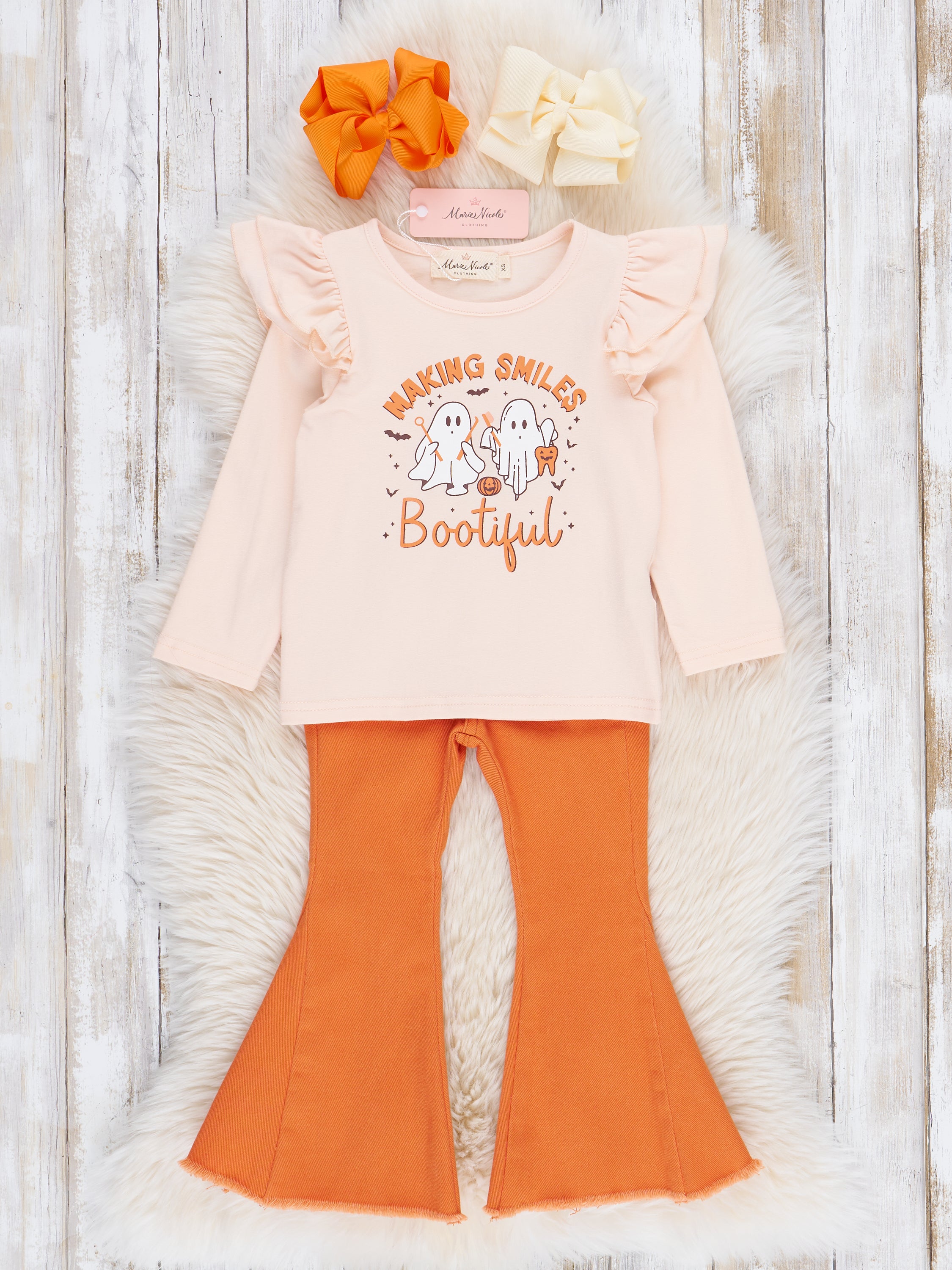 Spice up your little one's Halloween with our "Bootiful" Bell Bottom Outfit! This girls' outfit features a peach ruffle shoulder top and vibrant orange bell bottoms, perfect for a fun and festive look. Get ready for some serious trick-or-treating in style!