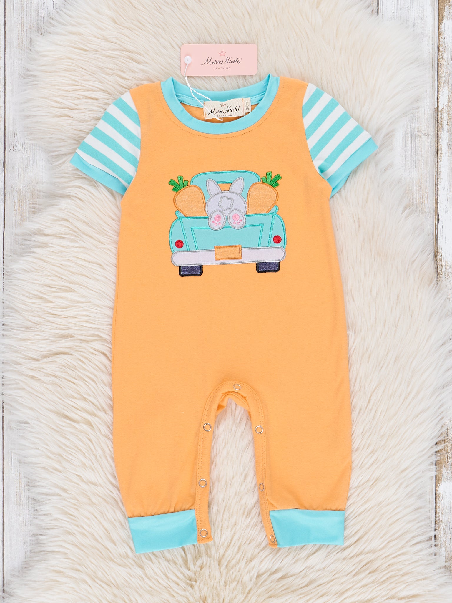 This adorable sibling set by Marie Nicole Clothing is simply ear-resistible! This orange romper features a sweet bunny truck appliqué, blue trim, & striped raglan sleeves.