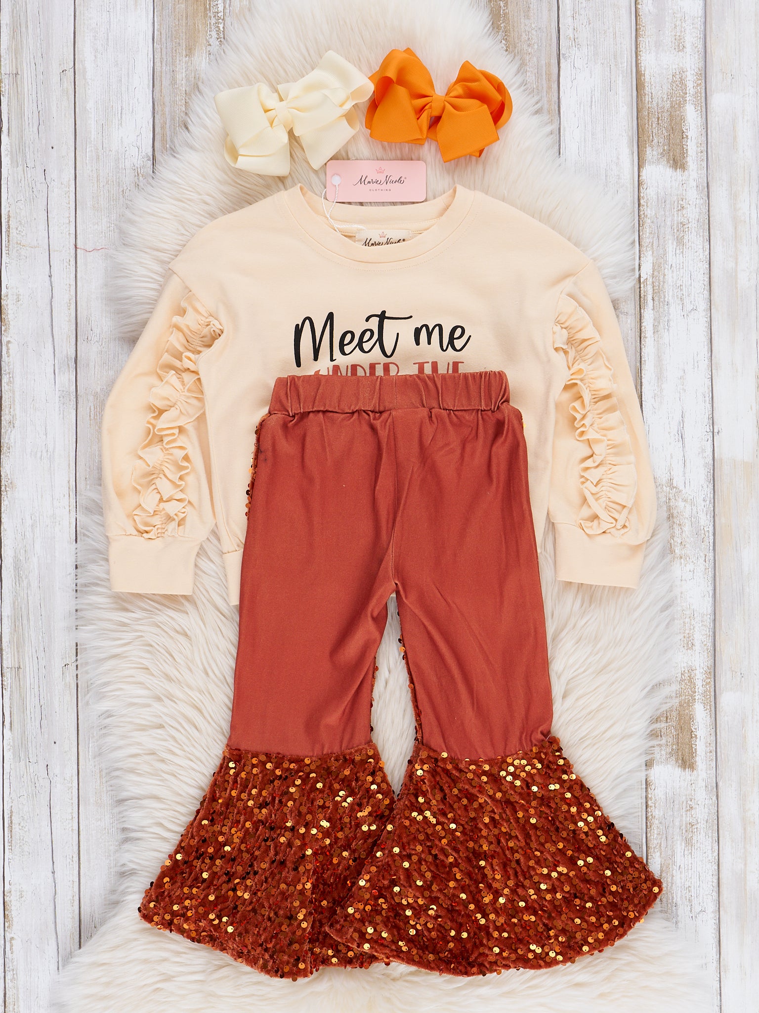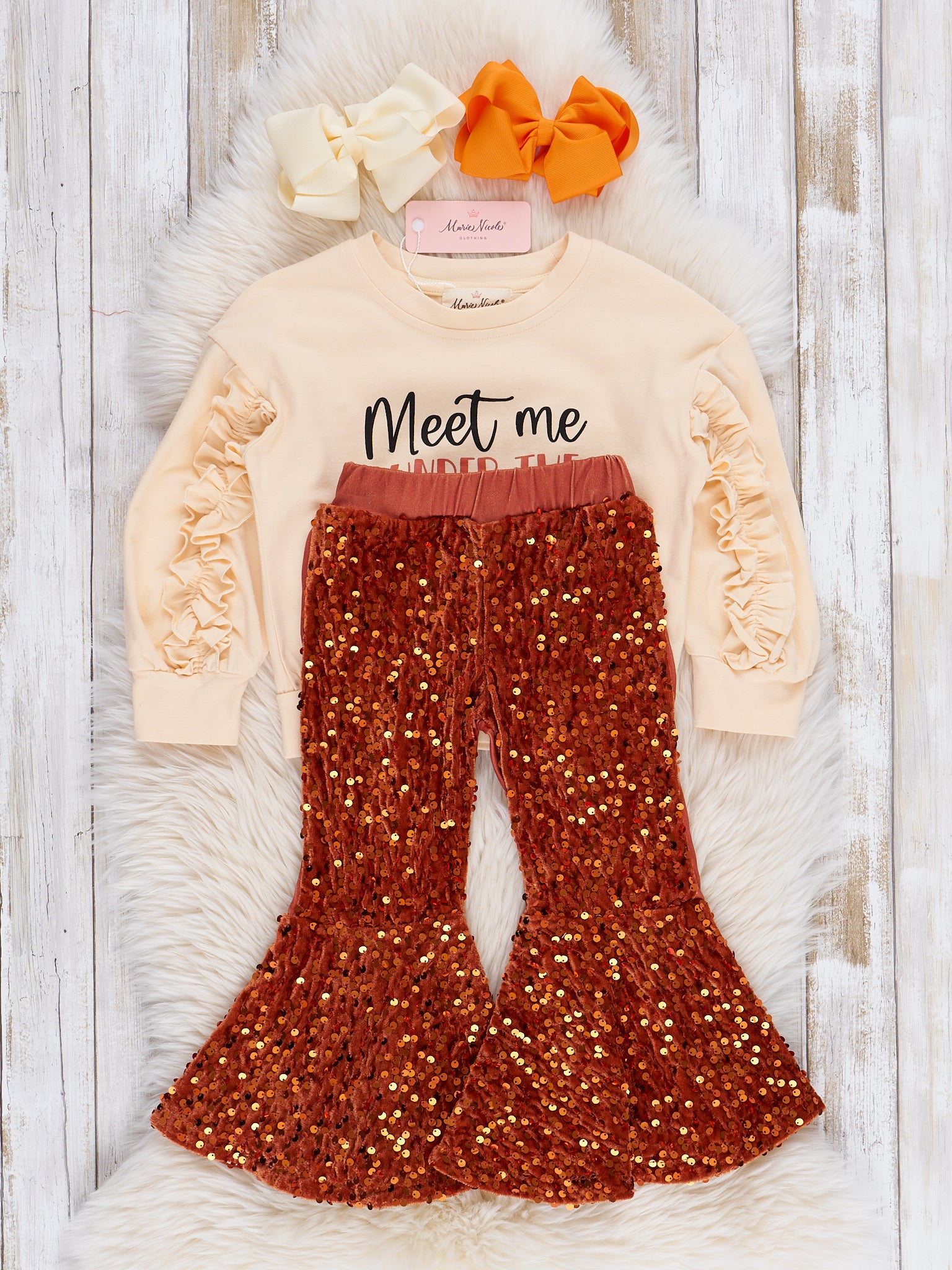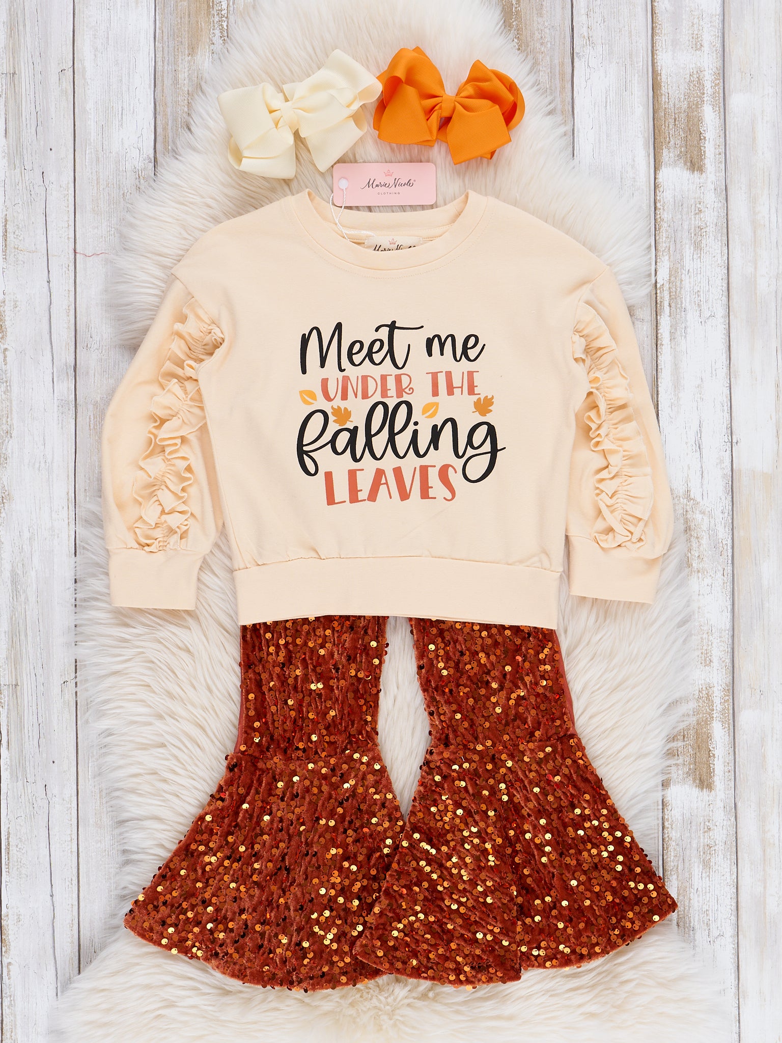 Say hello to fall with our Orange Falling Leaves Sequin Bell Bottoms Outfit! This girls' outfit features a cream ruffle sleeve top and eye-catching orange sequin bell bottoms. Make a statement and meet us under the falling leaves! 🍂
