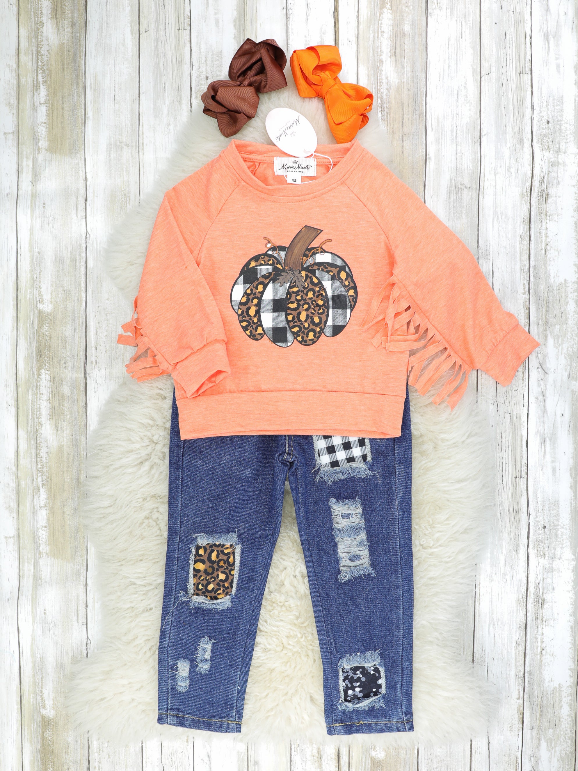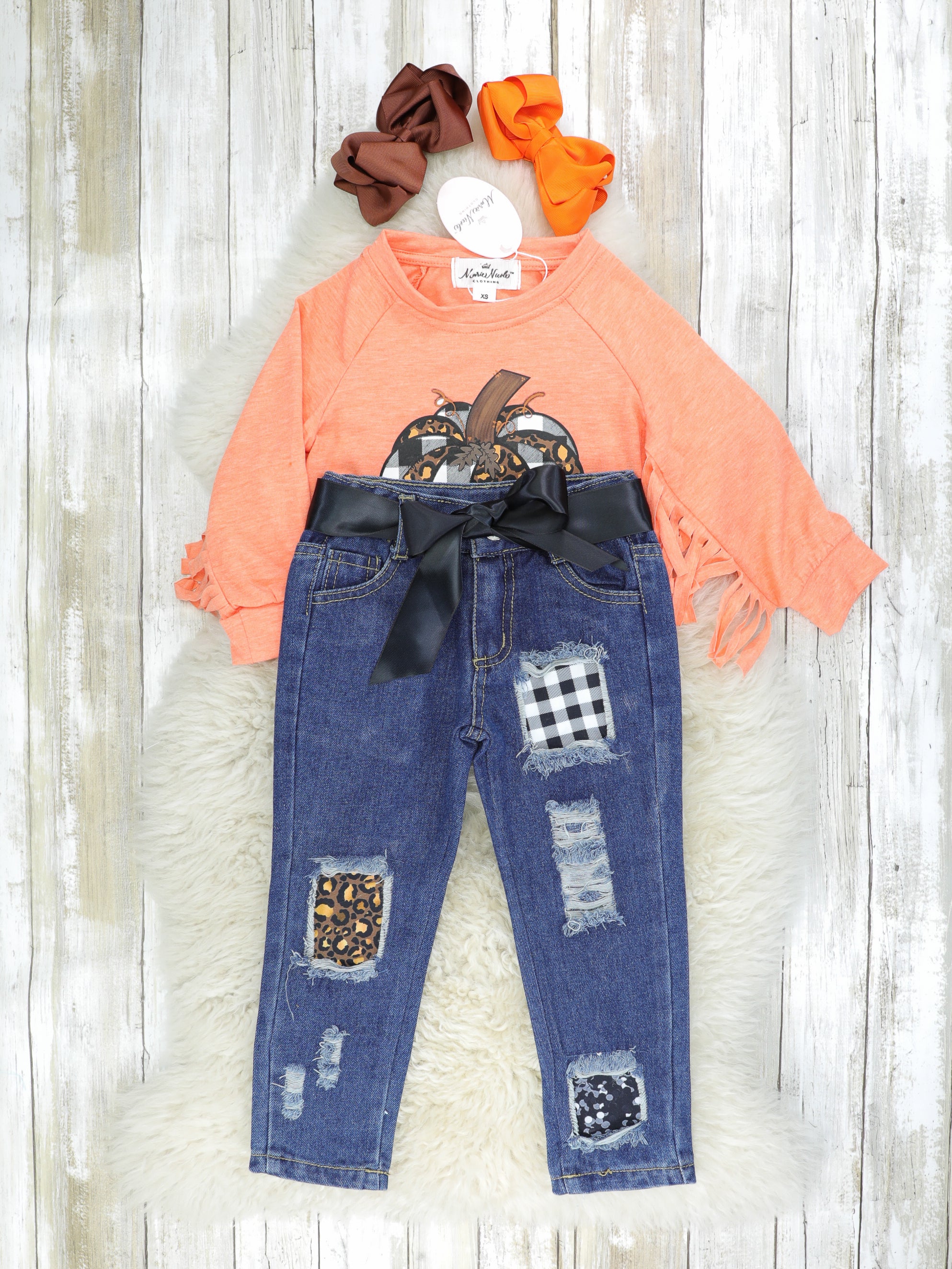 The sweetest outfit for your trendsetters! This outfit features an orange top with a glitter gingham pumpkin & fringe details. The distressed denim pants have glitter and gingham patches with a black ribbon belt.