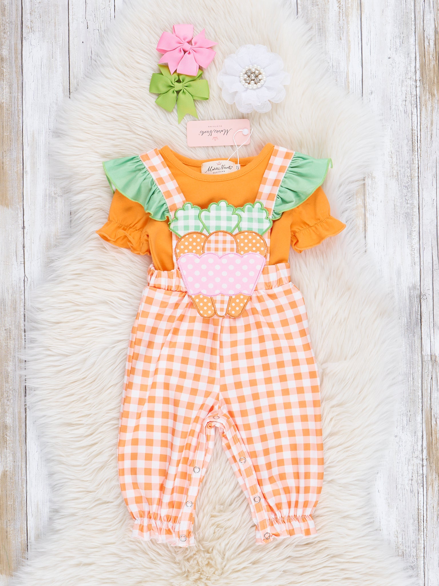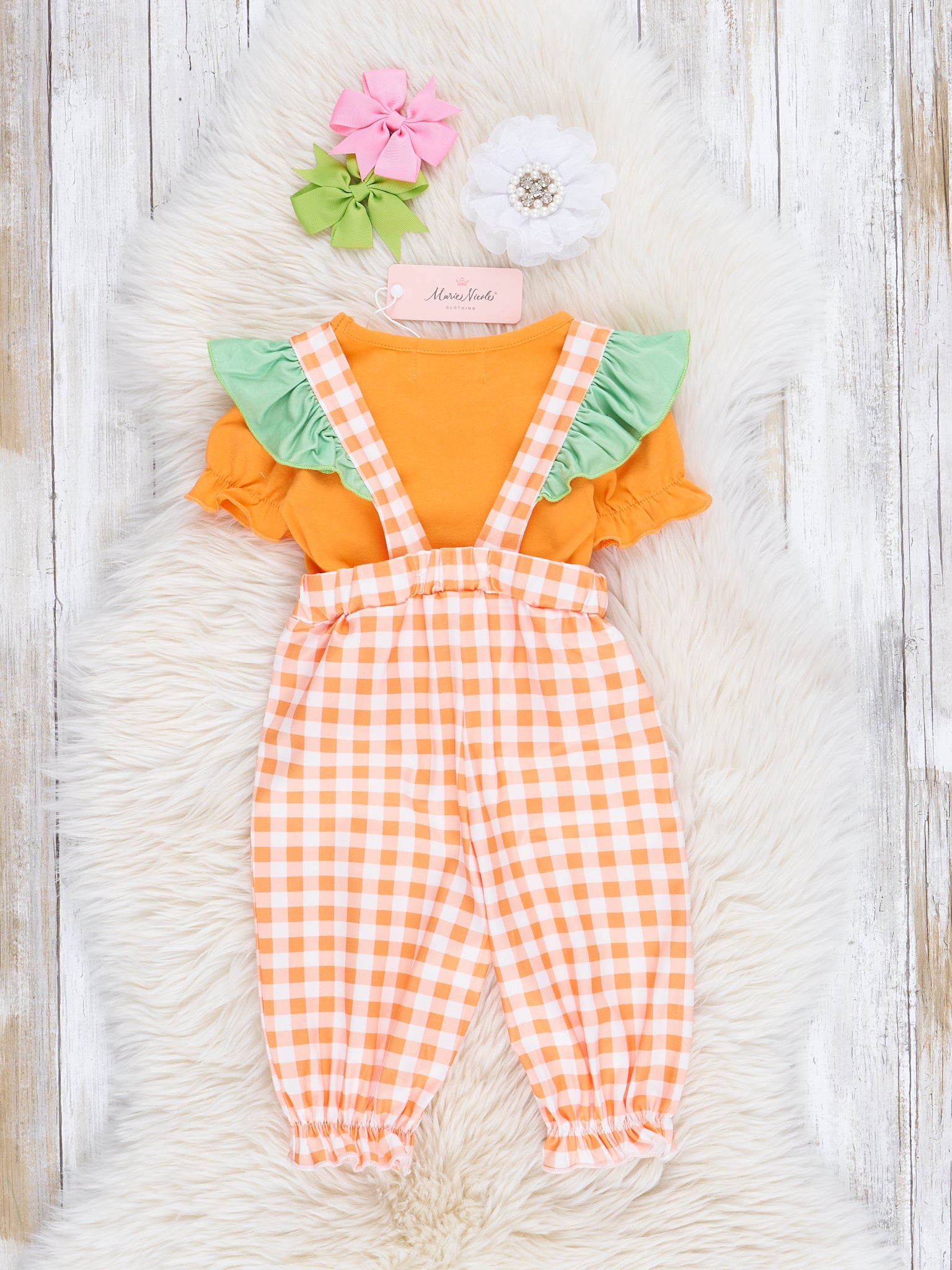 Add some zest to your wardrobe with our Orange Gingham Embroidered Carrot Overalls Set. The playful gingham print and embroidered carrot design will have your little one looking stylish and fun-loving. Say goodbye to boring outfits, and hello to a whimsical addition to your closet from Marie Nicole Clothing! Shop the set!