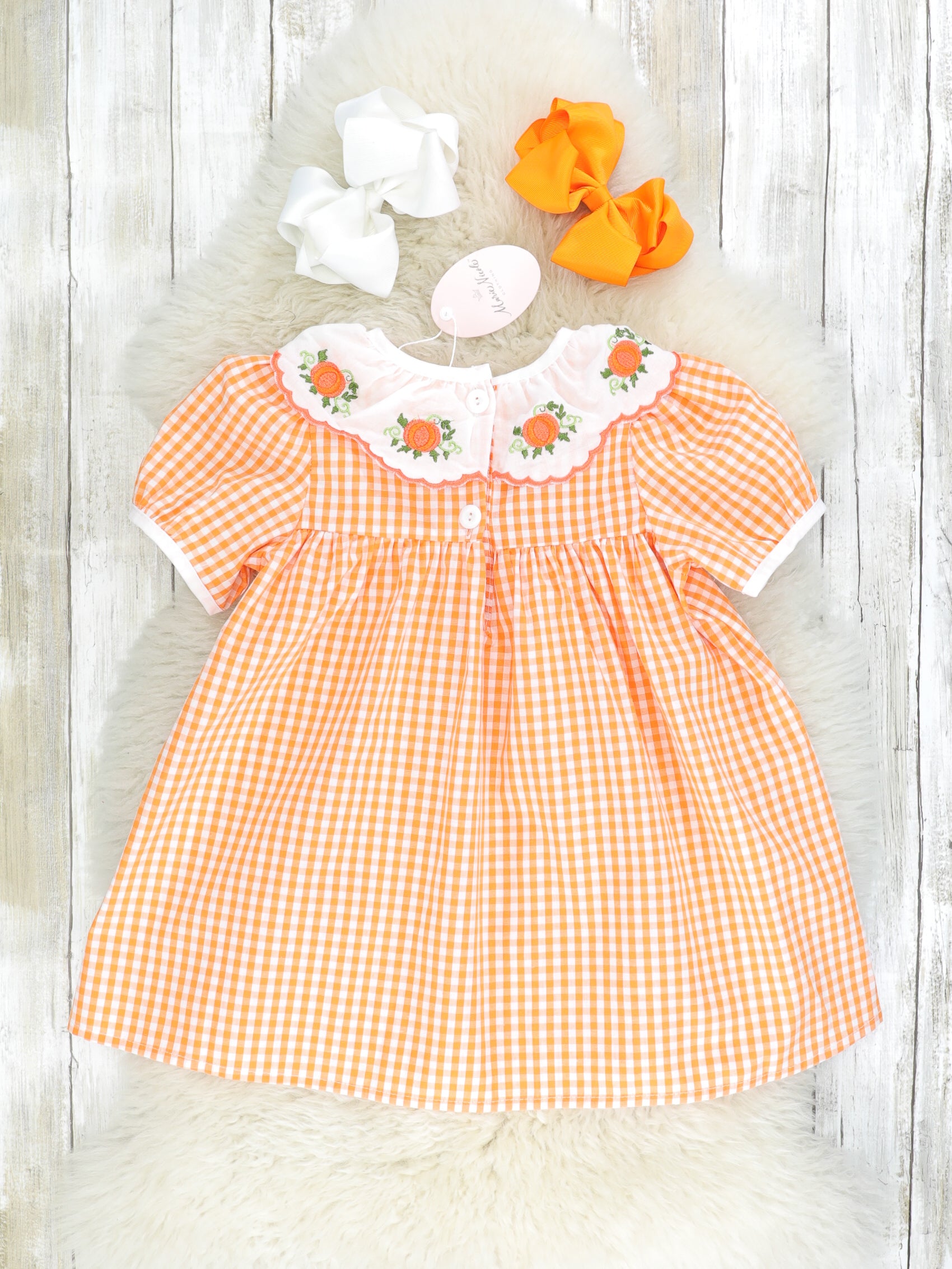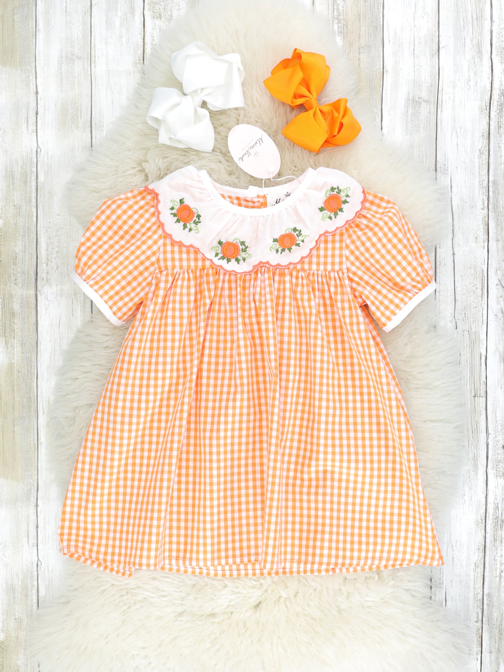 Orange you glad to see this adorable dress? This checked dress features embroidered pumpkins & a round ruffle neckline.