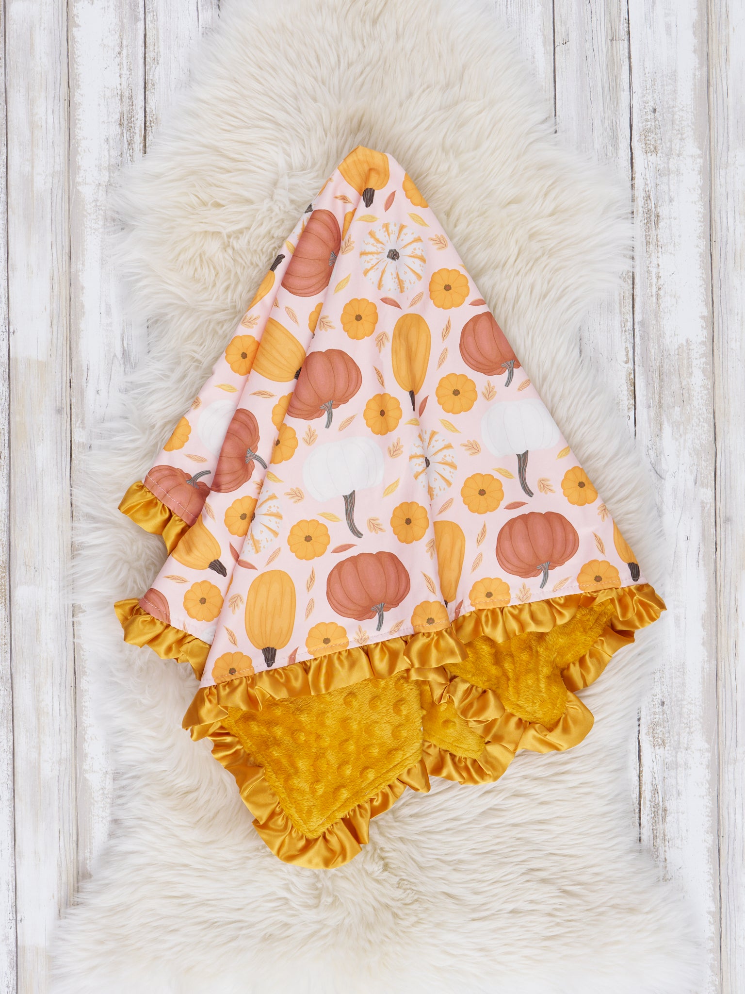 Keep your little ones cozy and keep fall vibes alive with this one-of-a-kind Orange Gourds Ruffle Minky Blanket! From the plush gourd details to the golden ruffle hem and shiny golden minky side, this blanket will bring warmth and plenty of "awwww!"s. Perfect for both children and adults alike!