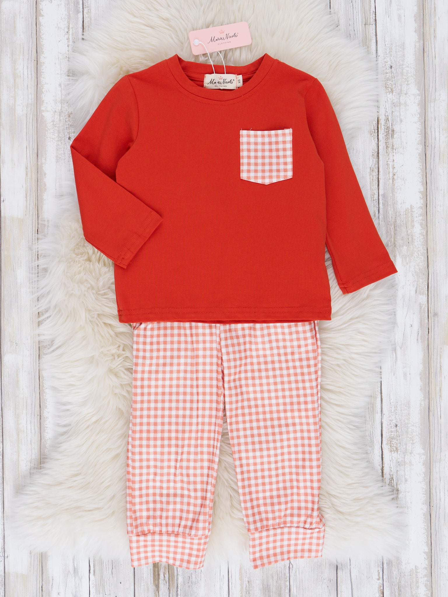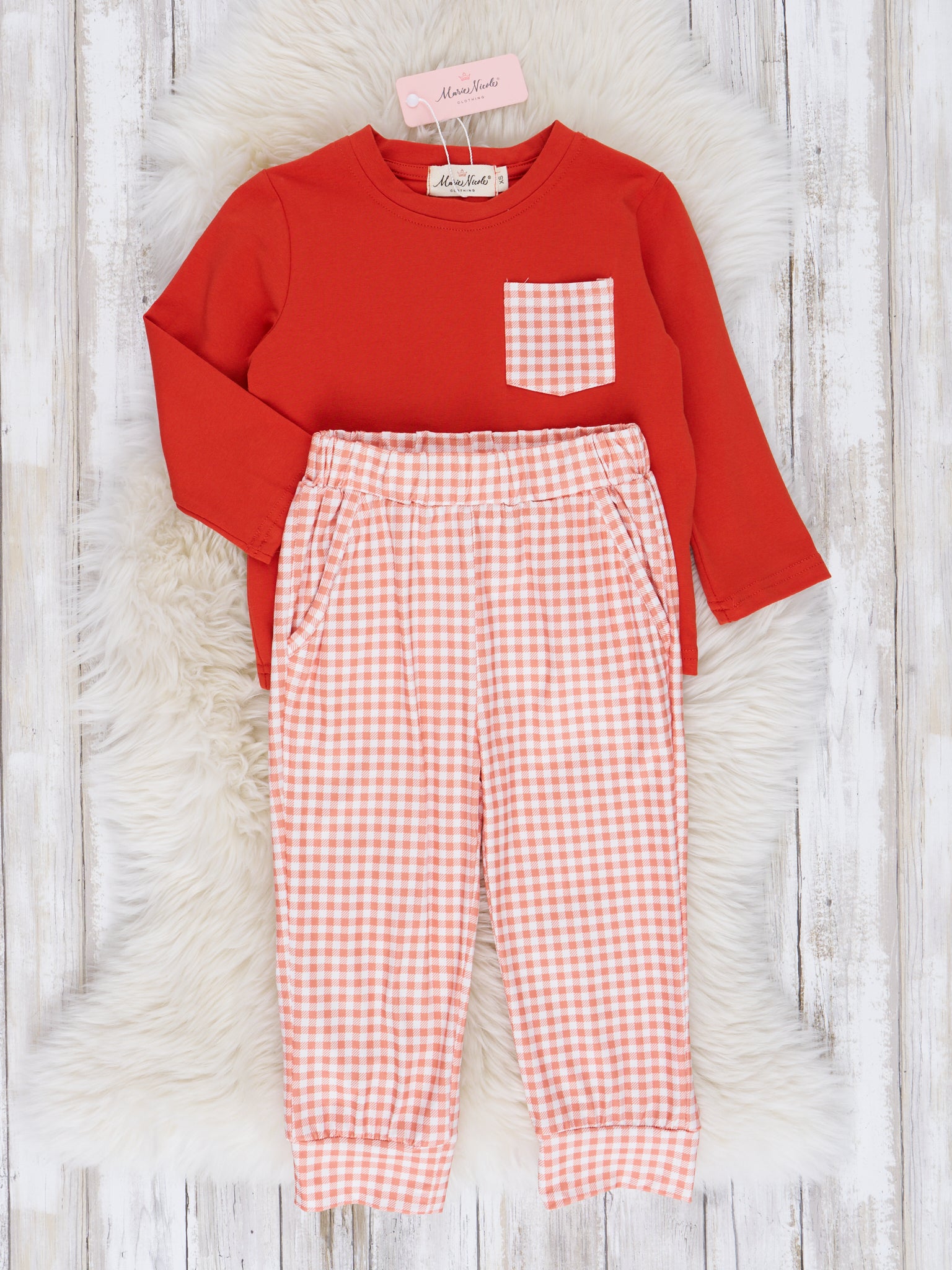 Little ones will fall in love with this playful sibling set! This orange and peach gingham outfit is a must-have for the cooler months. Comfort and style on the go for your little ones!