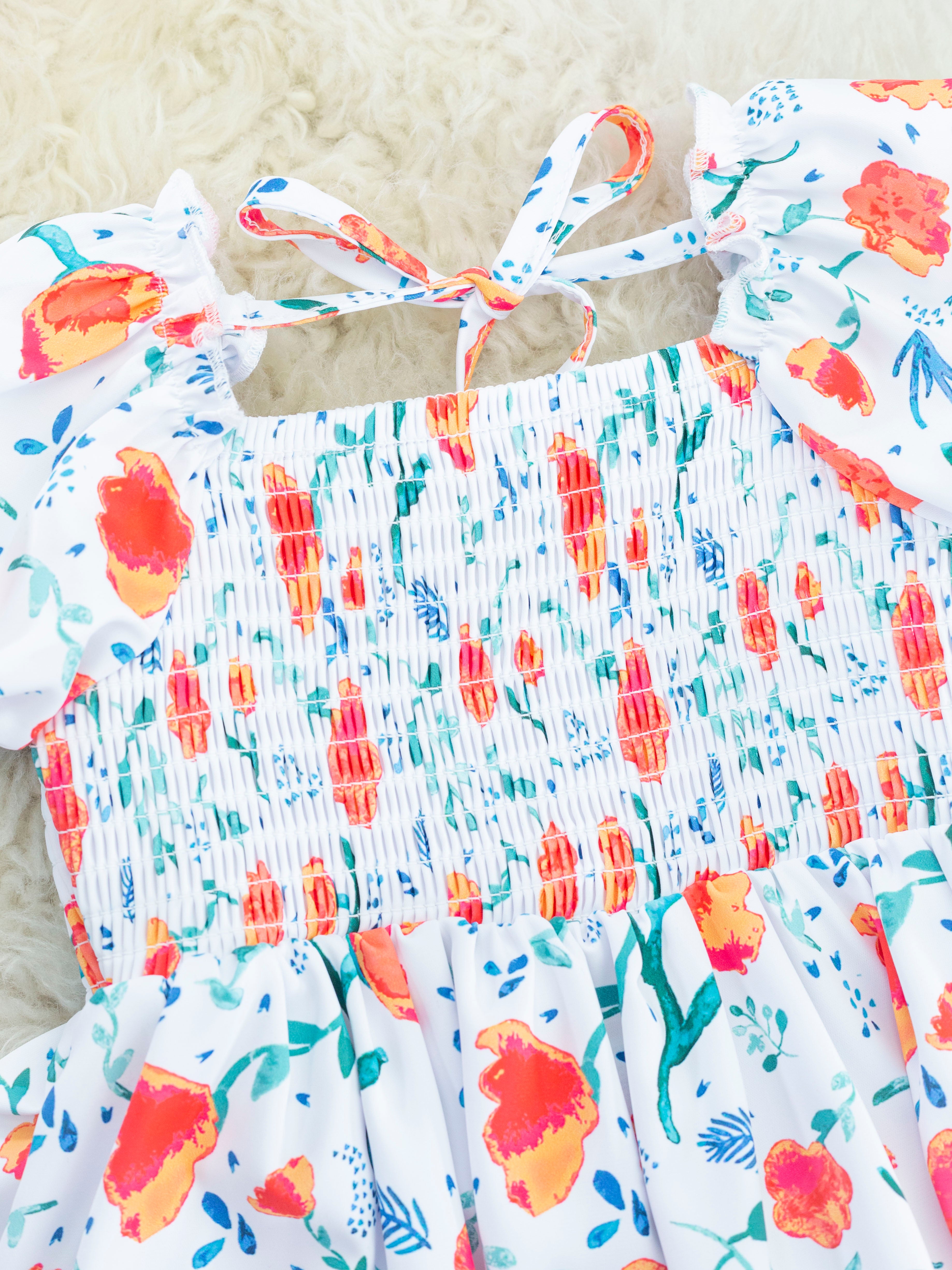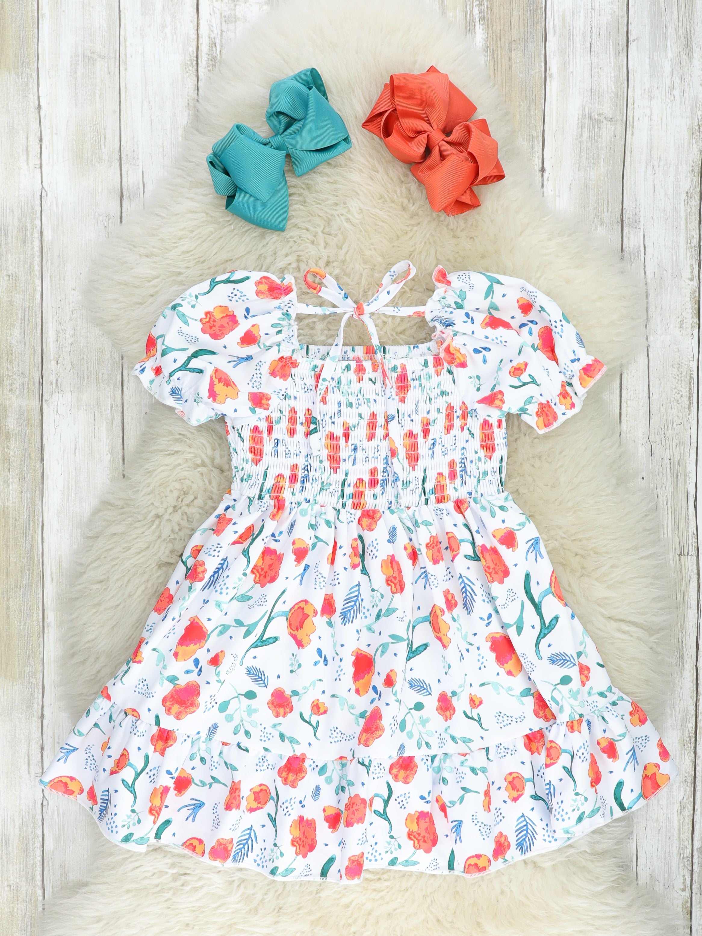 Let your little one give a sweet and playful style statement in this darling orange smocked floral puff sleeve dress. Adorned with delicate ruffles and tie detail at the nape of the neck, it's sure to be a show-stopper! Perfect for your fashionable mini-me!