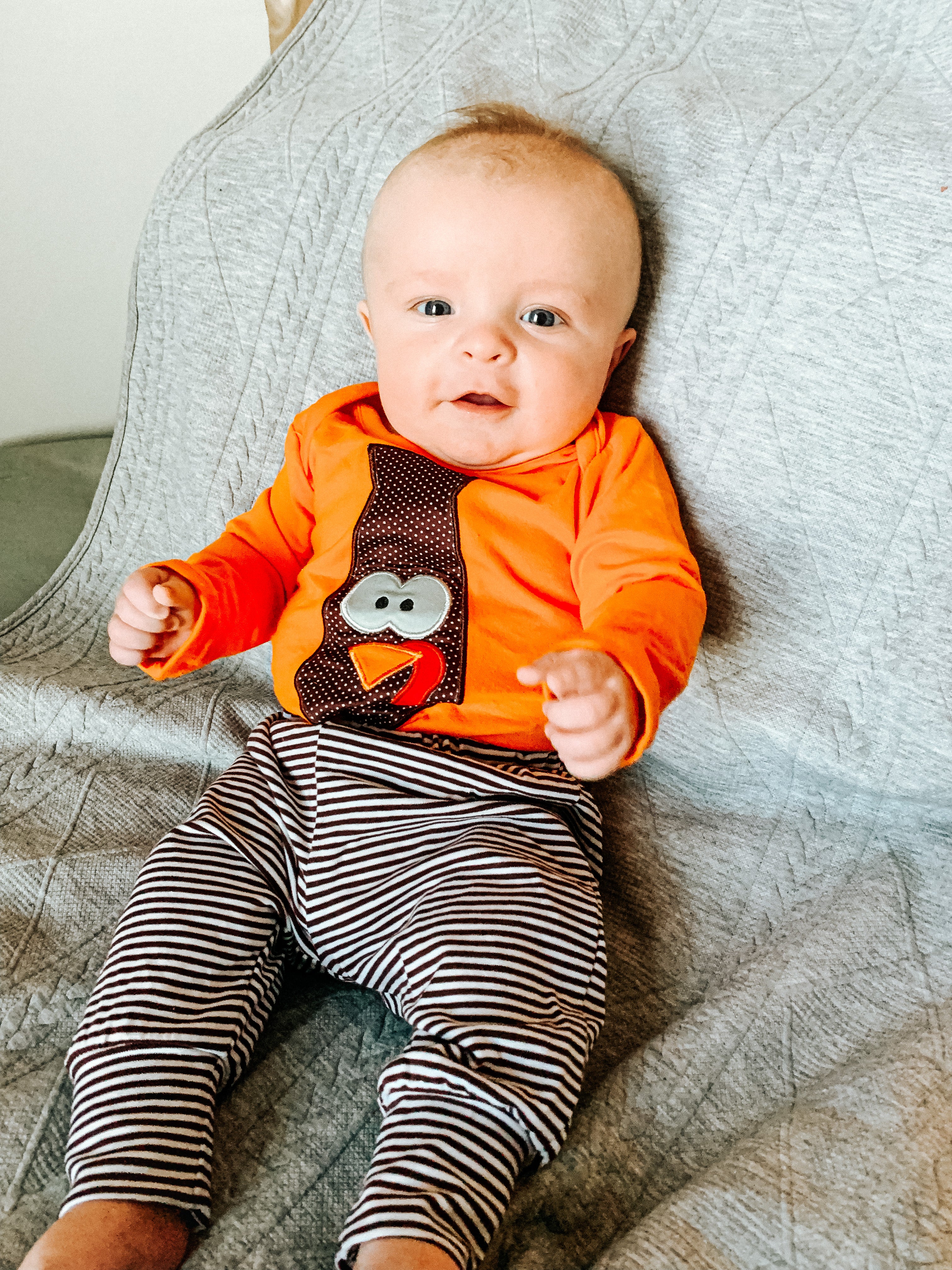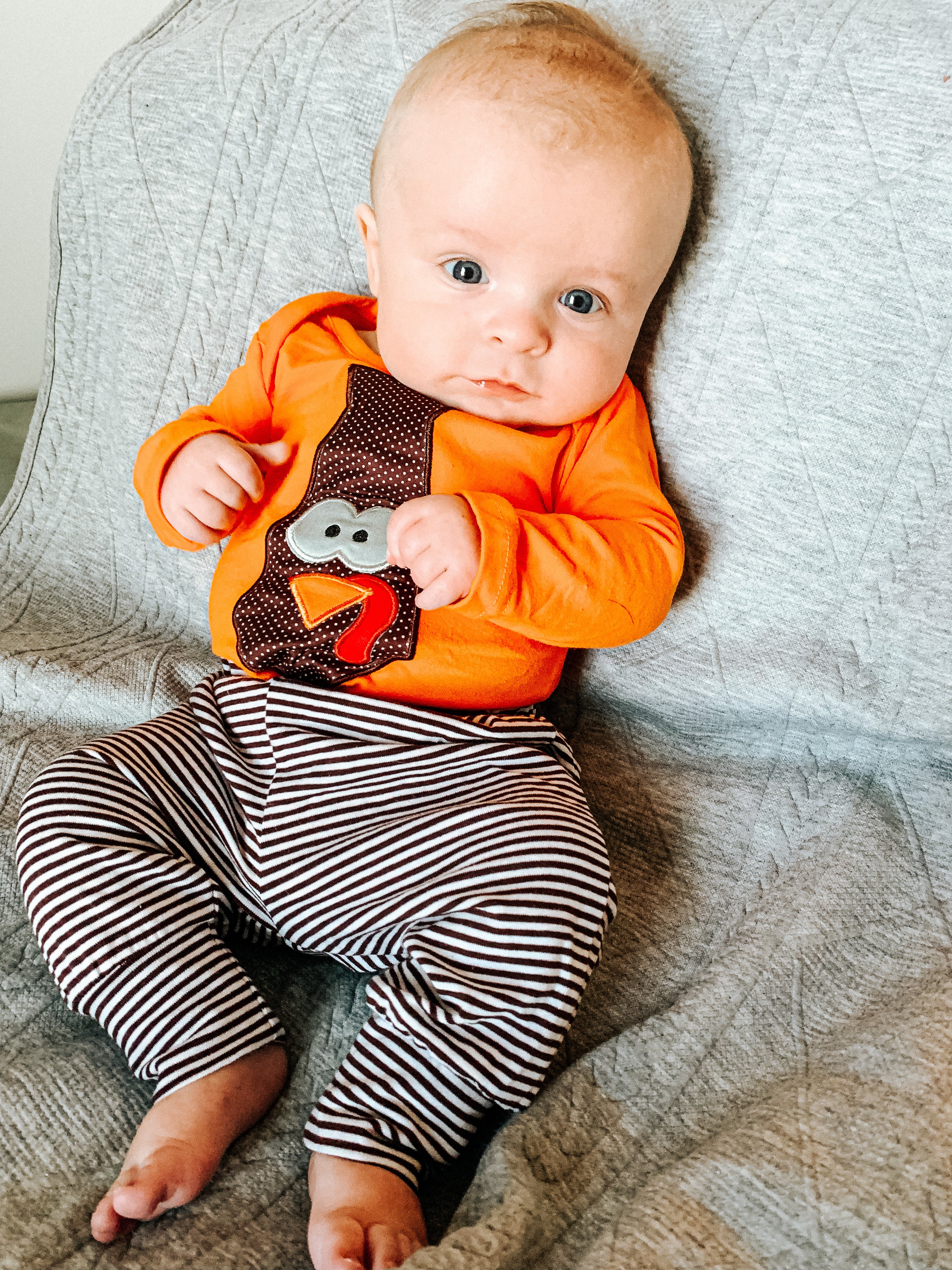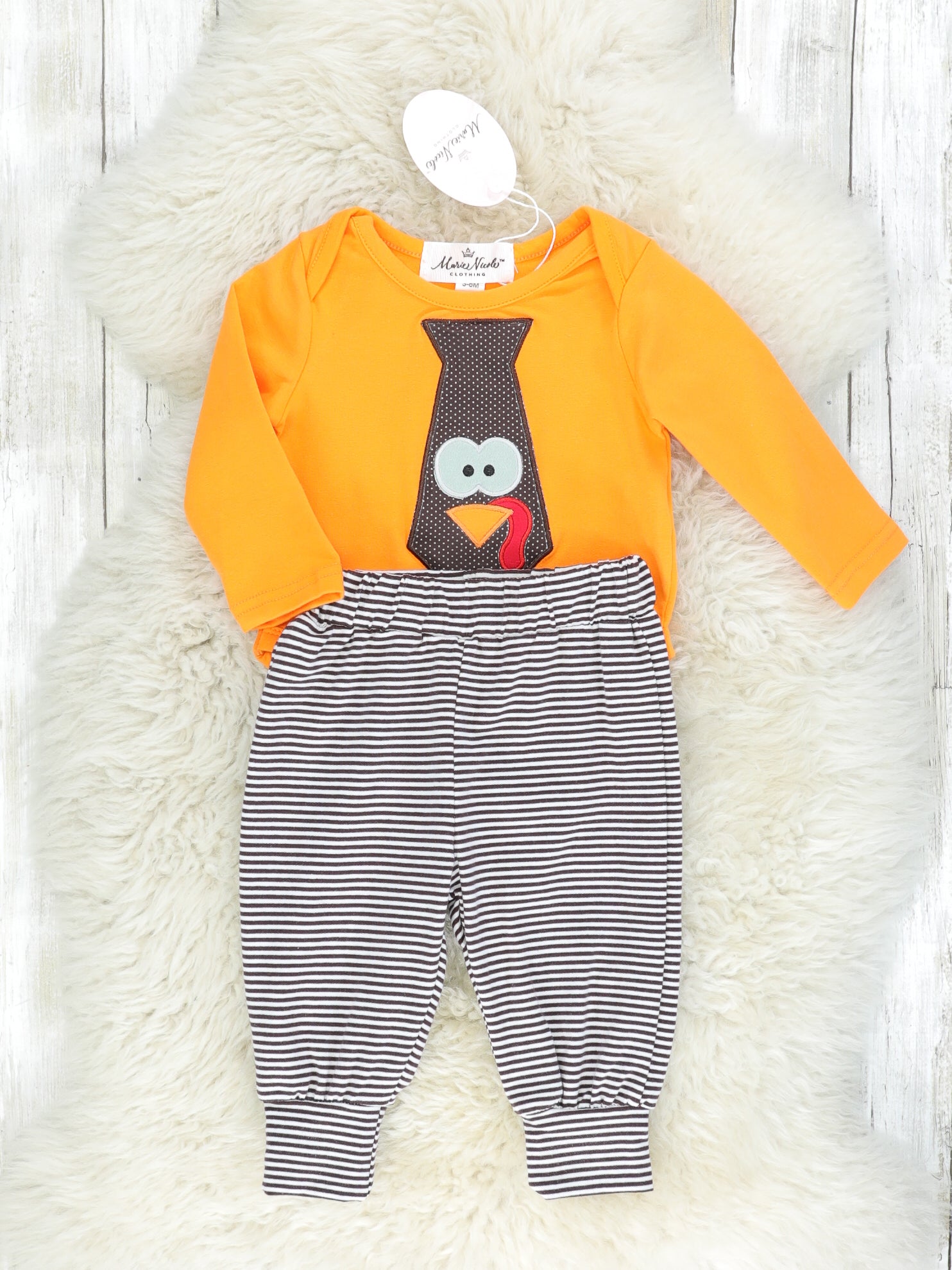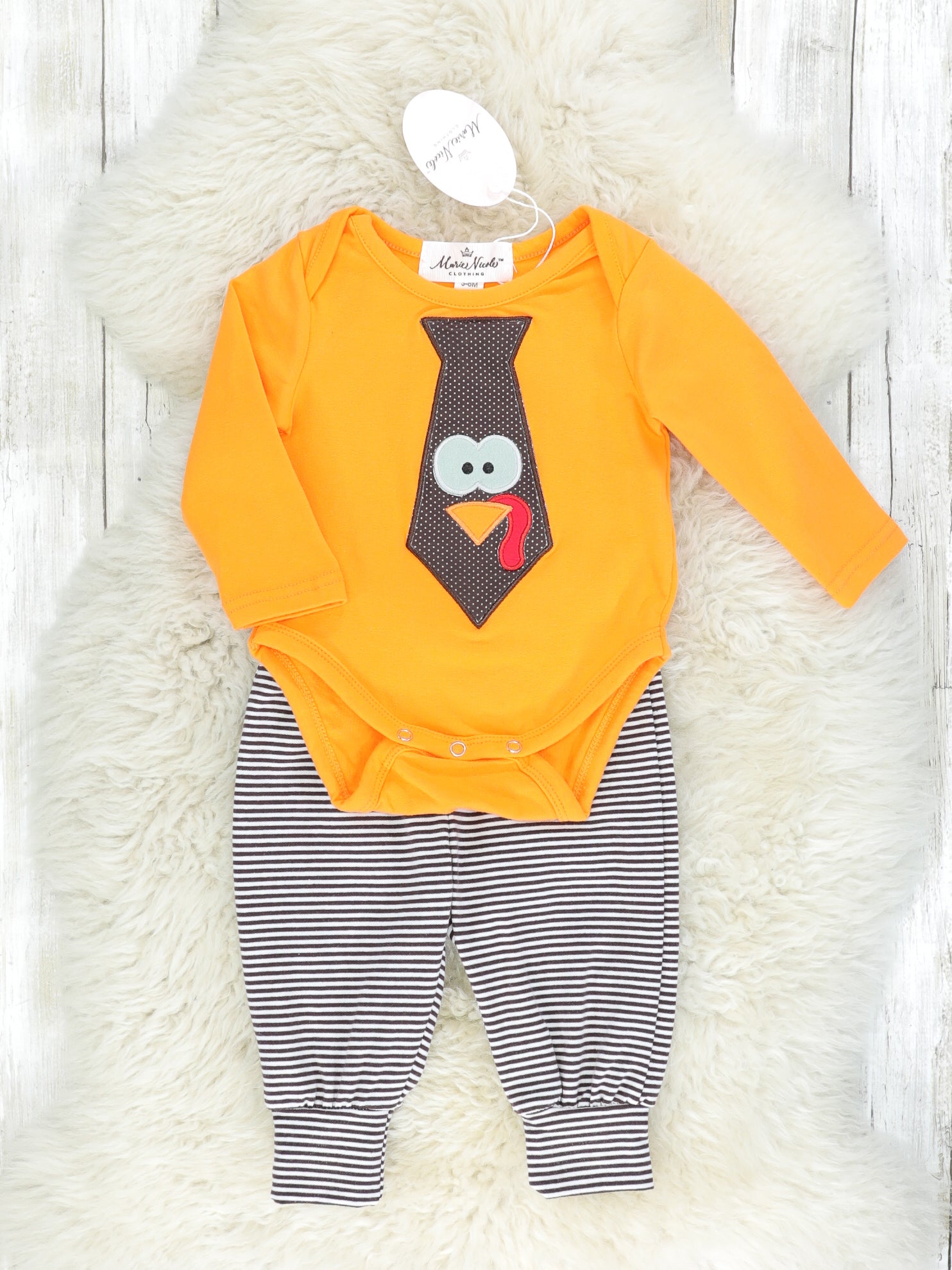 This adorable brother set is the tur-key to our hearts! This orange romper features a turkey tie appliqué & the striped joggers provide full coverage for this holiday season!