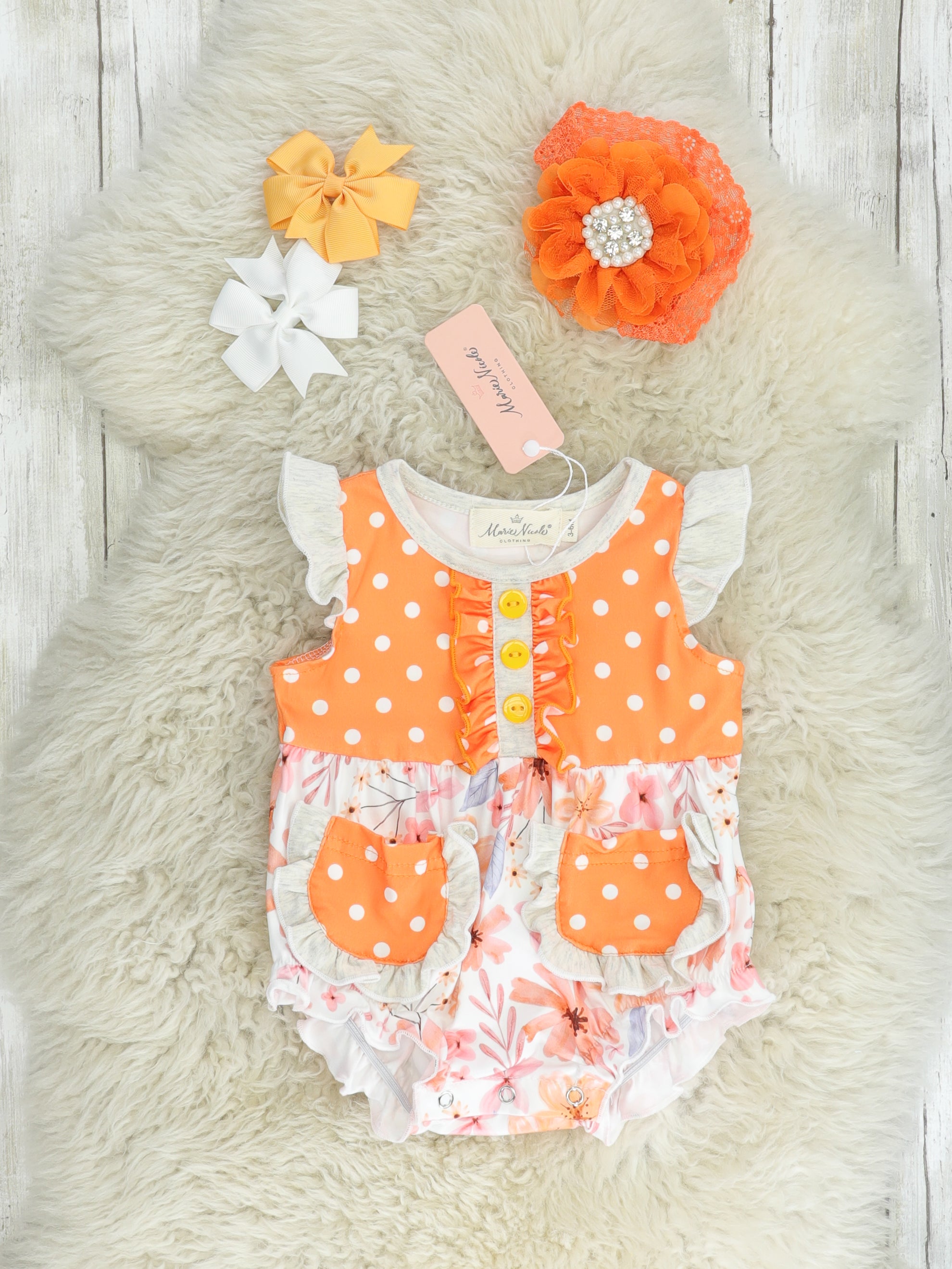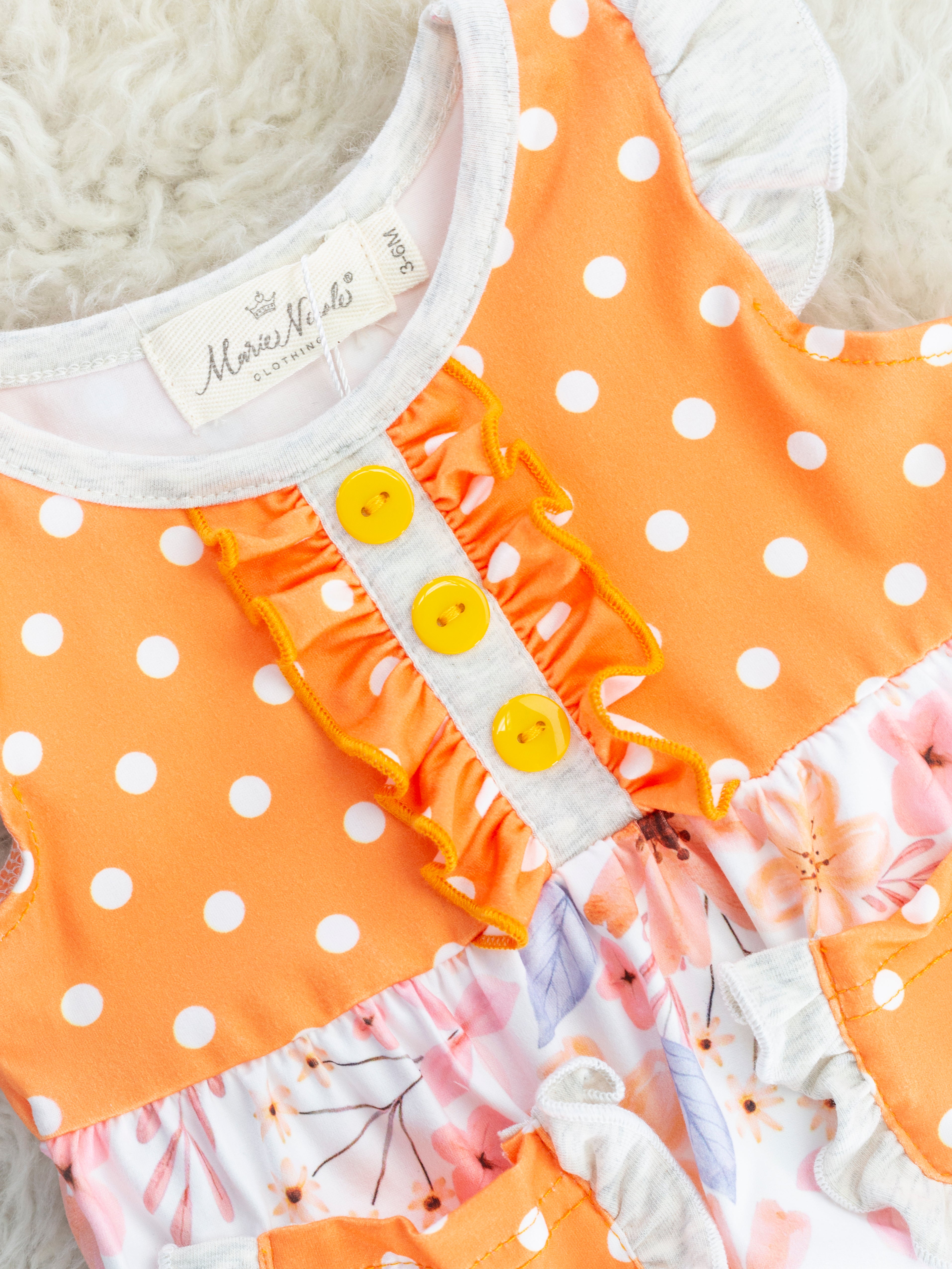 A vibrant sister set for your darling daisies! This bubble features polka dots, pockets, flutter sleeves, decorative buttons, & dainty daisies.