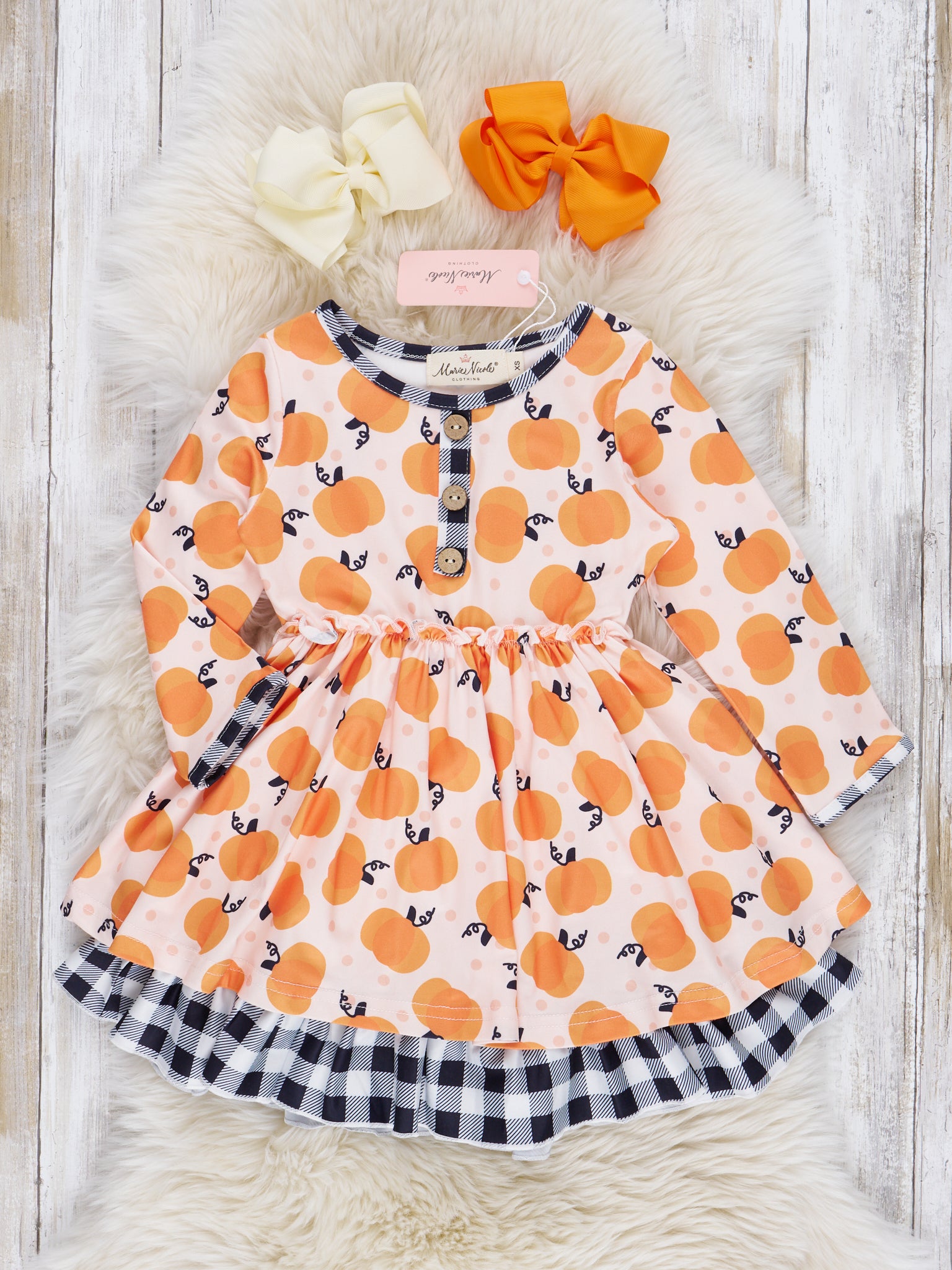 Orange Watercolor Pumpkins Gingham Ruffle Dress