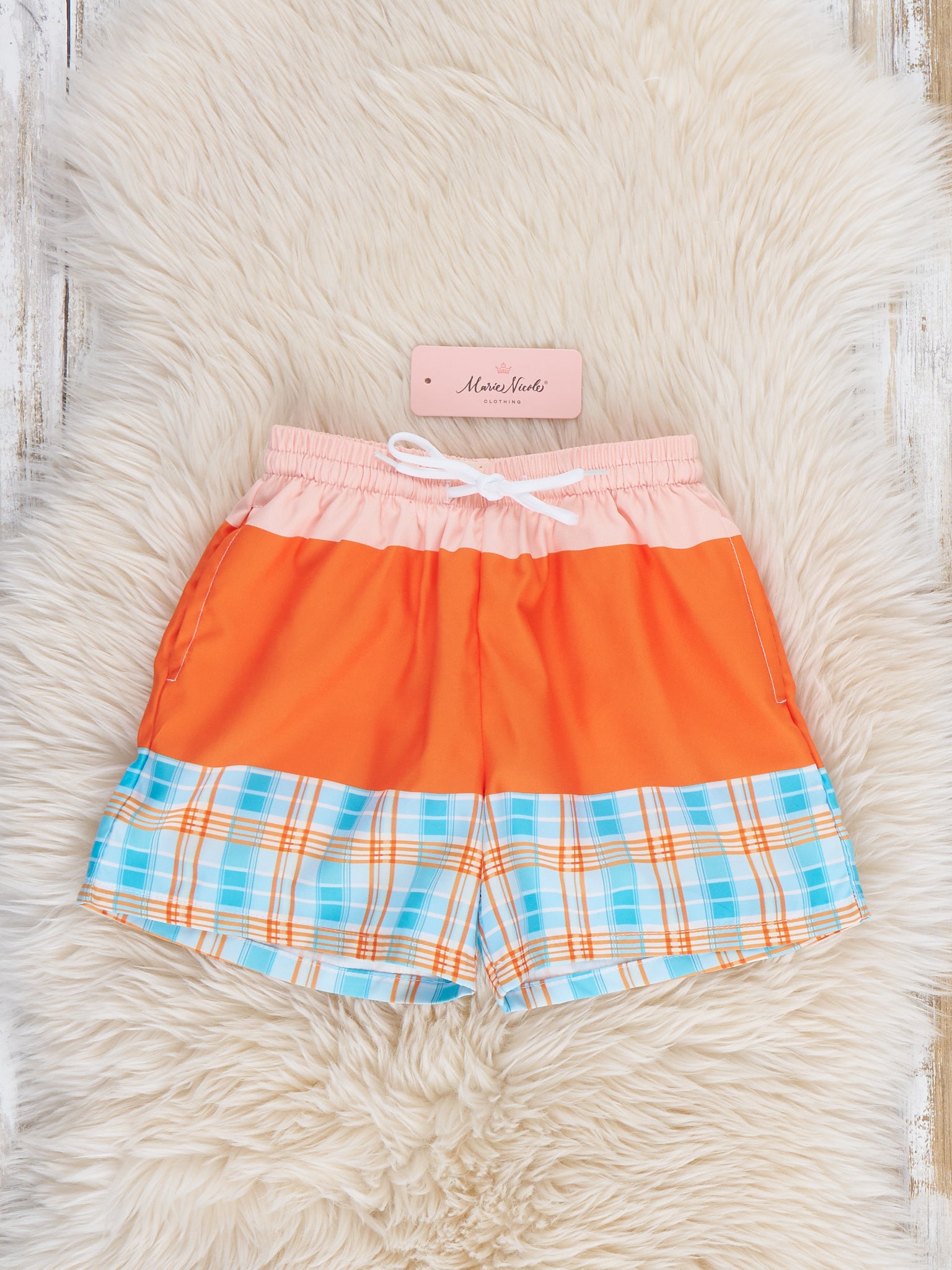 The Orchard Breeze Plaid Trunk – Boy From Marie Nicole is made for active summer fun. Designed with a comfortable waistband and lightweight feel, these swim trunks allow freedom of movement for swimming and play. Perfect for beach days, pool parties, and matching with dad for family swim moments.